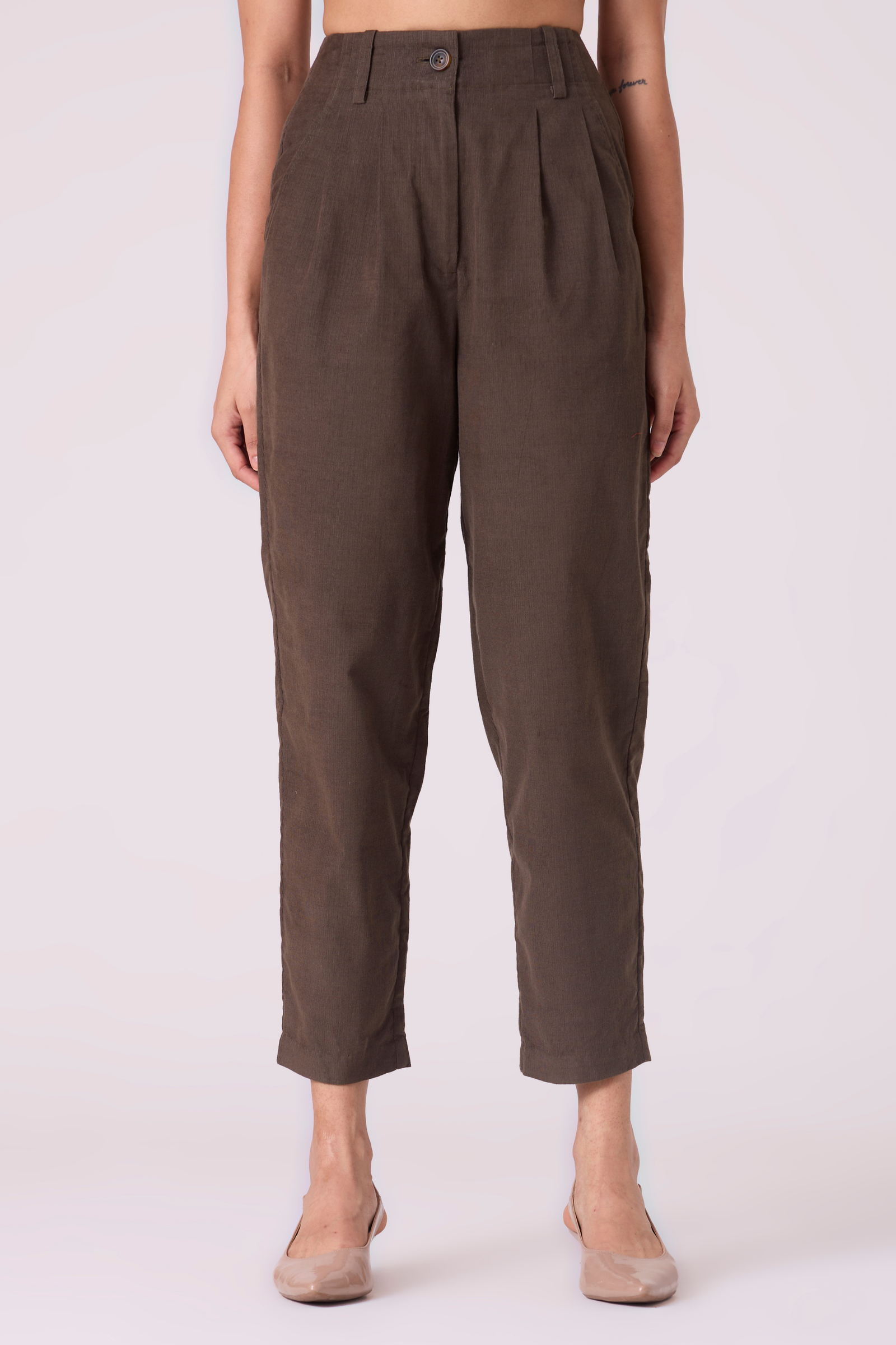 High-rise tapered trousers feature a clean, streamlined line, with double front pleats that add ease without compromising the sharpness of the silhouette—ideal for refined everyday dressing. Finished with a front zip and button closure for a polished look.