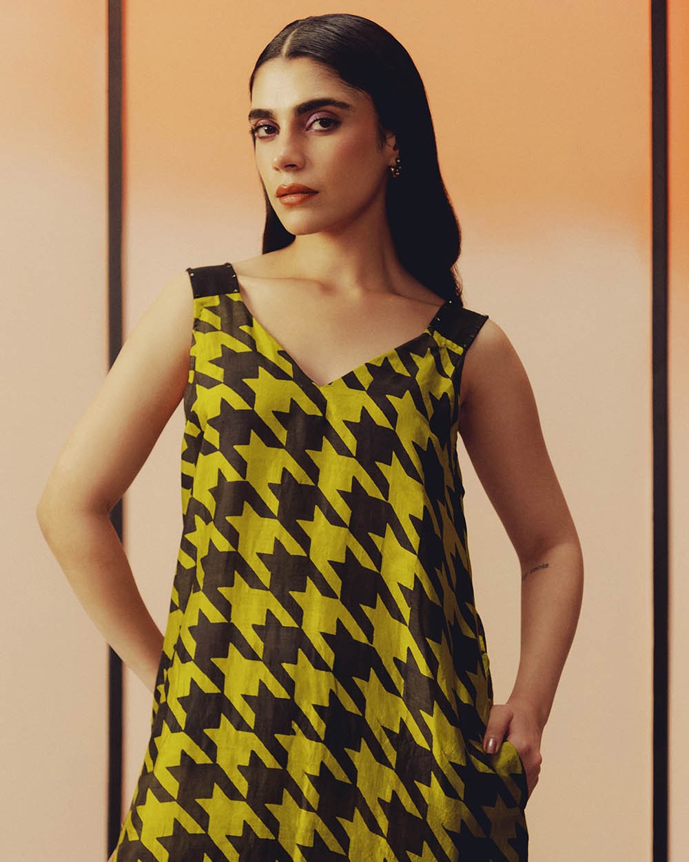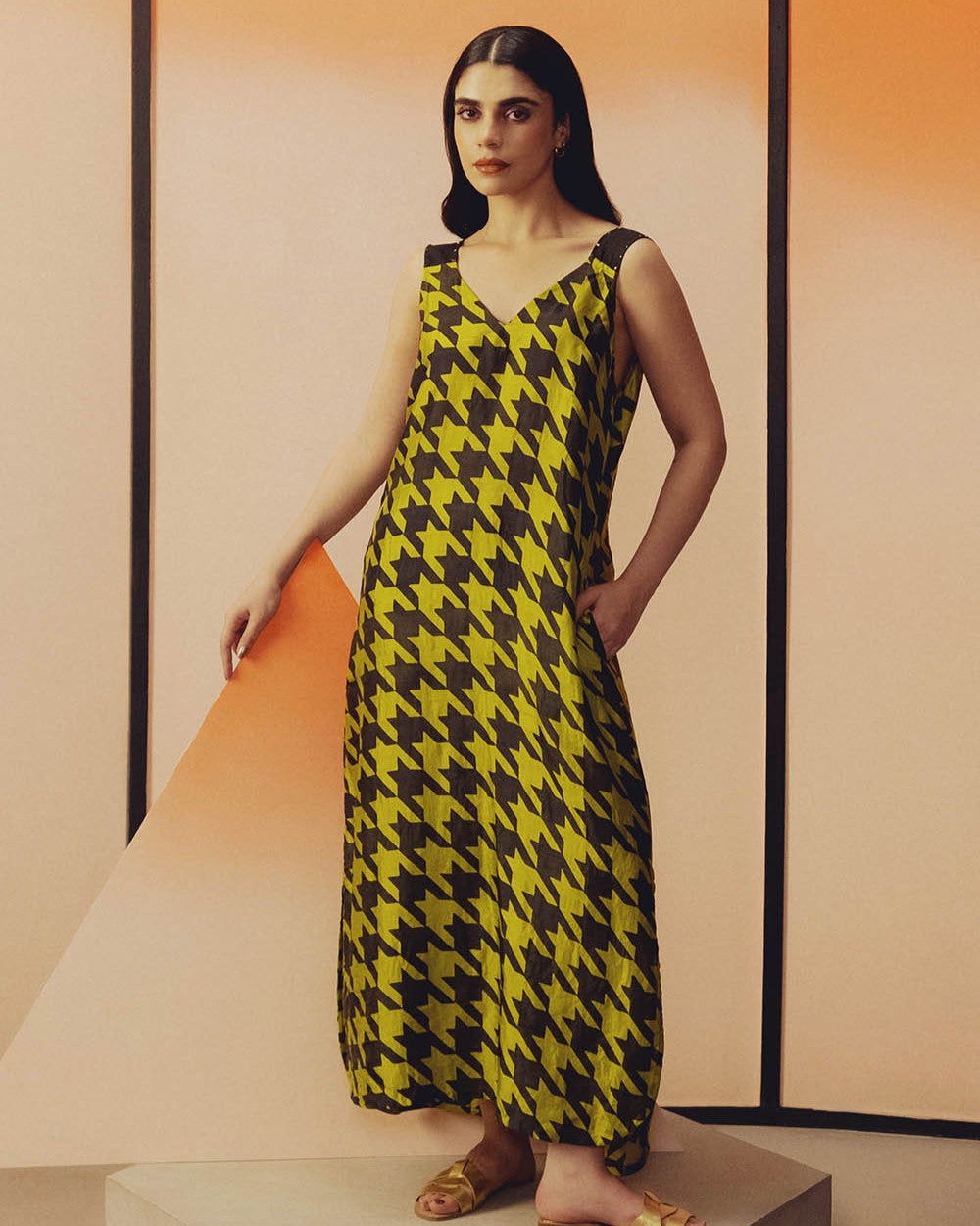 This handwoven mulberry silk slip dress features a hand-block print and subtle glass beadwork on the shoulder straps. Designed in a classic easy-fit, straight cut silhouette with pockets on both sides.
