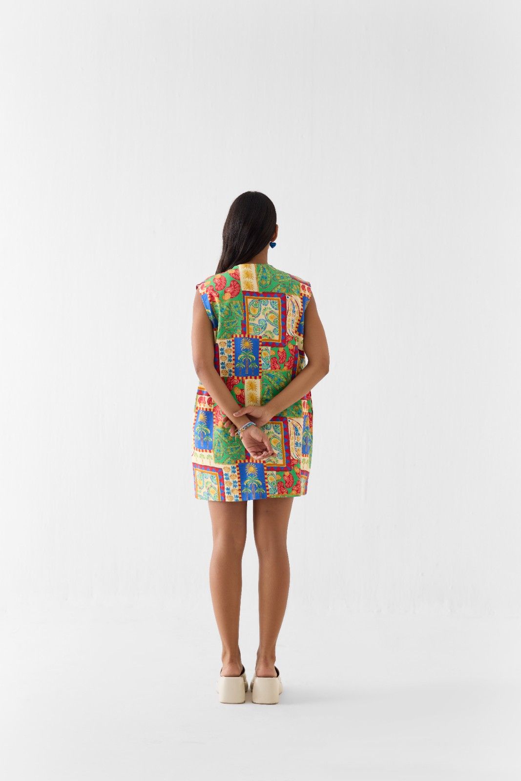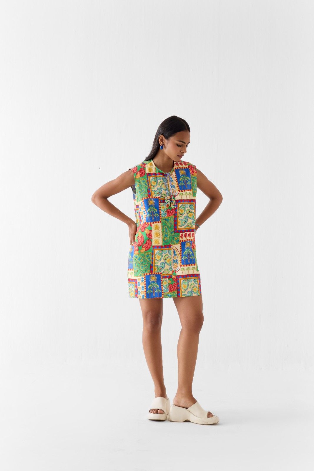 The Johari Short Dress is crafted from our stunning 100% cotton fabric and is a trans-seasonal statement piece, featuring a straight shift dress silhouette that is fully lined for comfort, a round neckline, delicate potli and shell button tassel detailing, side pockets, and a front zipper, made in our hand-drawn Johari patchwork print with all-over paisleys reflecting fine artisanal craftsmanship, perfect to style with strappy heels for an elegant look, while the model is wearing a size M.