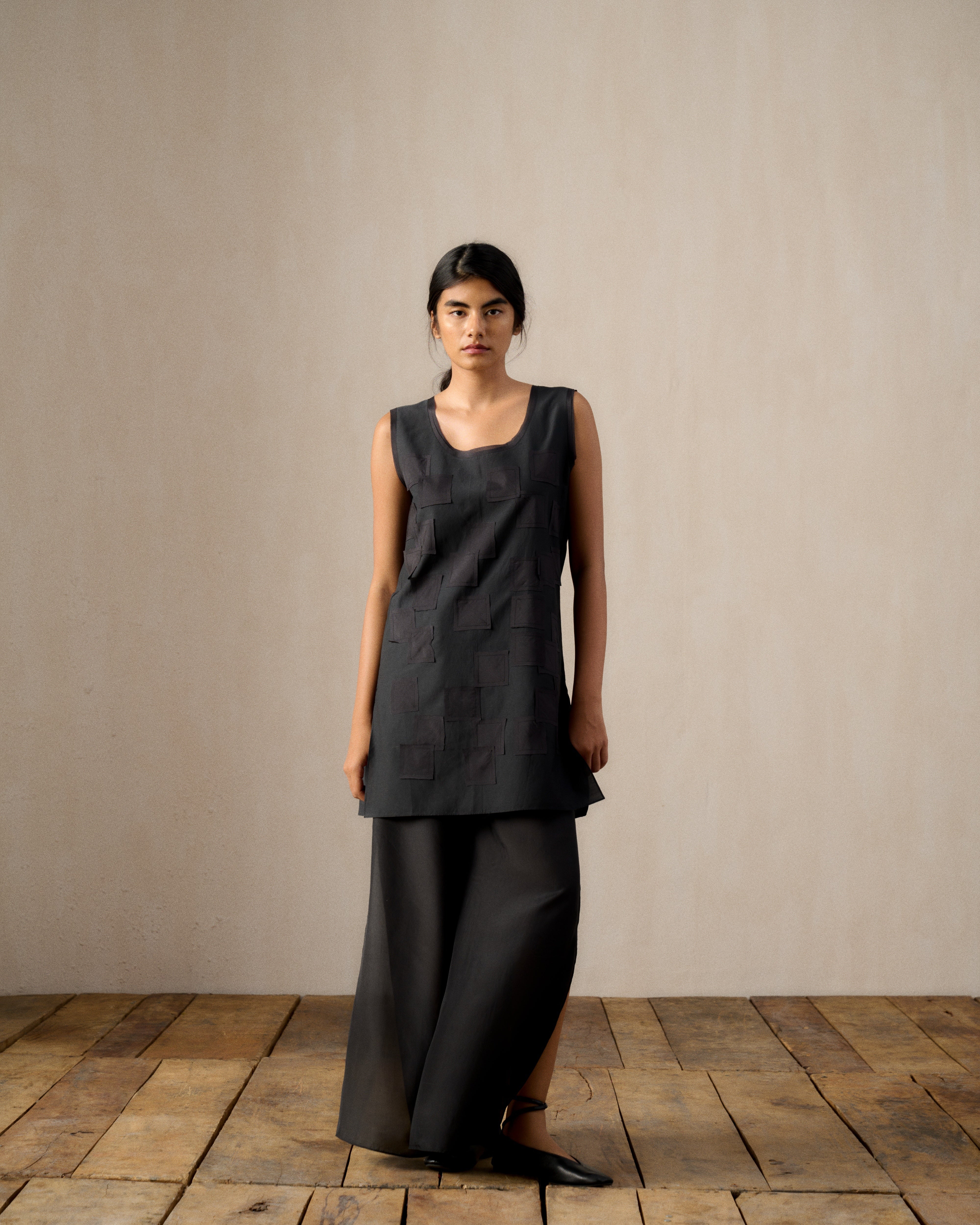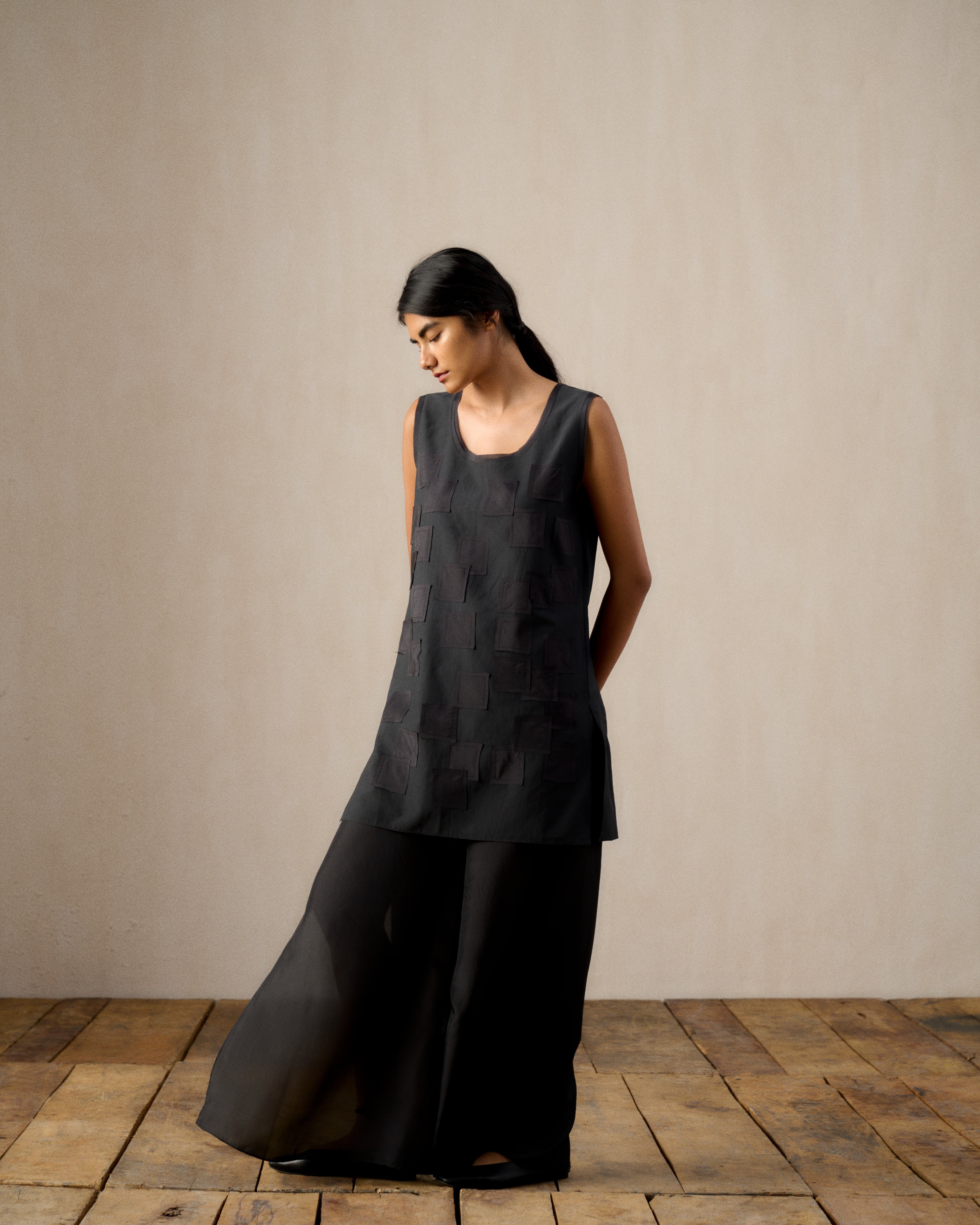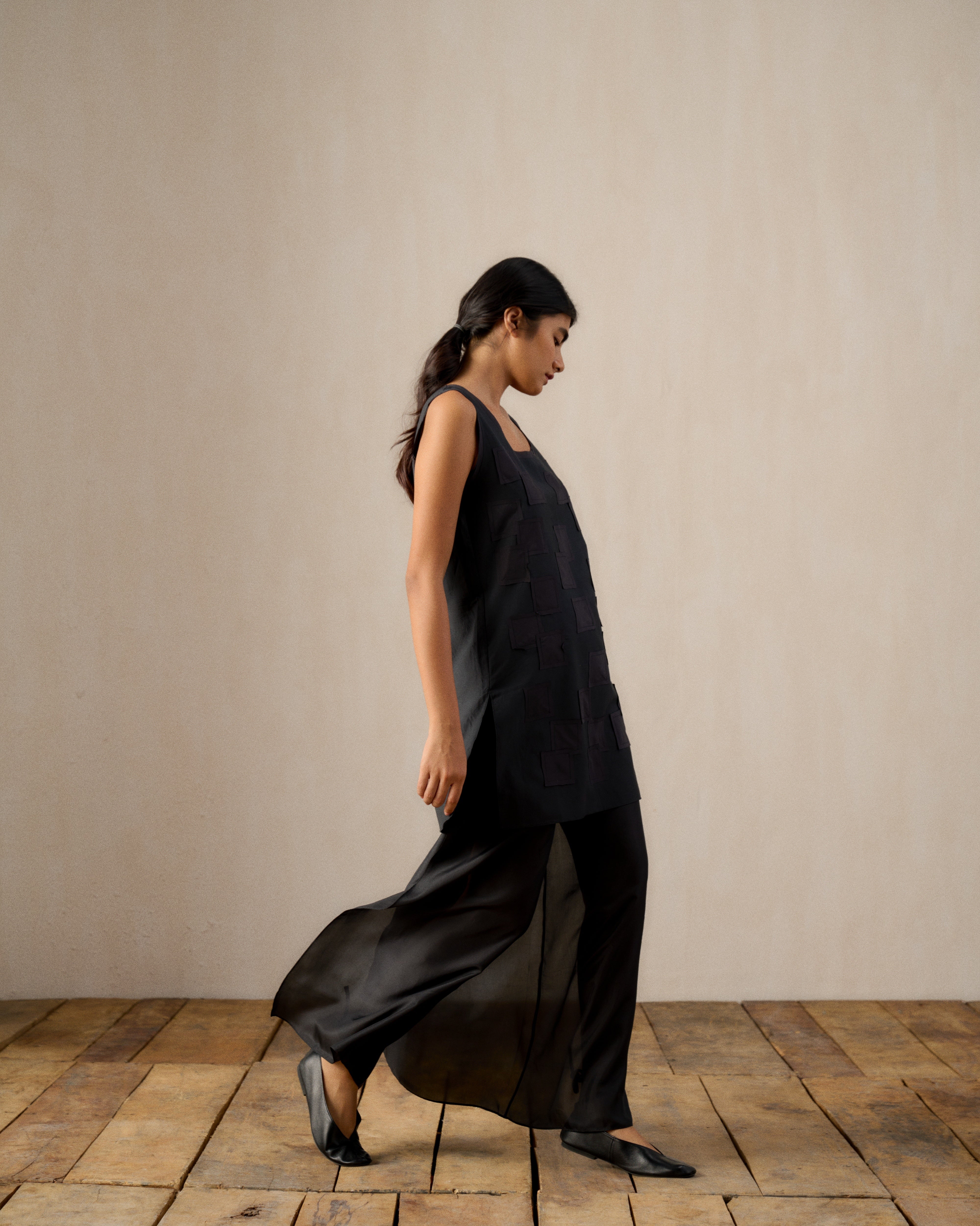Sensual minimalism in motion, featuring silk appliqué work on a cotton-silk tunic, paired with airy, drawstring pure silk pants and delicate appliqué, lending it an understated elegance that moves effortlessly from day to night.