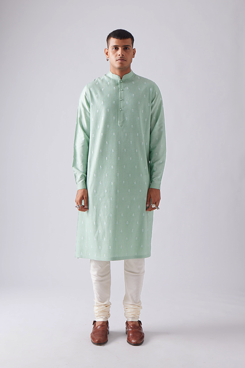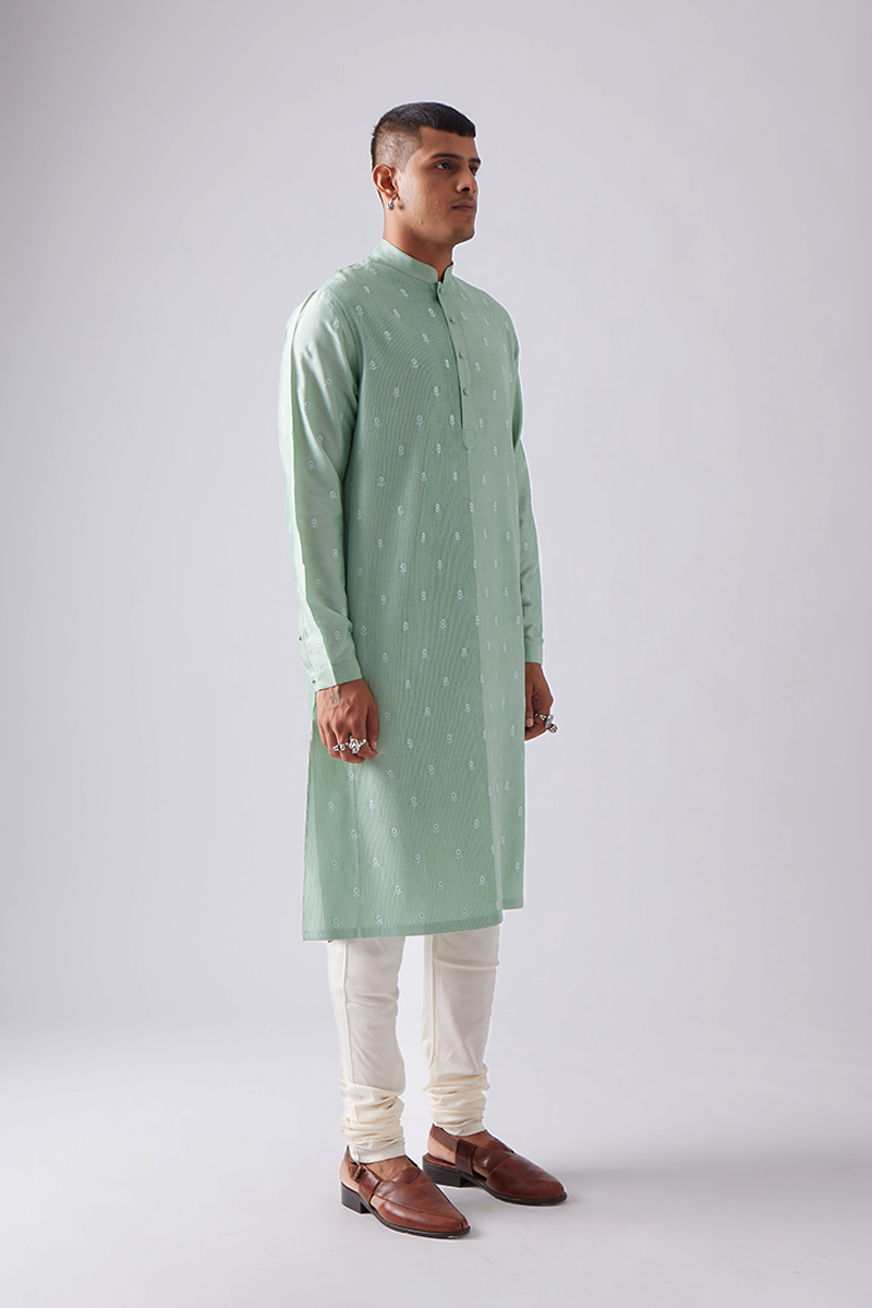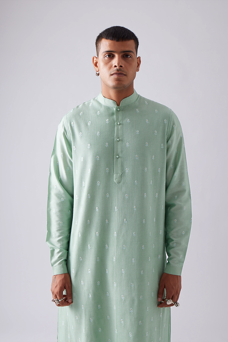 Our kurta set features fine front pintucks with delicate polka flower embroidery all over and comes paired with churidaar pants, a four-button placket, cuffed sleeves, and a band collar, finished with handmade matar (pea) buttons; the signature pintuck pleats are meticulously crafted by hand on single-needle machines, with subtle variations that enhance the beauty of its handmade quality.