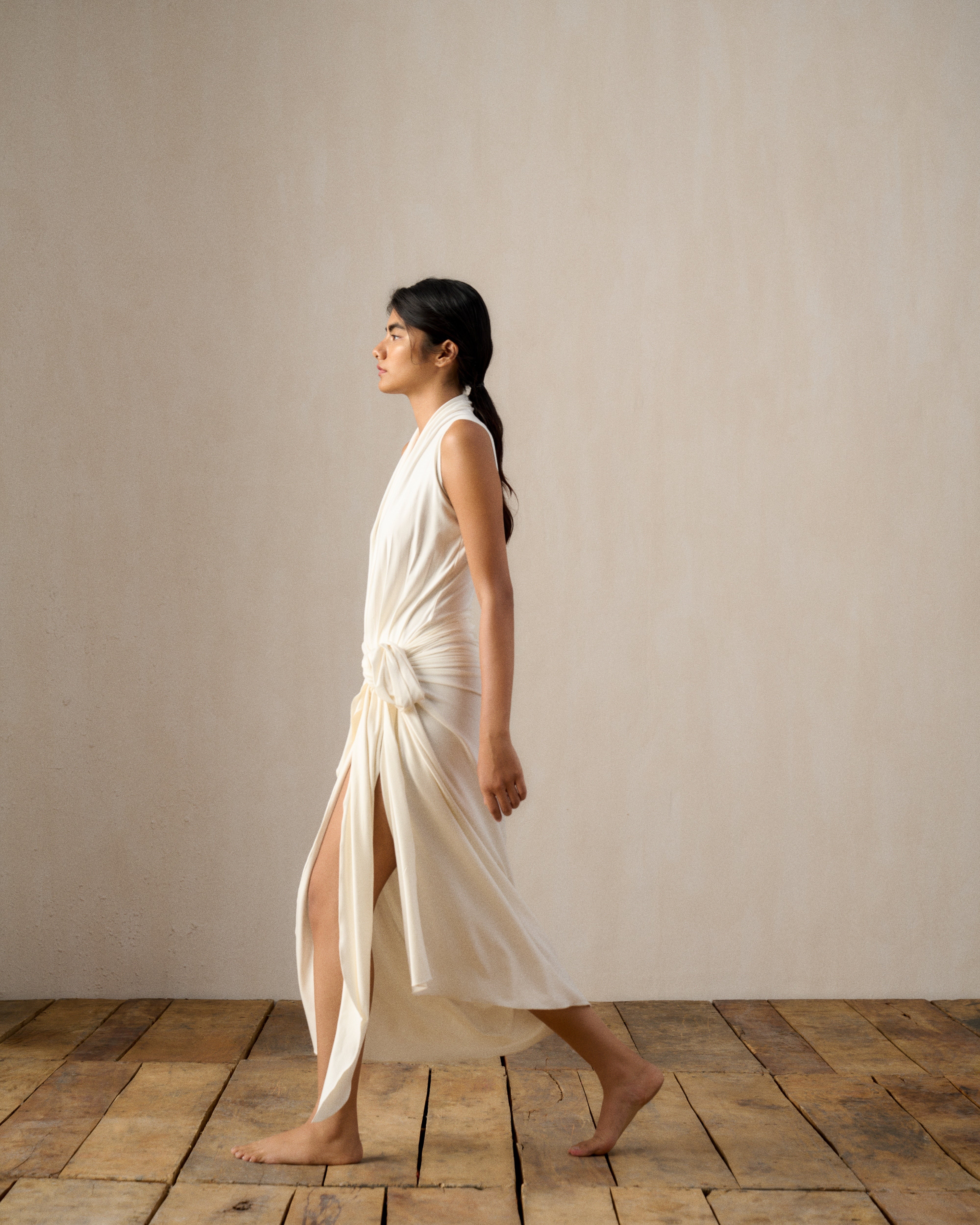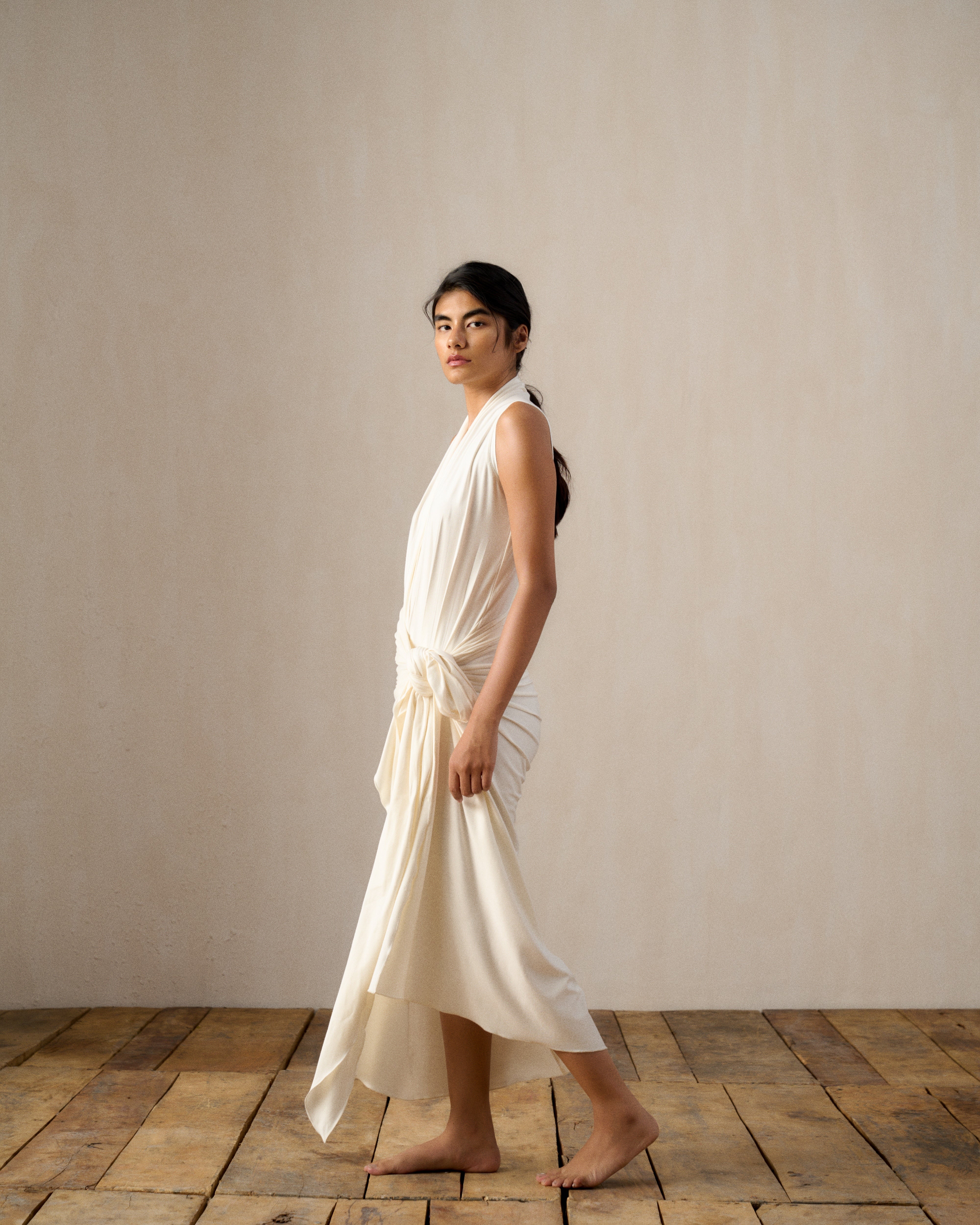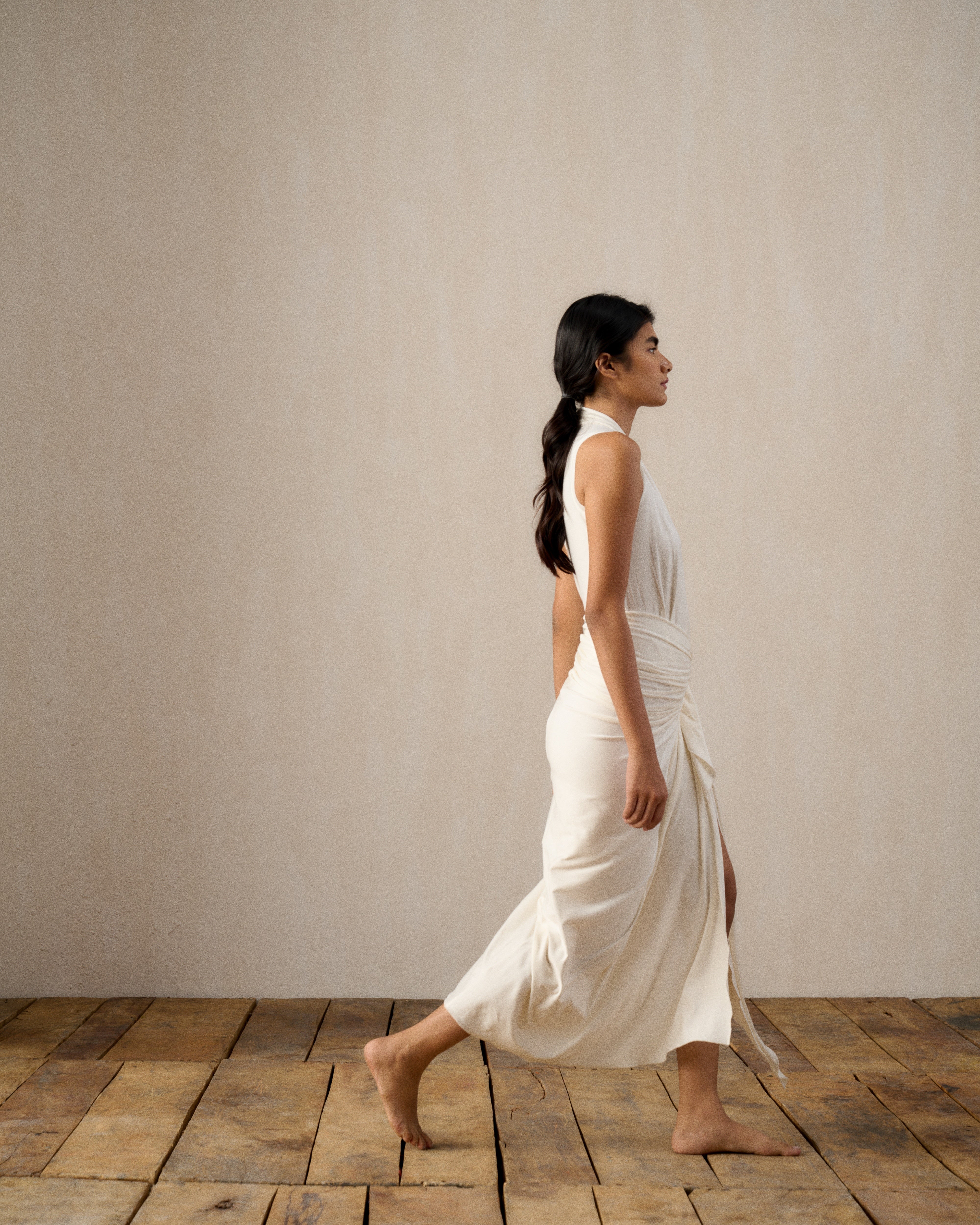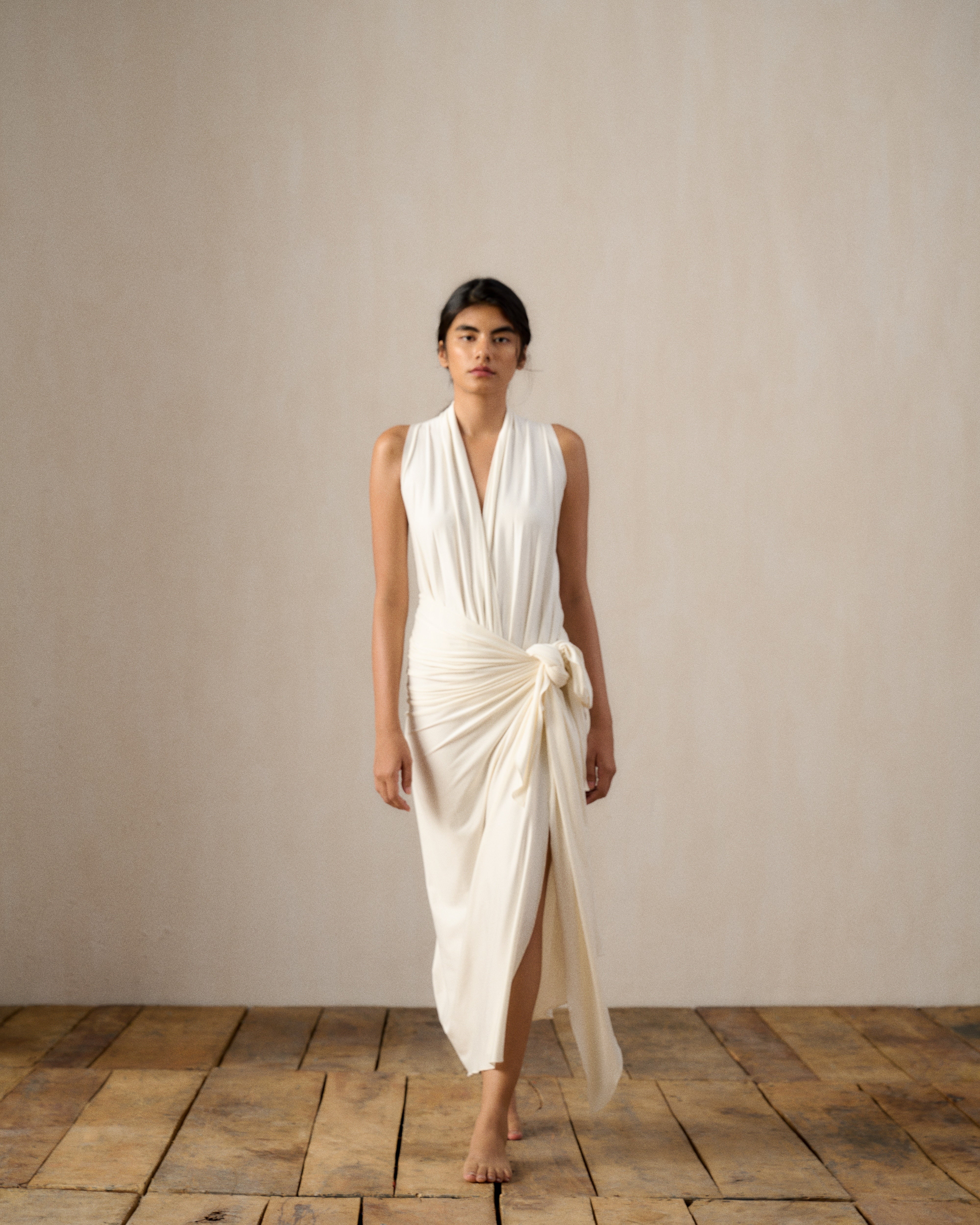 A sensual, sculpted silhouette that feels as effortless as it looks. This jersey set pairs a gathered cold-shoulder top with a built-in bodysuit and a flowing sarong skirt, made to flatter and move with you. Ideal for warm evenings or elevated resort dressing.