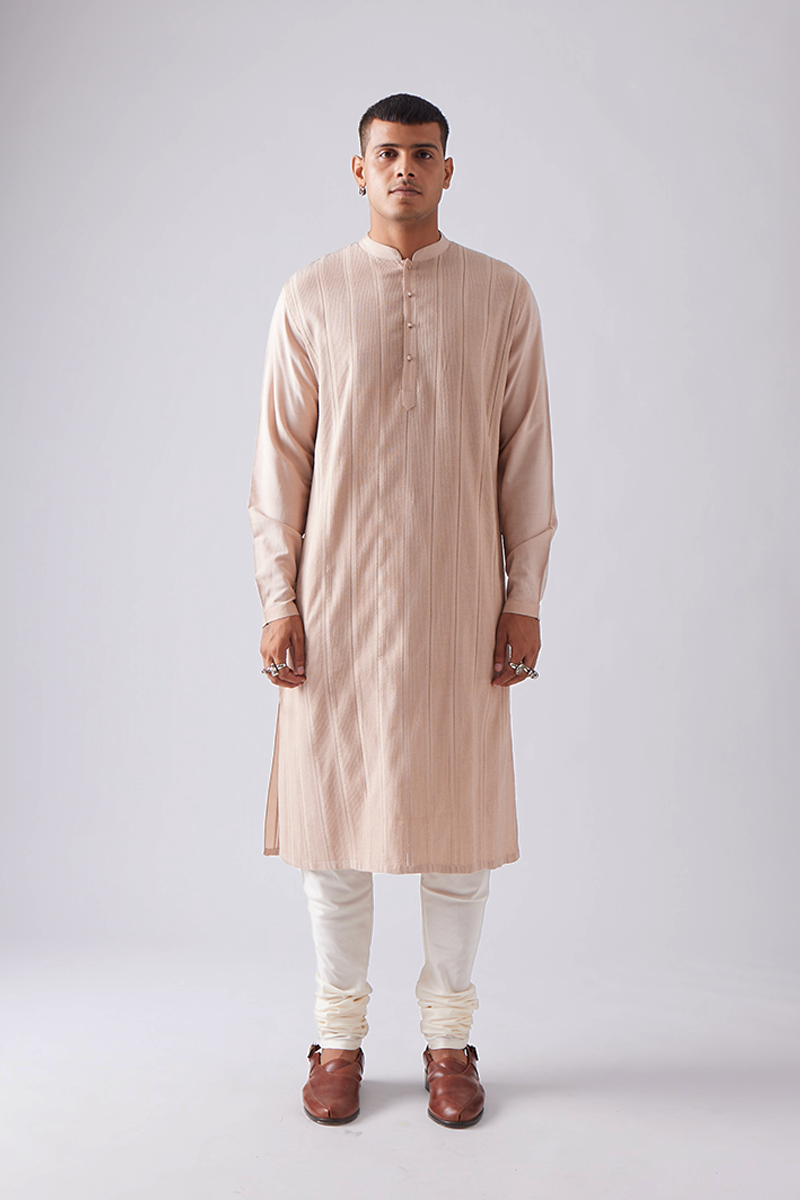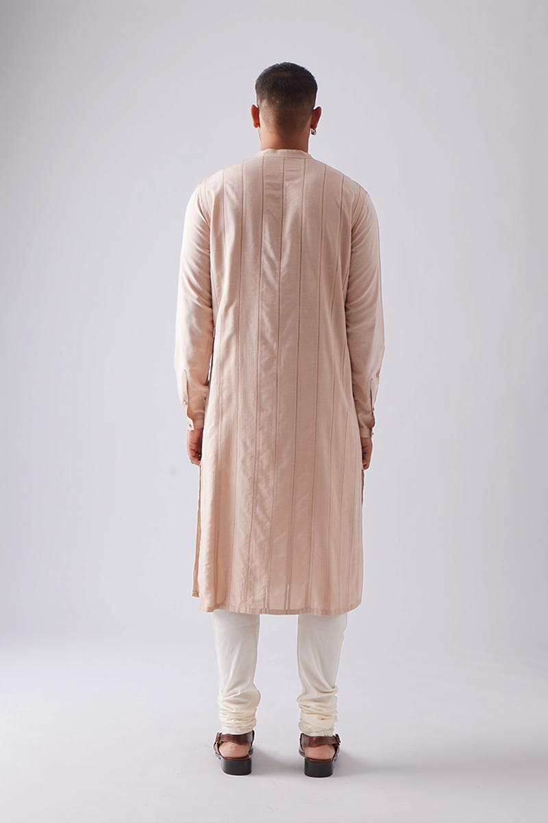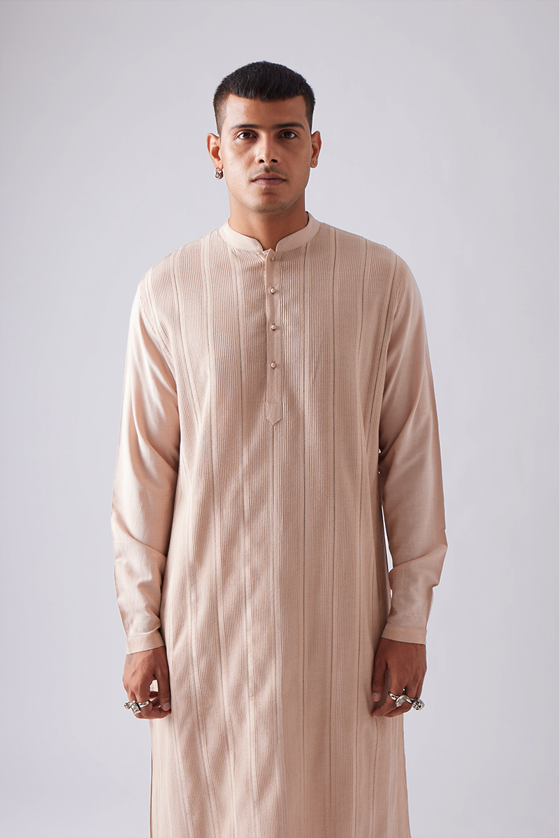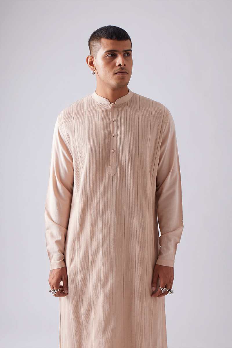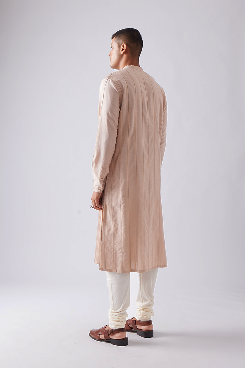 Our kurta features fine front pintucks with tonal ladder stitch detailing on both the front and back, paired with churidaar pants, a four-button placket, cuffed sleeves, and a band collar, and finished with handmade matar (pea) buttons—its signature pintuck pleats are meticulously crafted by hand on single-needle machines, with subtle variations that celebrate the beauty of handmade craftsmanship.