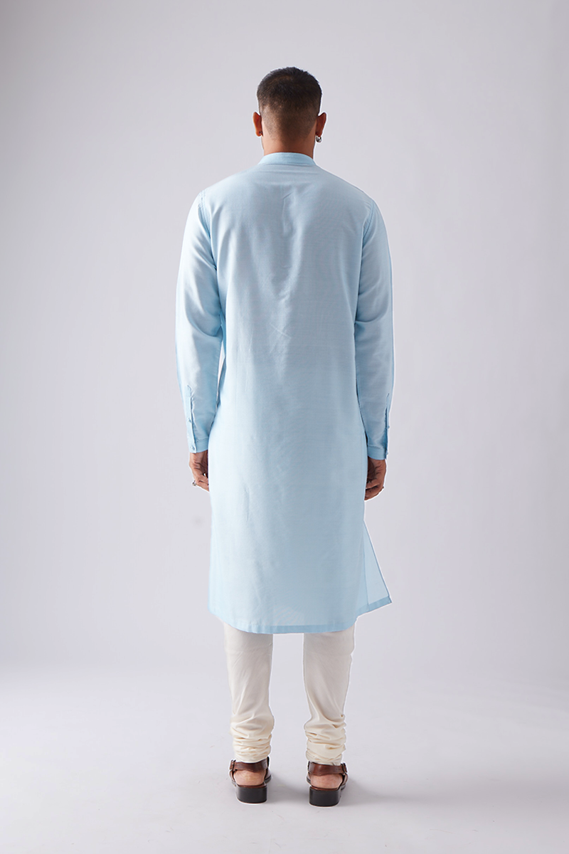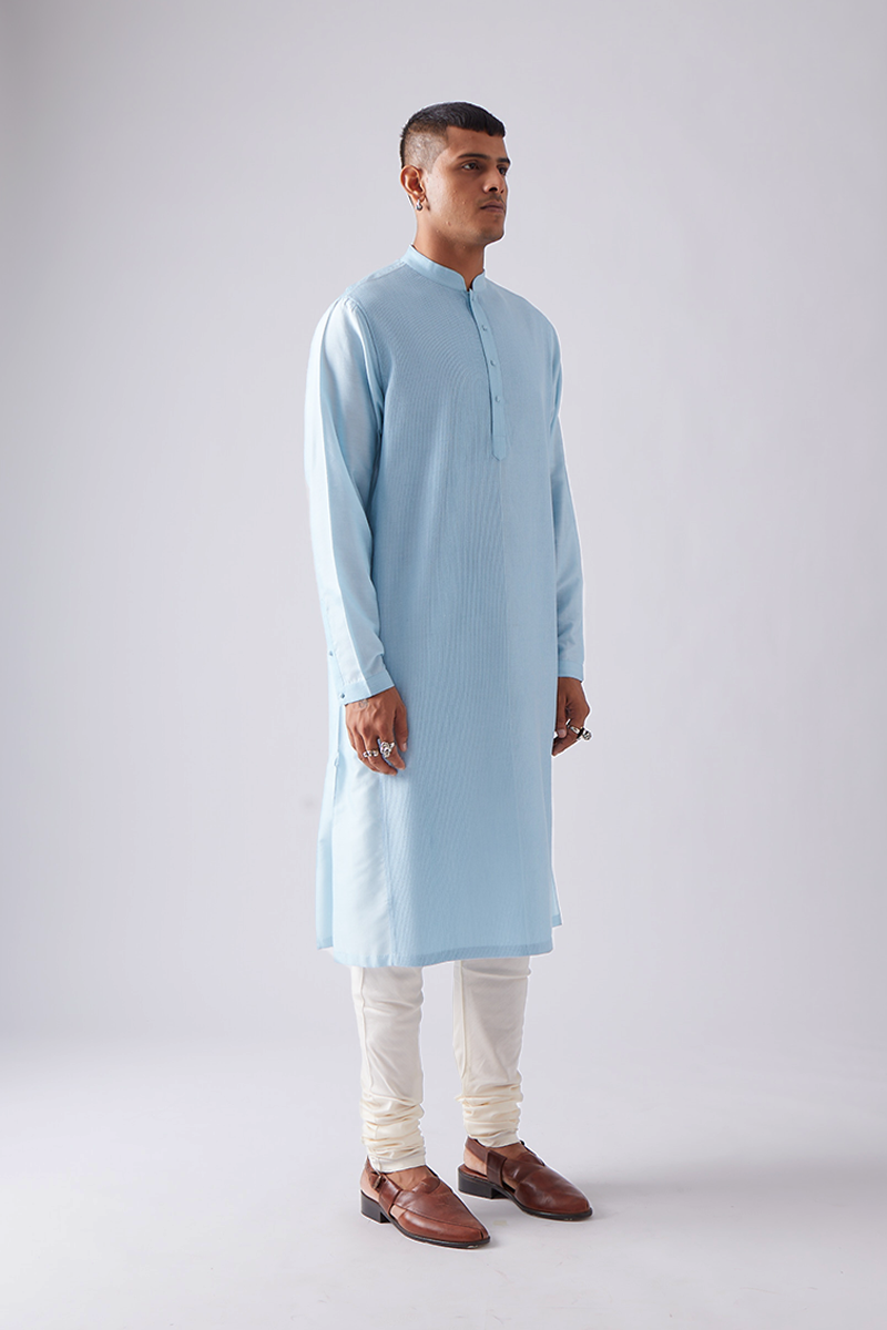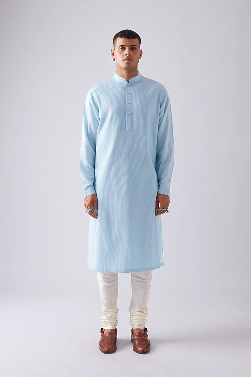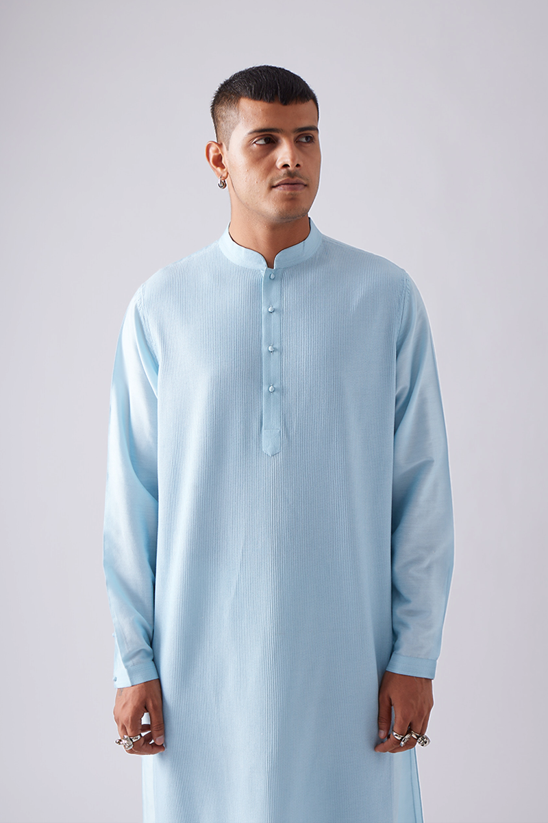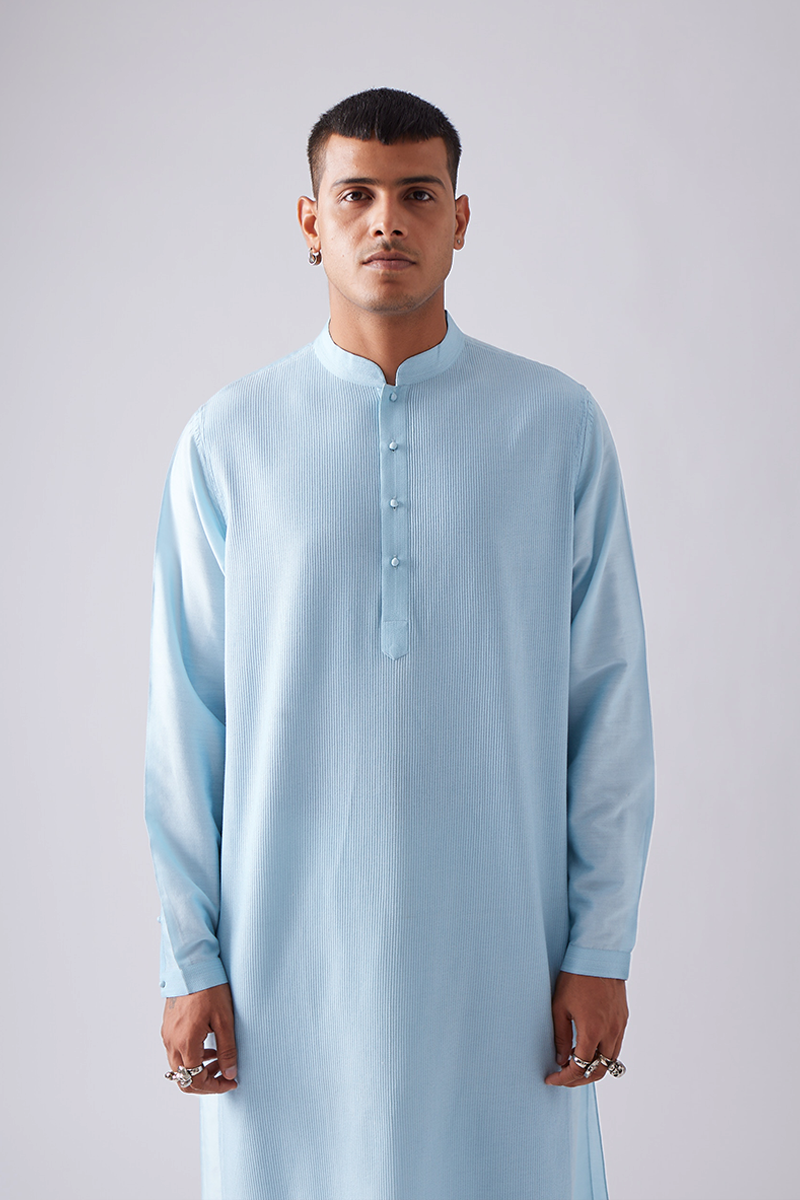 Our kurta features fine front pintucks detailed in tonal thread and comes paired with churidaar pants, a four-button placket, cuffed sleeves, and a band collar, finished with handmade matar (pea) buttons; the signature pintuck pleats are meticulously crafted by hand on single-needle machines, with subtle variations that enhance the beauty of its handmade quality.