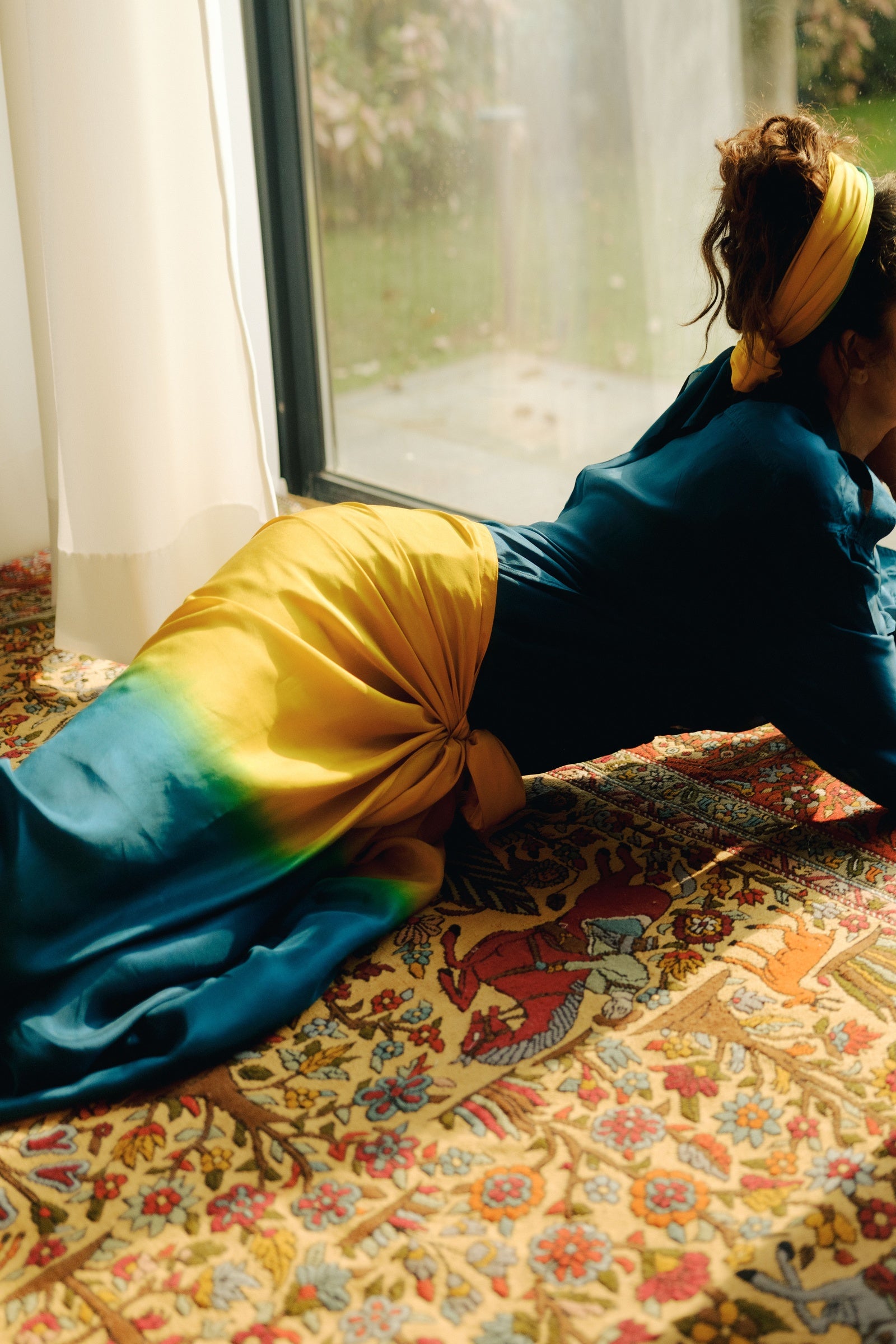A relaxed, fluid ensemble in soft silk with a luminous yellow-to-teal wash, offering easy, airy movement. Designed for unhurried days and sunlit transitions, it embodies effortless elegance and gentle flow.