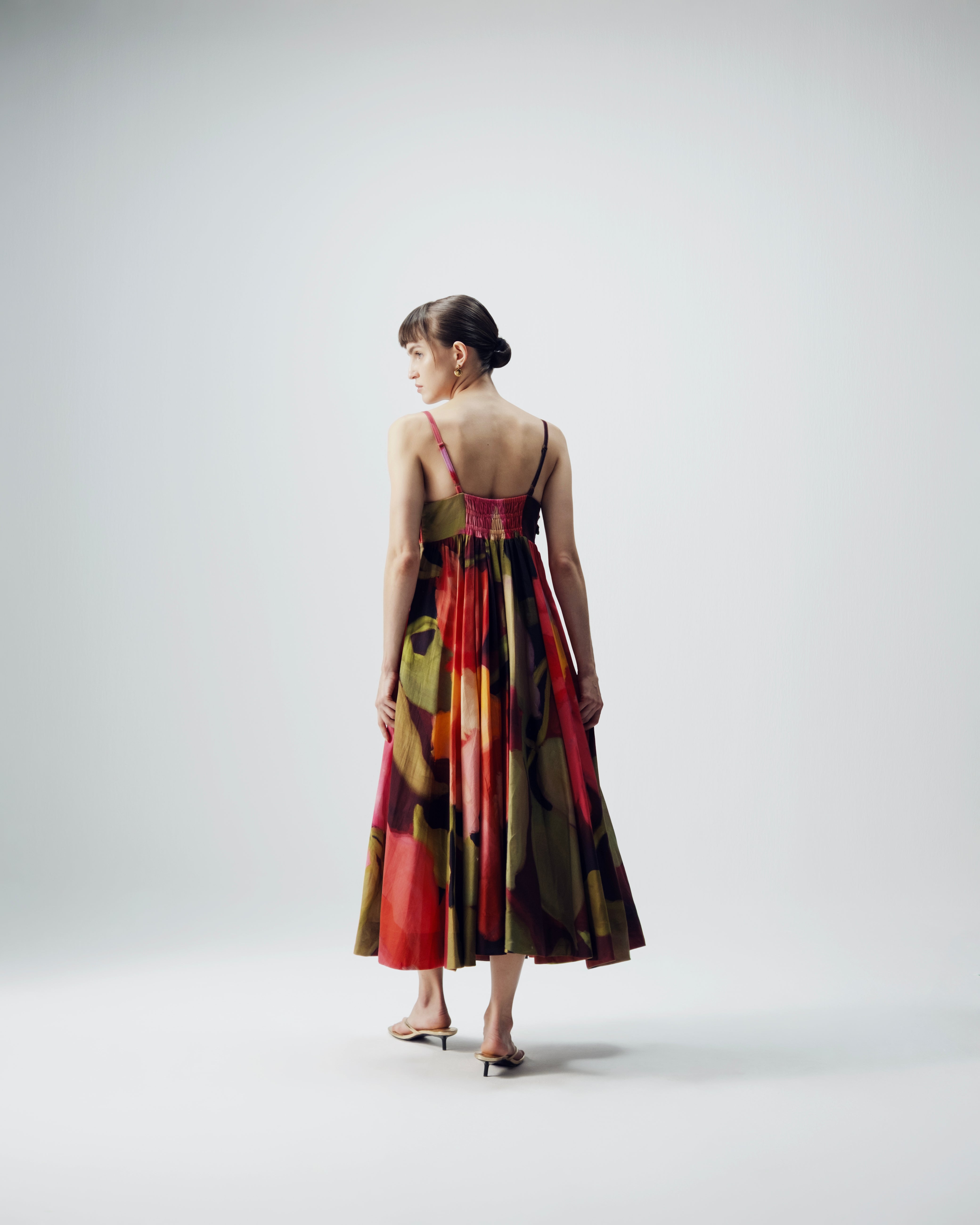 This stunning maxi-length sundress features a vibrant painterly floral print in deep reds, fuchsias, lush greens, and soft purples, designed with a fitted bodice, flowing A-line skirt, delicate spaghetti straps, and a prominent multi-layered 3D floral appliqué at the bust that adds texture and dimension, crafted in a breathable, flowing fabric with an elasticated back for a perfect fit—ideal for daytime events or evening resort wear; the model is 5'9" and wearing a size small.