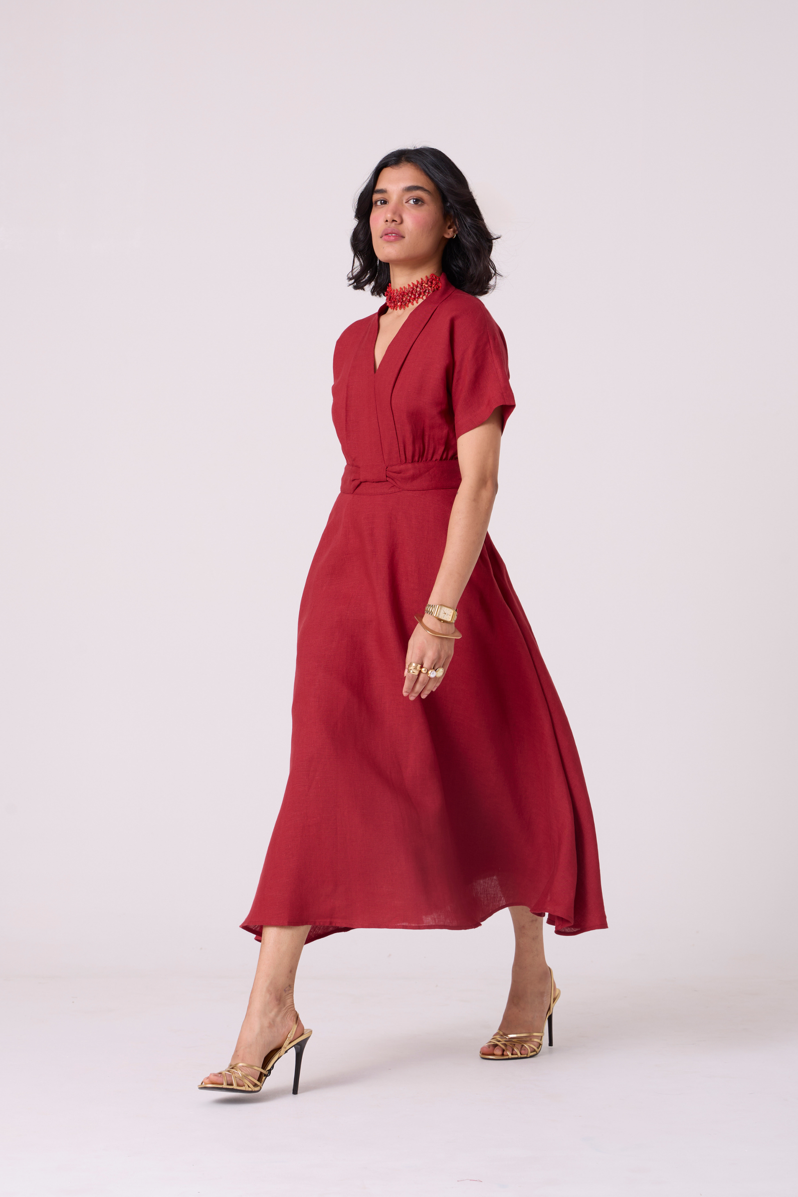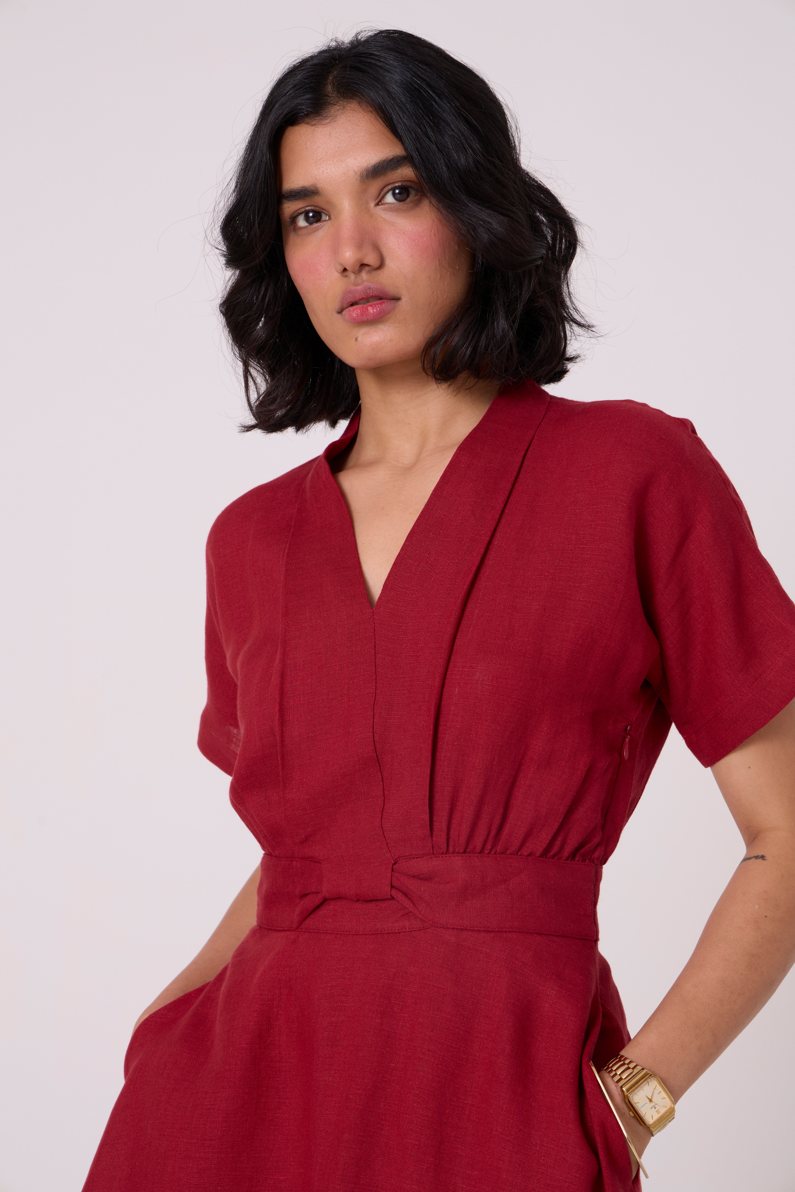 An ode to quiet drama, this pure linen piece transforms simplicity into sculpture with a pleated collar and knotted front detail, balanced by soft, relaxed drop sleeves. Lined from the waist down for coverage and ease, it features discreet in-seam pockets, a hand-finished side zip for strength and comfort, and is ethically made in India.