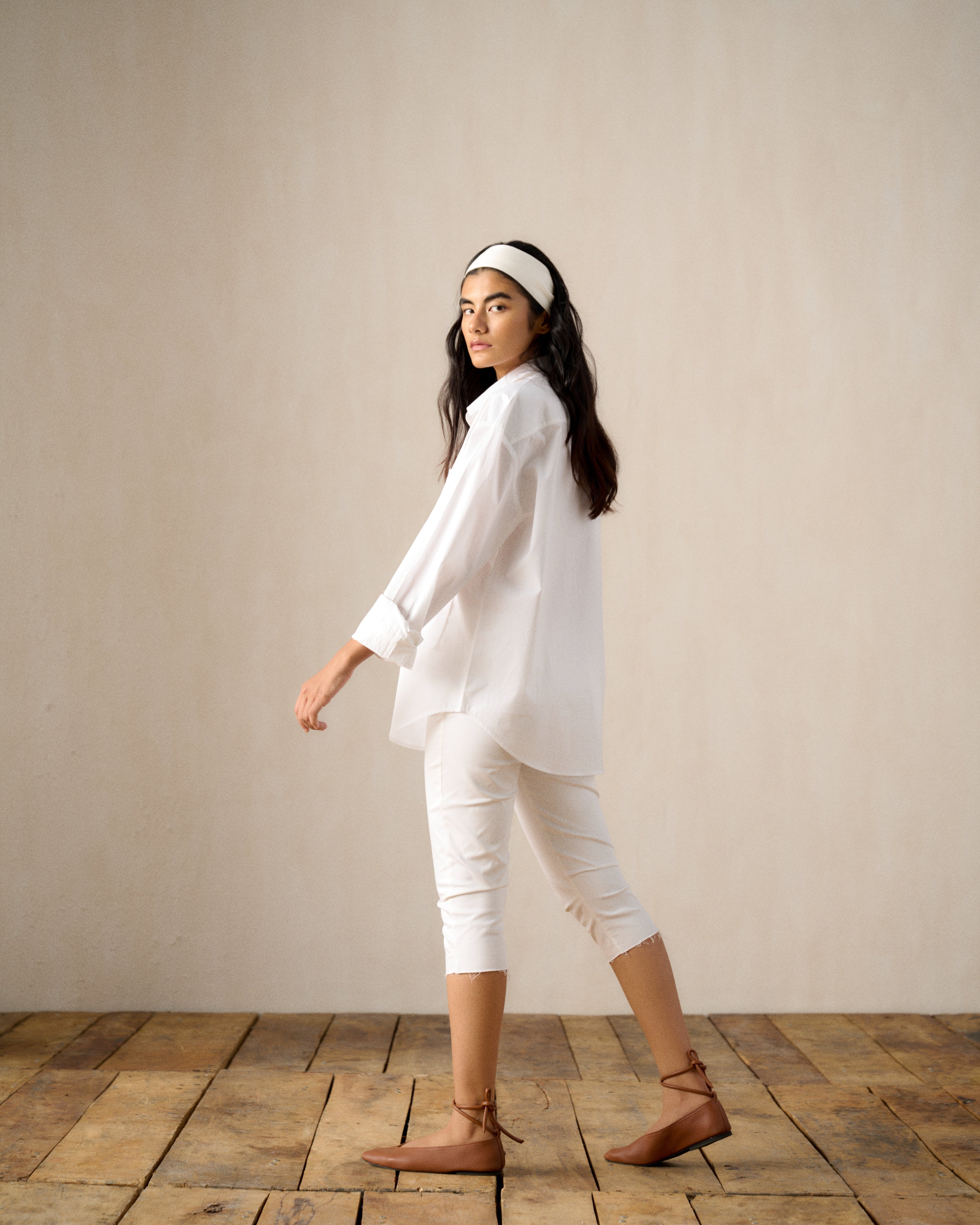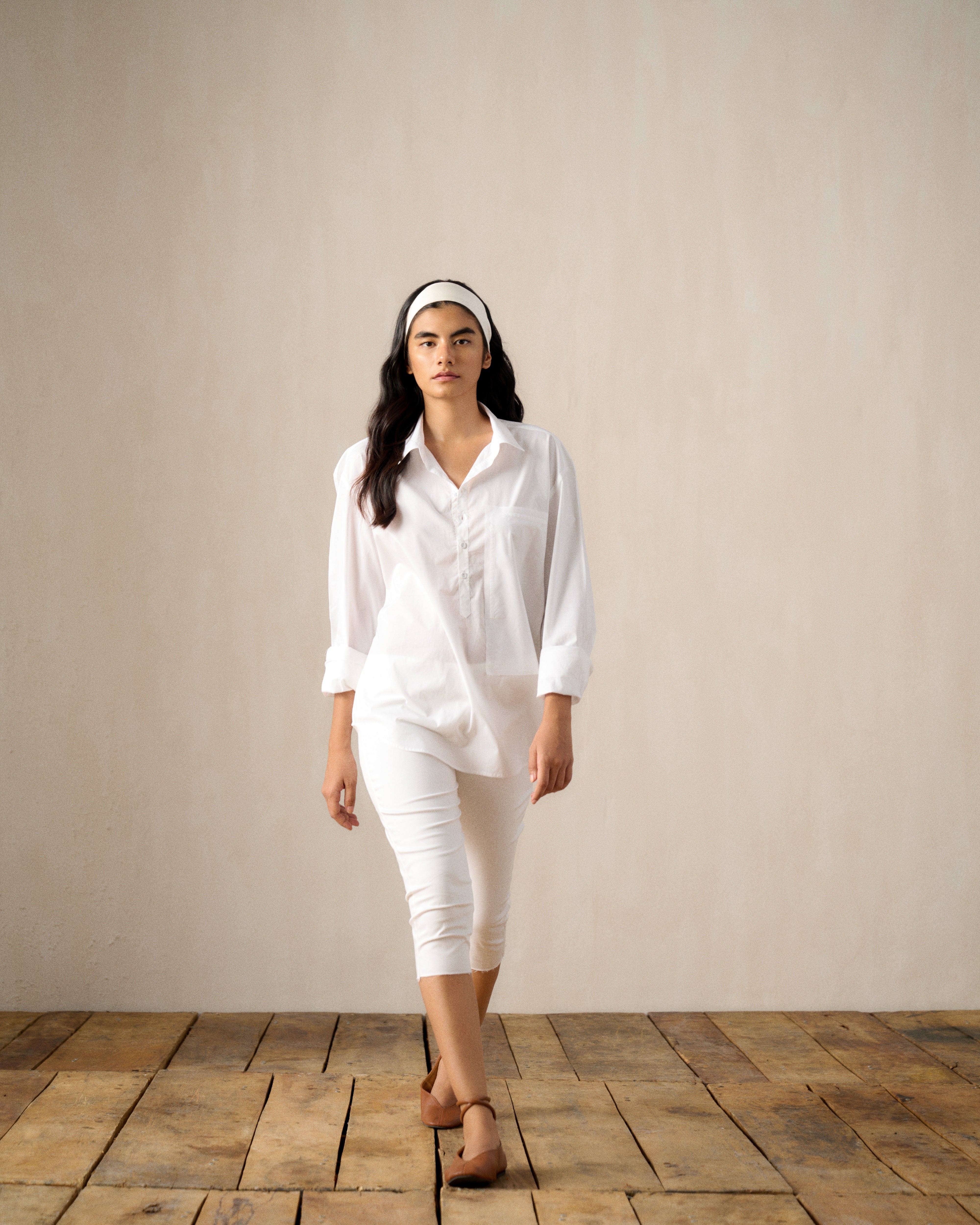 Experience everyday luxury in our crisp cotton set featuring a classic oversized shirt and tailored Capri pants. Designed for effortless sensuality, this refined silhouette moves with ease from day to night.
