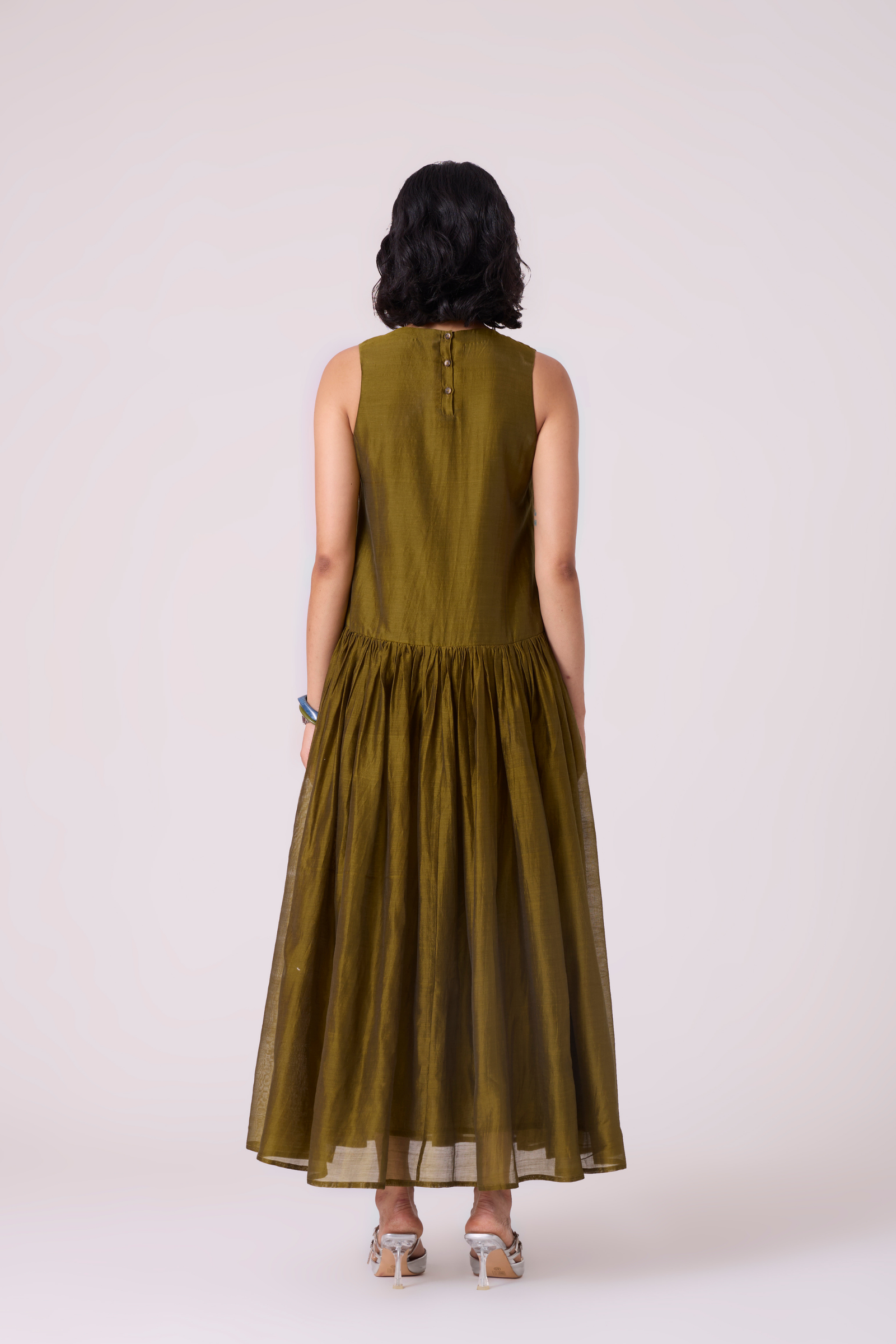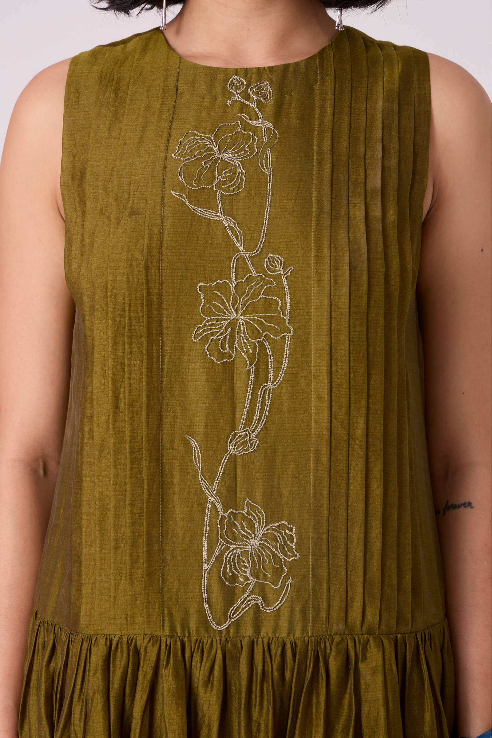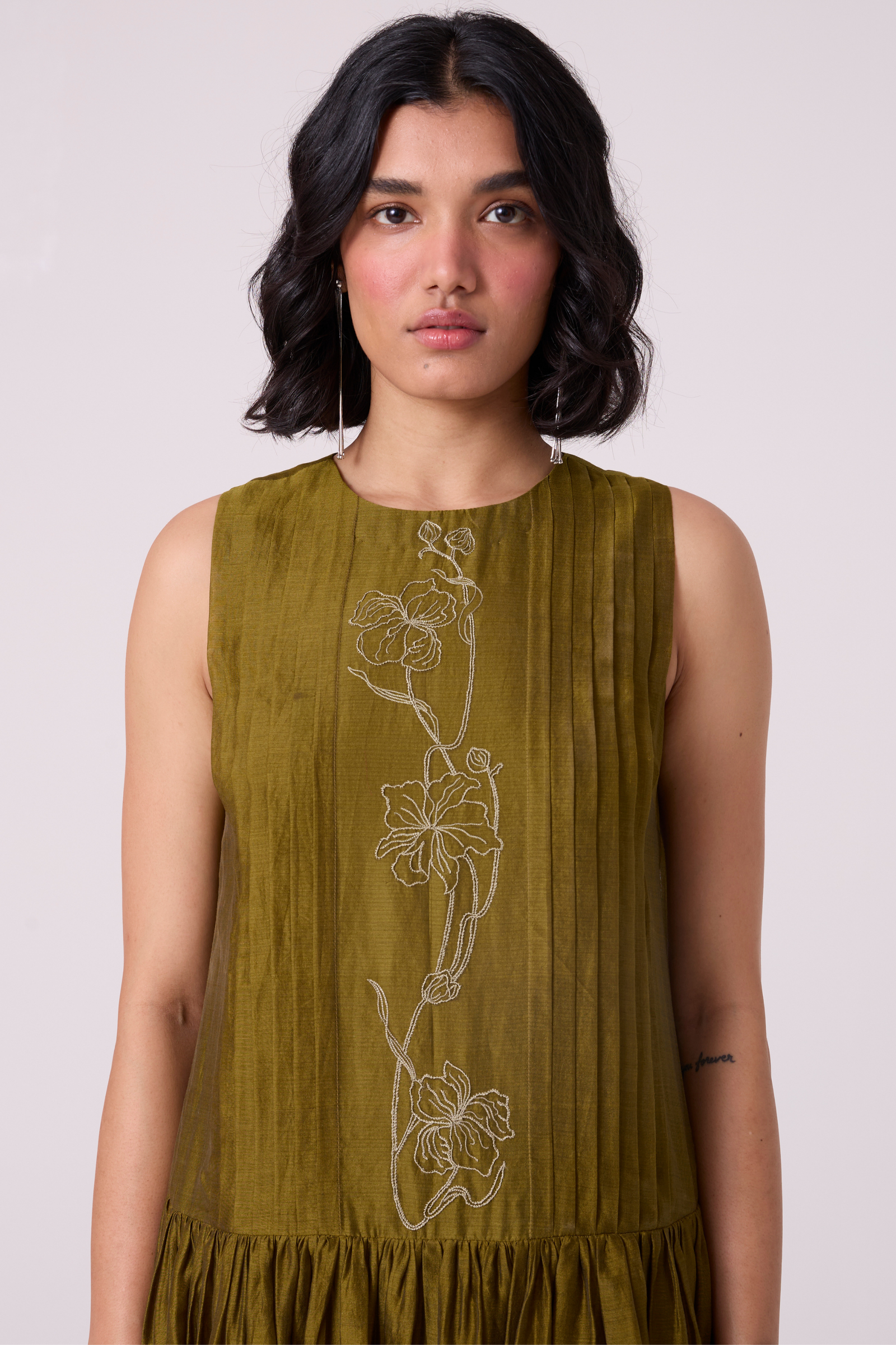 A maxi-length silhouette with a composed drop waist and a hand-embroidered front panel draws attention to line and craftsmanship, while pleated shoulders introduce restrained volume, allowing the dress to move with quiet assurance. Fully lined for comfort, with natural variations in embroidery that reflect its hand-done workmanship.