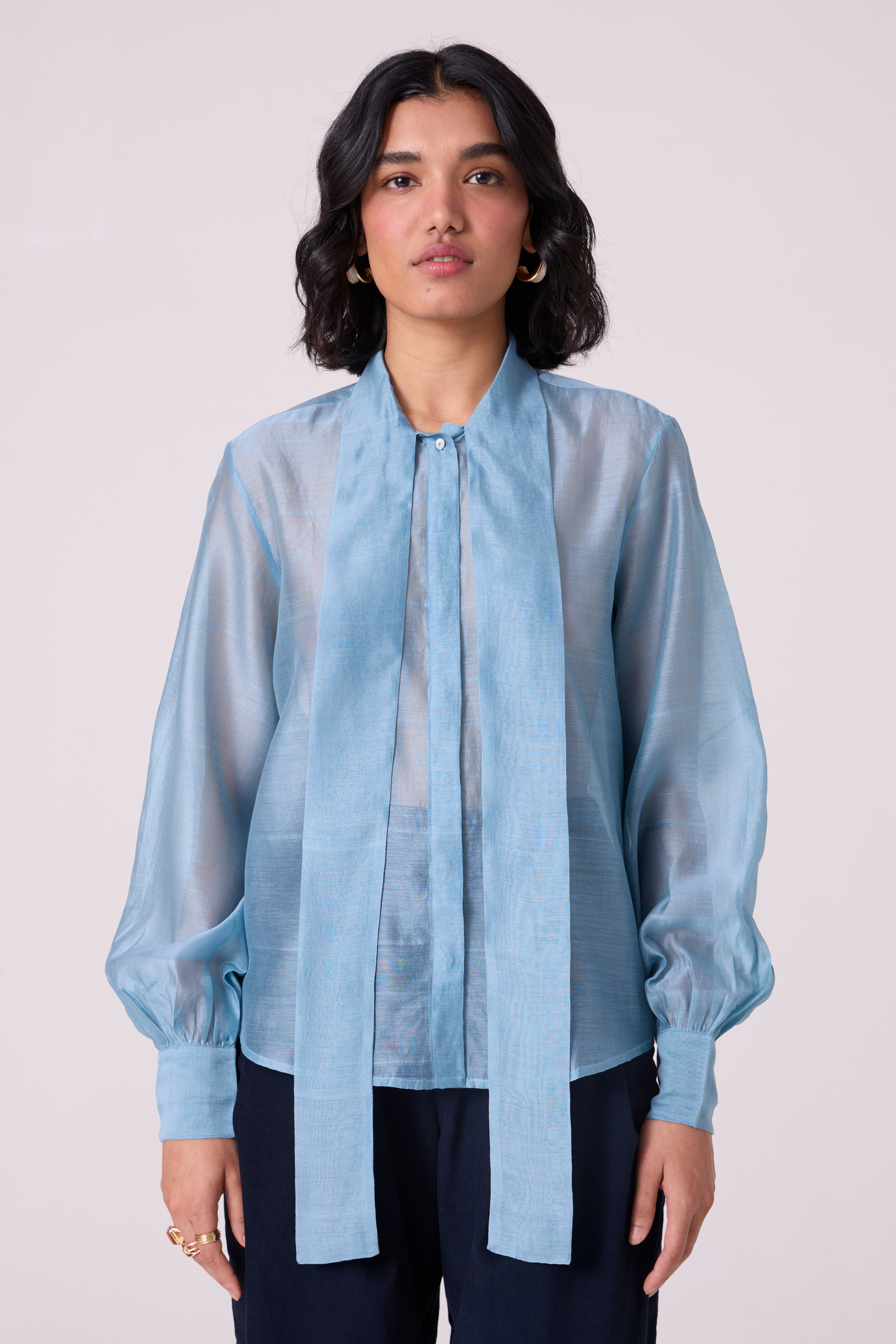A handwoven Chanderi blouson expresses its femininity through quiet details—a soft tie at the neck, gentle gathers along the shoulders and yoke, and full-length sleeves finished with precise cuffs—making it elegant whether tied or left undone. Designed in a classic blouson style with subtle gathers at the cuffs, the garment is shipped with a slip for added comfort.