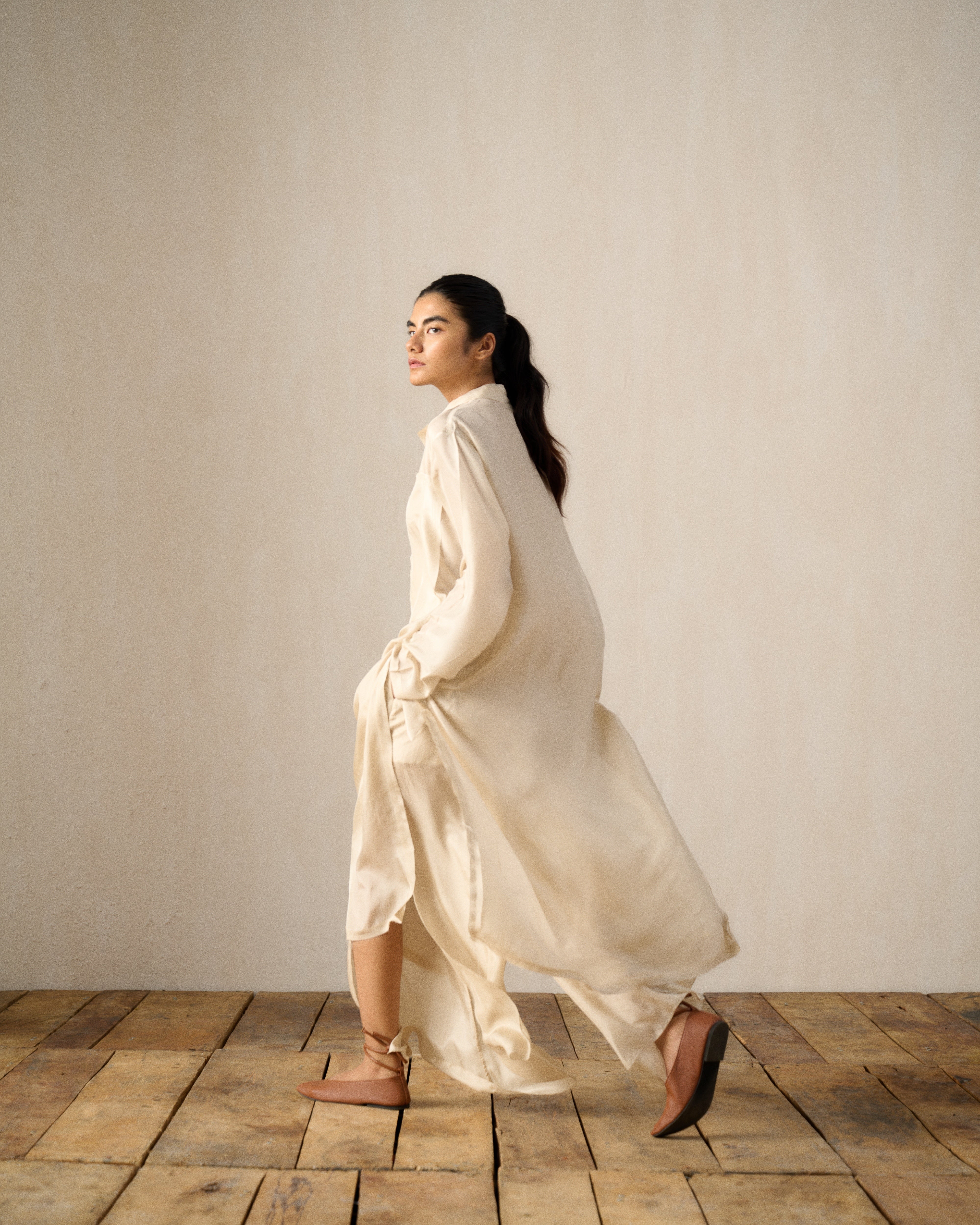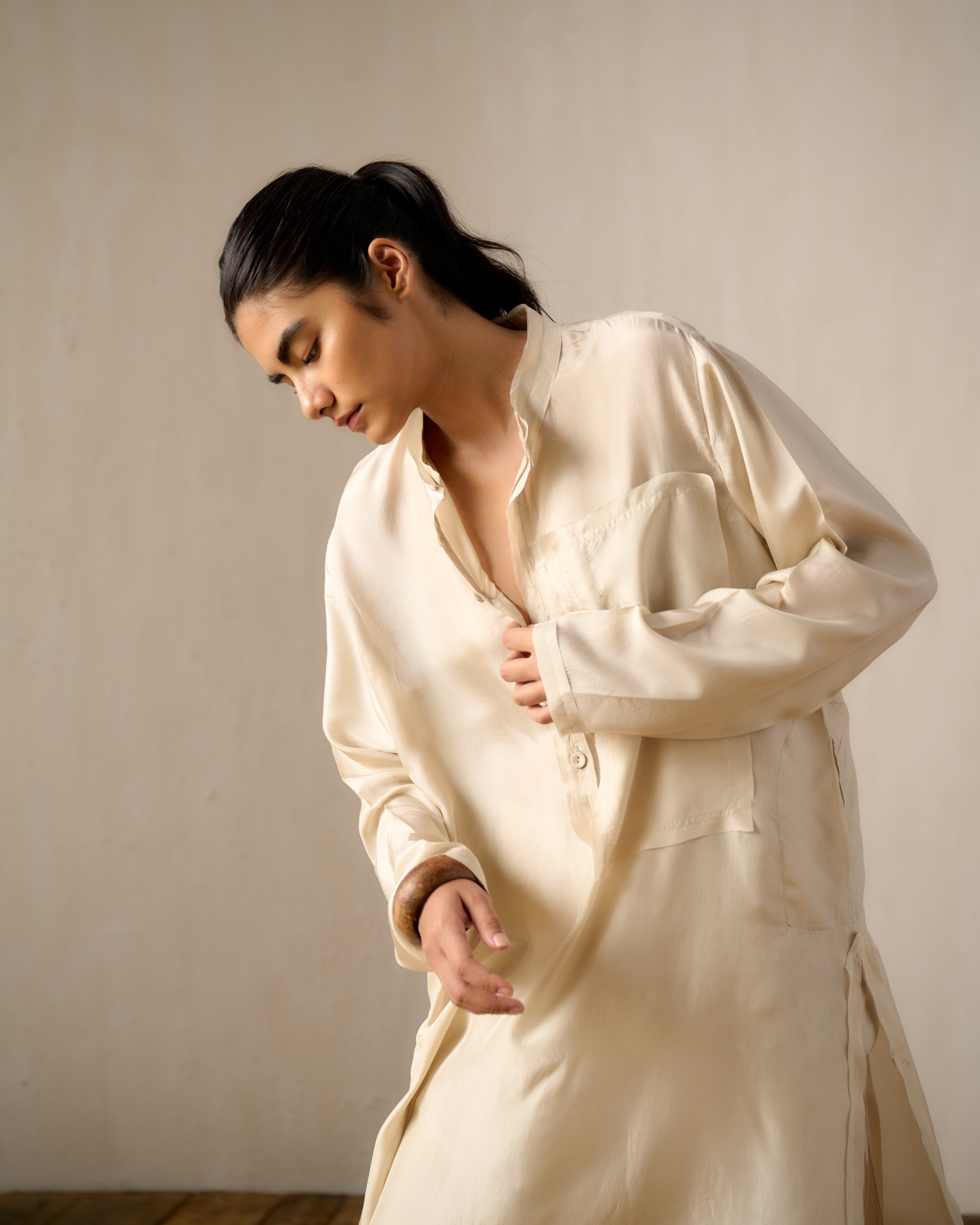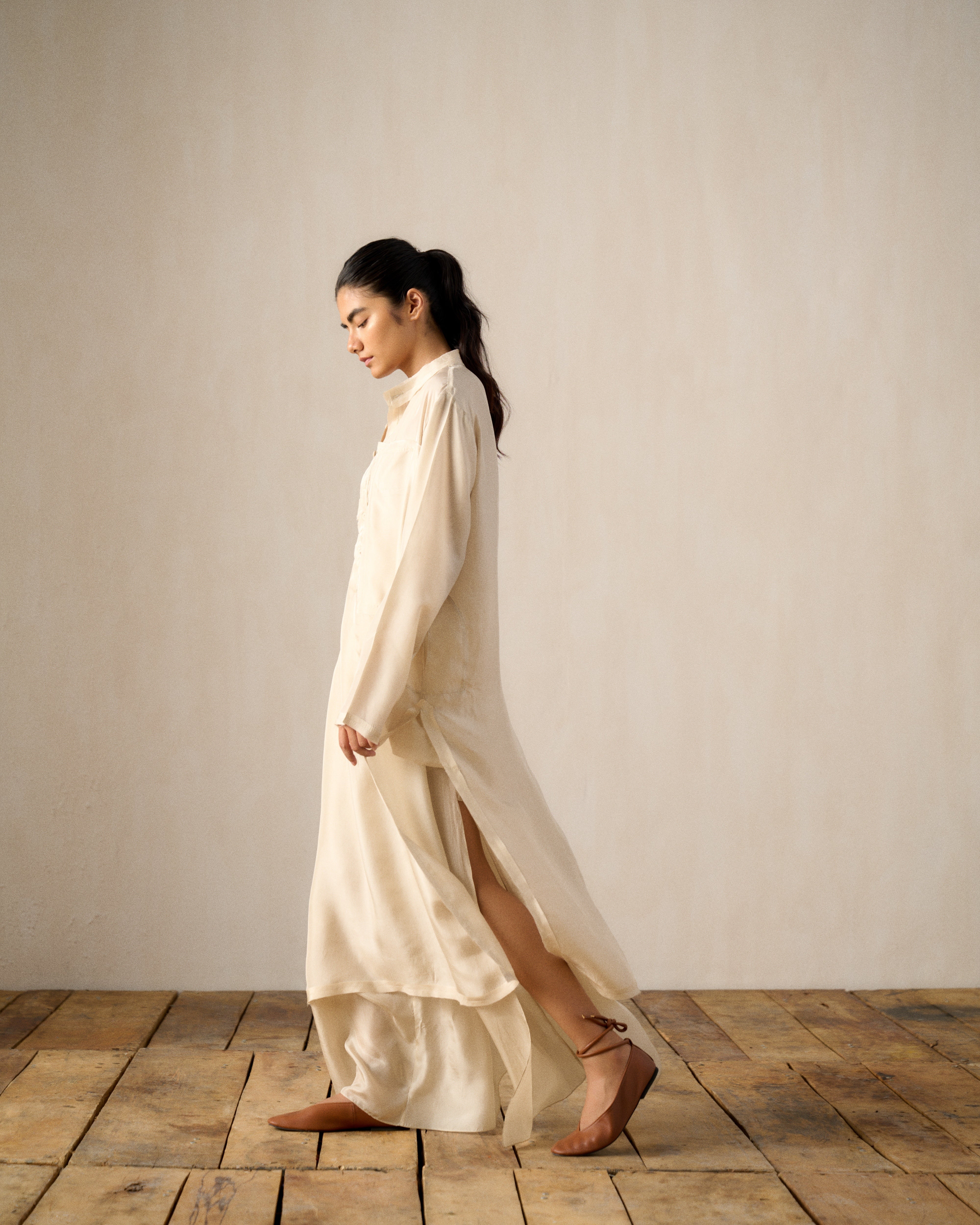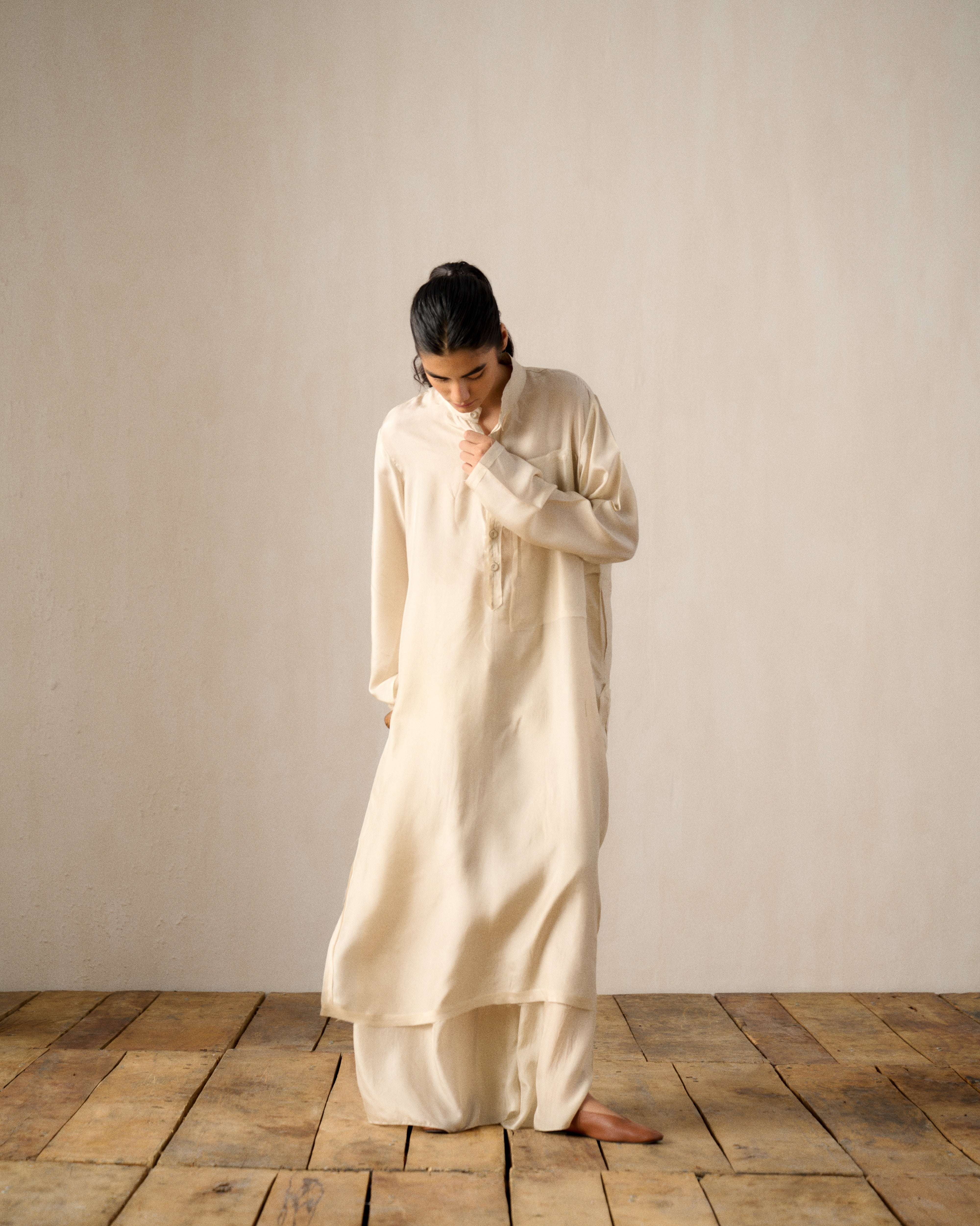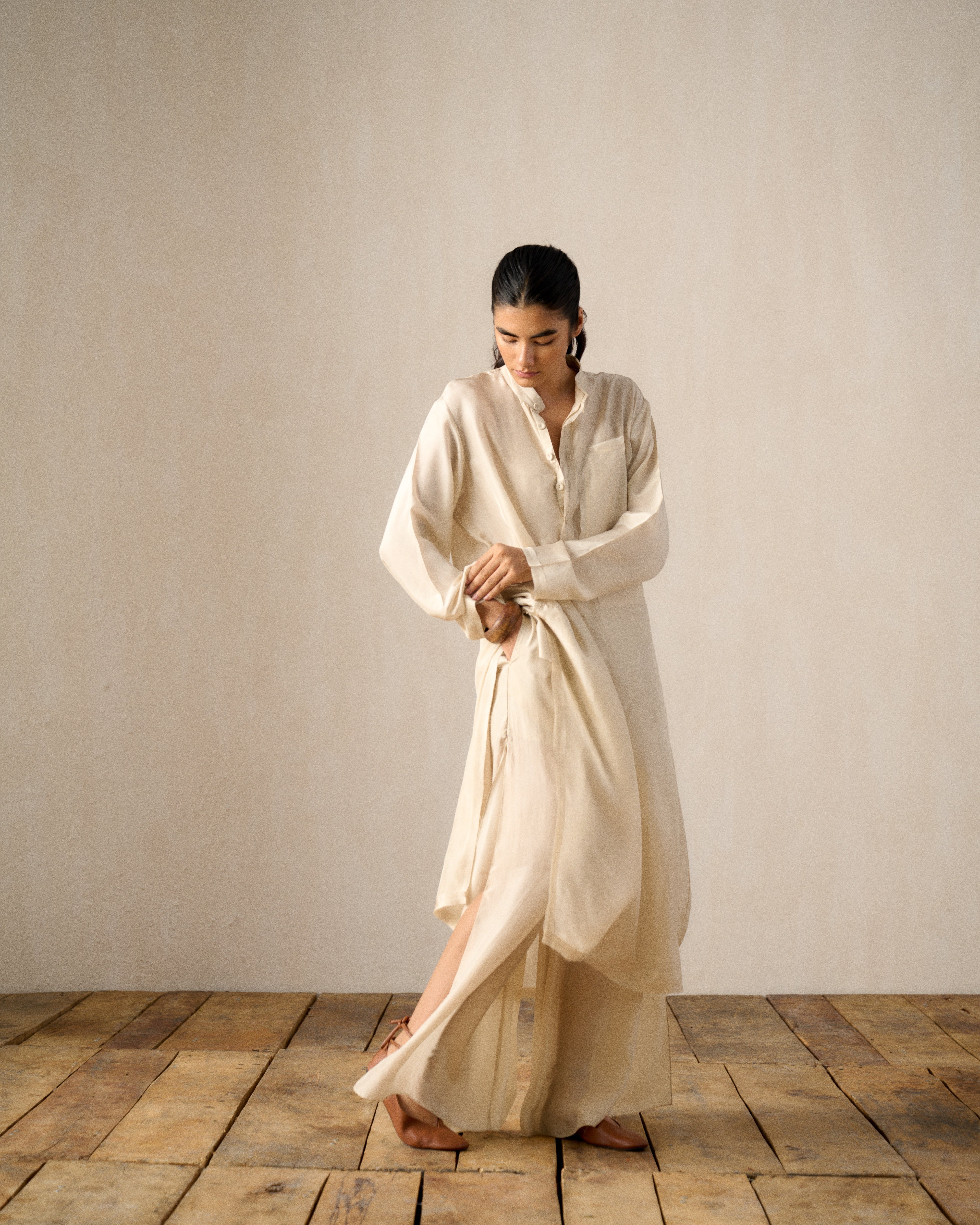 This breezy silk set brings together soft structure and flowing grace. The high-slit kurta with artisanal detailing is paired with flared pants, offering ease of movement and quiet luxury. Designed for everyday elegance that dresses up or down - seamlessly moving from day into night.