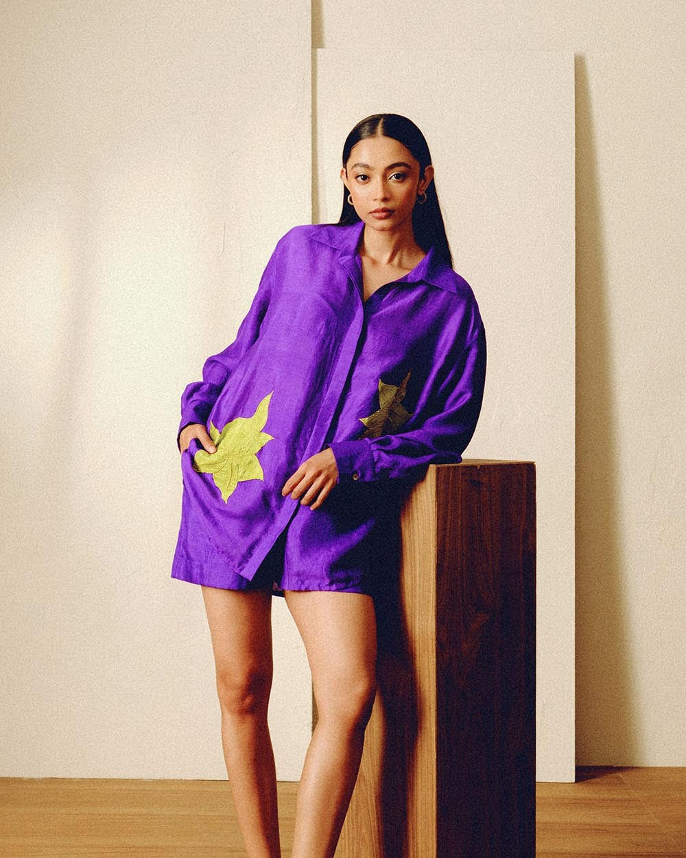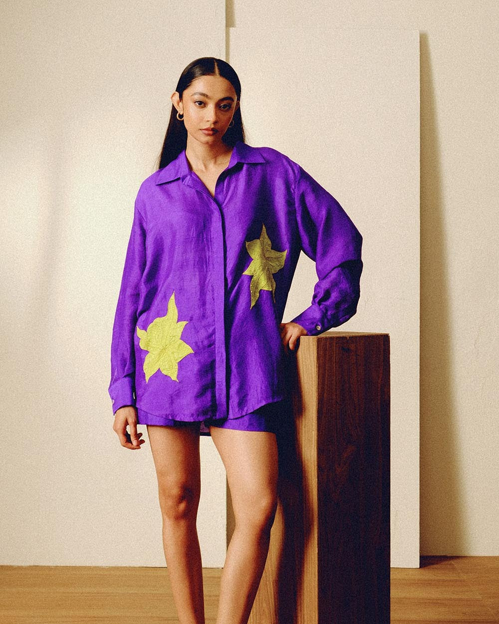 This refined set showcases a handwoven mulberry silk relaxed-fit shirt adorned with contrasting floral appliqué and metallic bead highlights, creating rich textural dimension. Paired with high-waisted solid relaxed shorts, this ensemble balances structured details with effortless silhouettes, offering versatile warm-weather elegance that highlights exceptional textile quality.