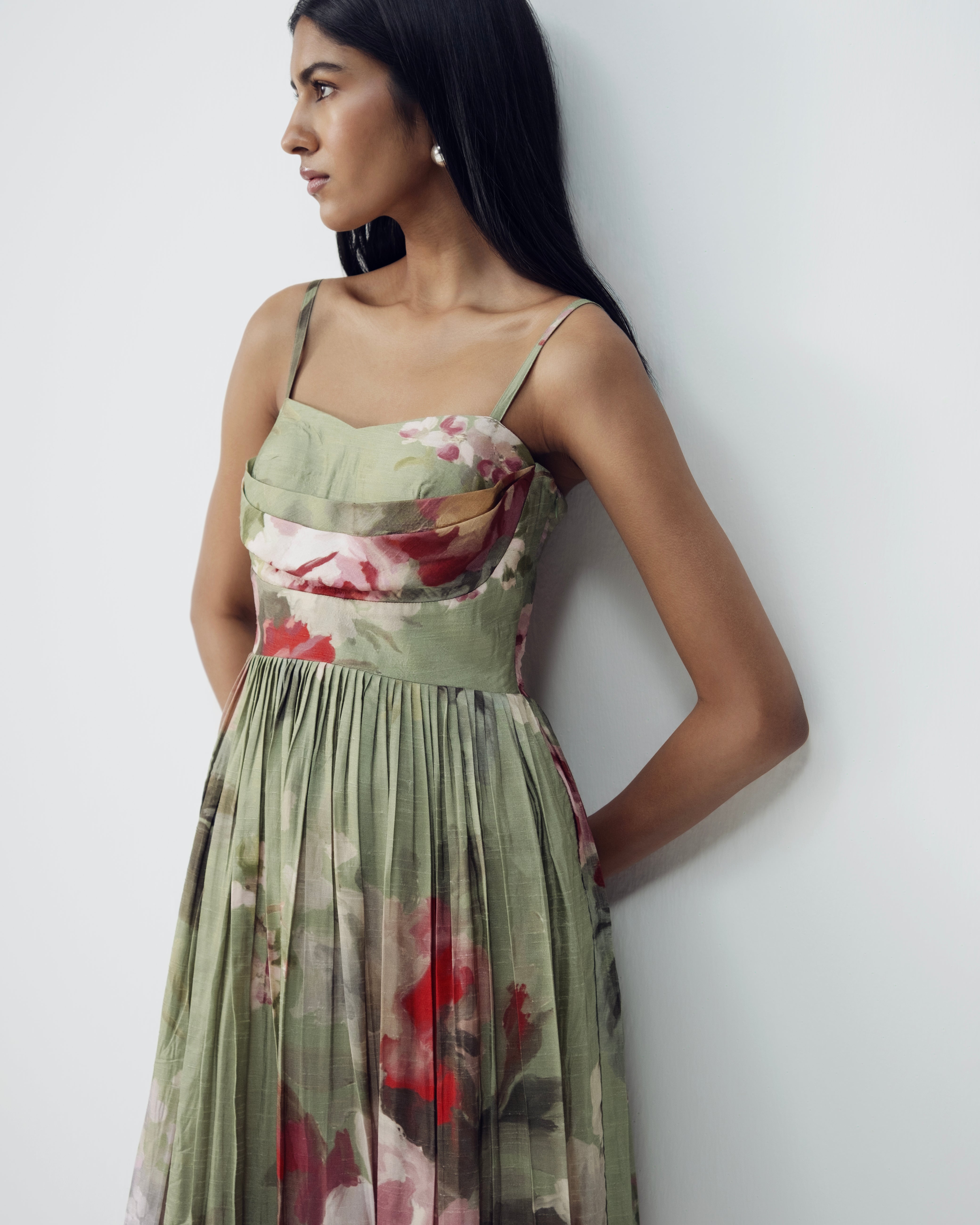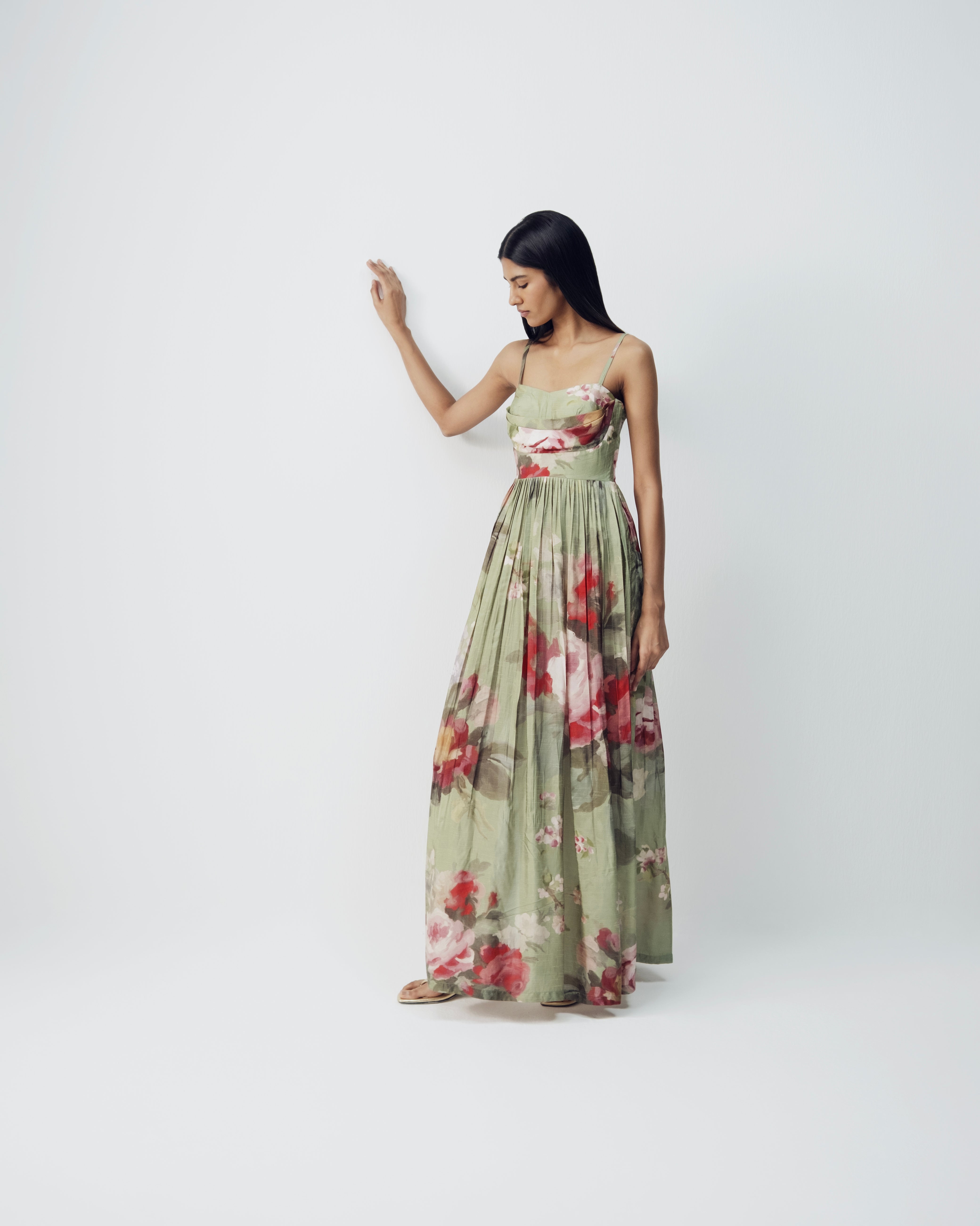 This elegant sage-green maxi dress features a striking oversized hand-painted–inspired floral print in shades of crimson, blush pink, and soft coral, designed with a delicately structured bodice, slim noodle straps, and a flowing gathered skirt with soft pleating and concealed side pockets, creating a feminine, relaxed silhouette that transitions effortlessly from daytime to evening wear; the model is 5'9" and wearing a size small.
