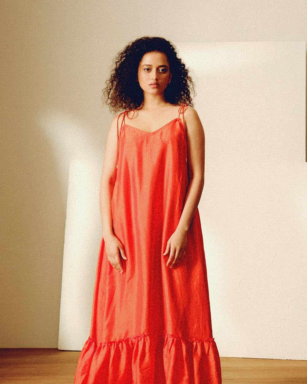 This elegant slip maxi dress in handwoven mulberry silk features delicate pintucks along the sides, creating subtle structure within the flowing silhouette. The distinctive shoulder tie-up detail adds customizable dimension to this piece, which celebrates the exceptional drape and luminosity of artisanal silk through minimalist design elements.