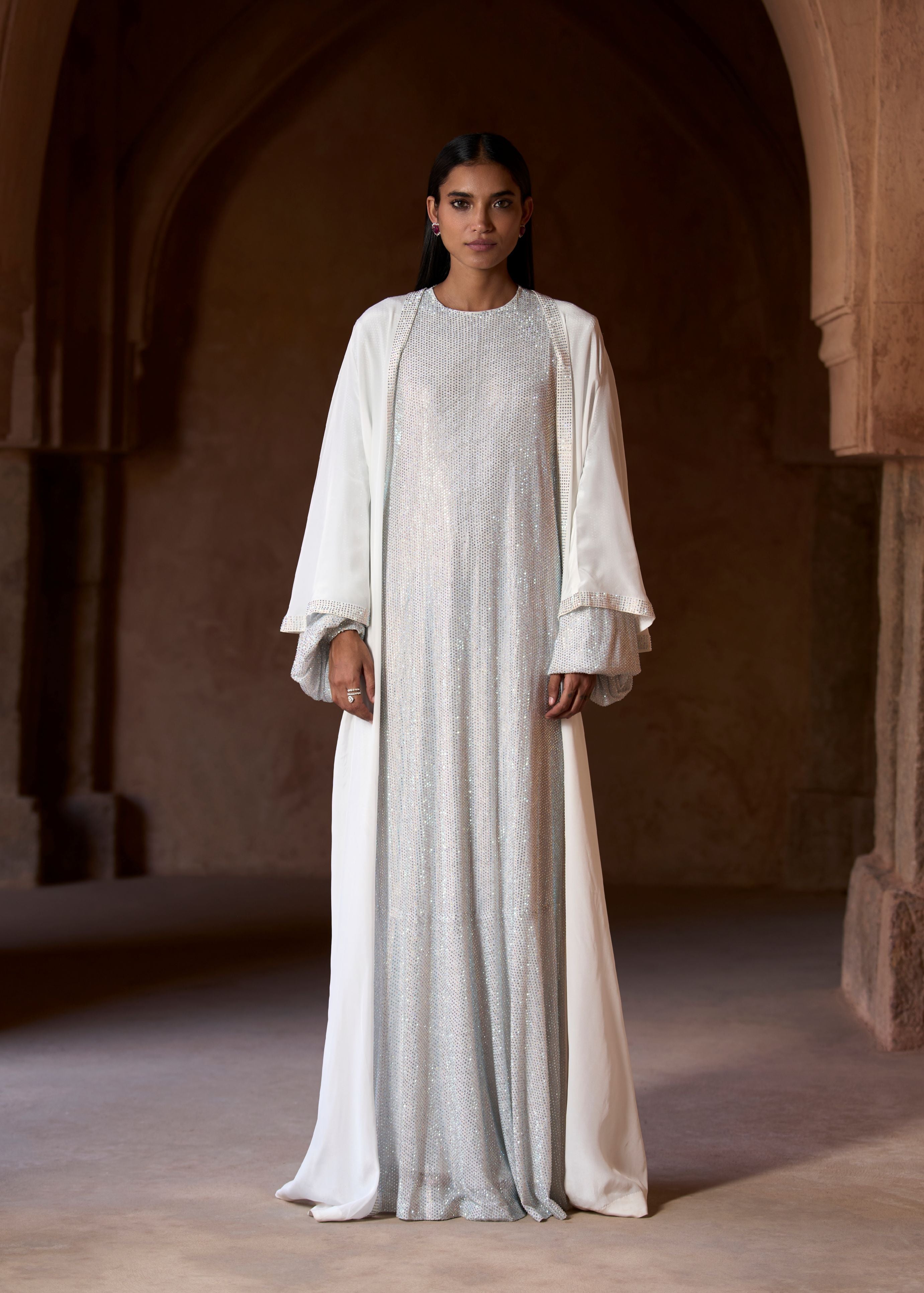 Silver crystal-embellished abaya paired with a solid fabric white shrug jacket. All our pieces are handcrafted, so slight variations in color or detailing may occur, making each outfit unique.