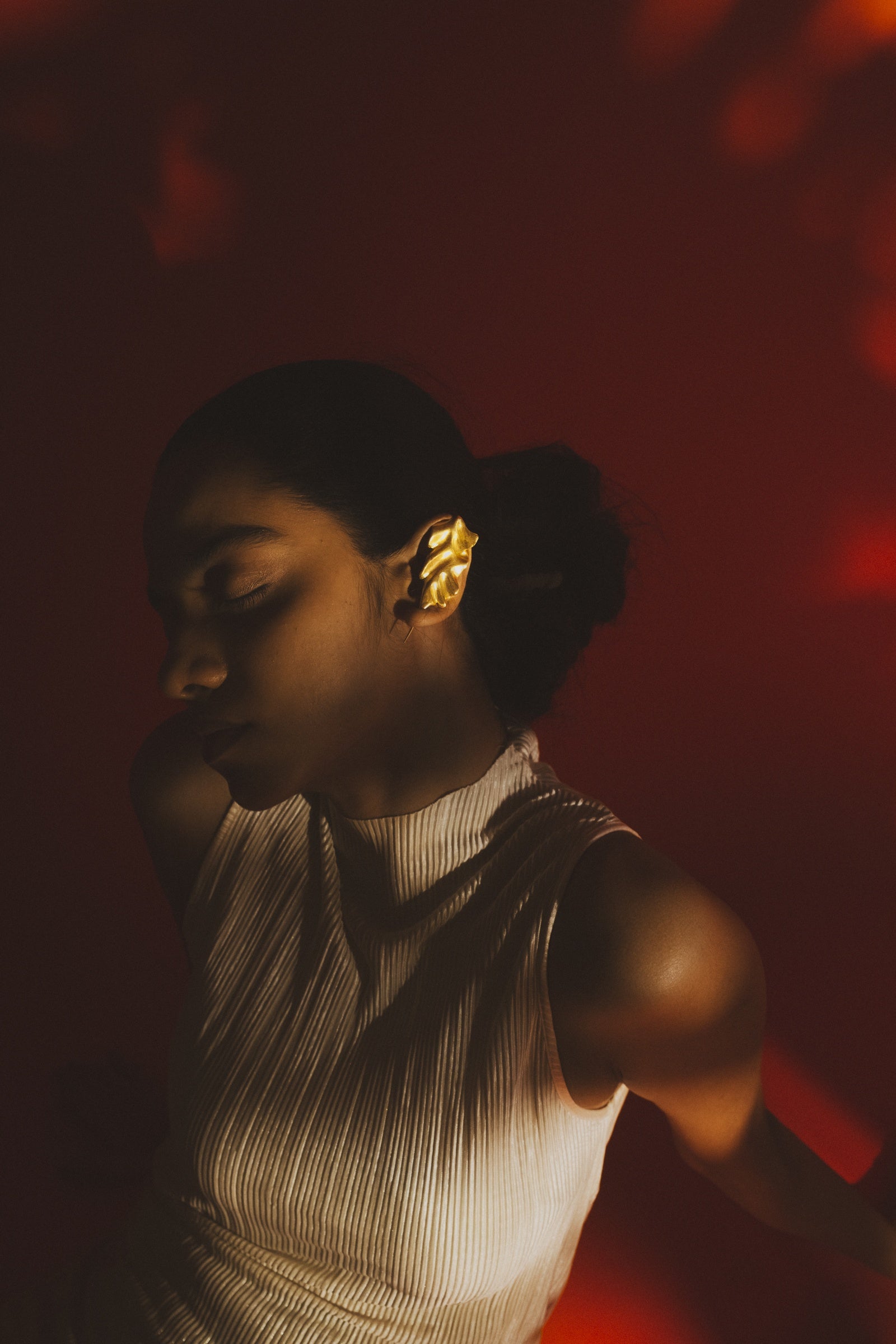 A sculptural gold ear cuff with fluid, leaf-like folds that play with light and shadow slips on effortlessly to create a bold yet minimal, artful statement without the need for piercings; it measures 7 cm in length, weighs 23 gms per pair, and is handmade in brass with 18kt gold plating and E-coating.