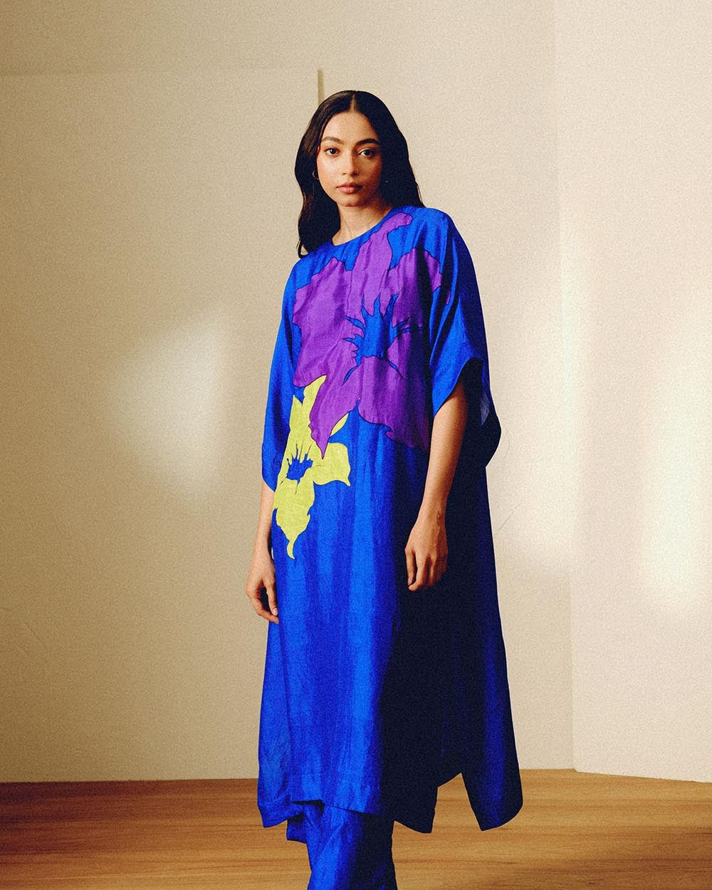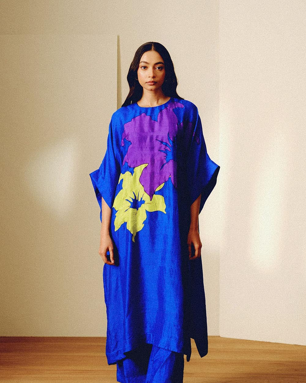 This versatile set features a free-sized tunic in handwoven mulberry silk with a generous 44-inch length, creating an elegant drape. The tunic showcases contrasting floral appliqué that adds dimensional texture, while matching narrow pants with a 37-inch length complete the fluid silhouette. This ensemble in refreshing blue combines traditional silk craftsmanship with contemporary details for effortless sophistication.
