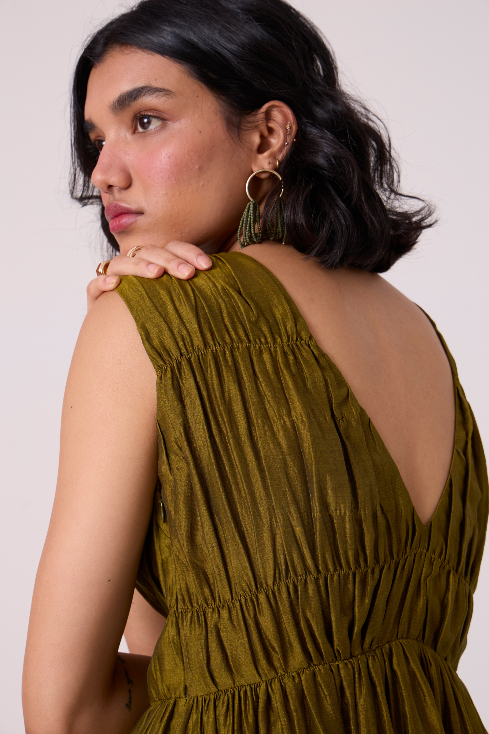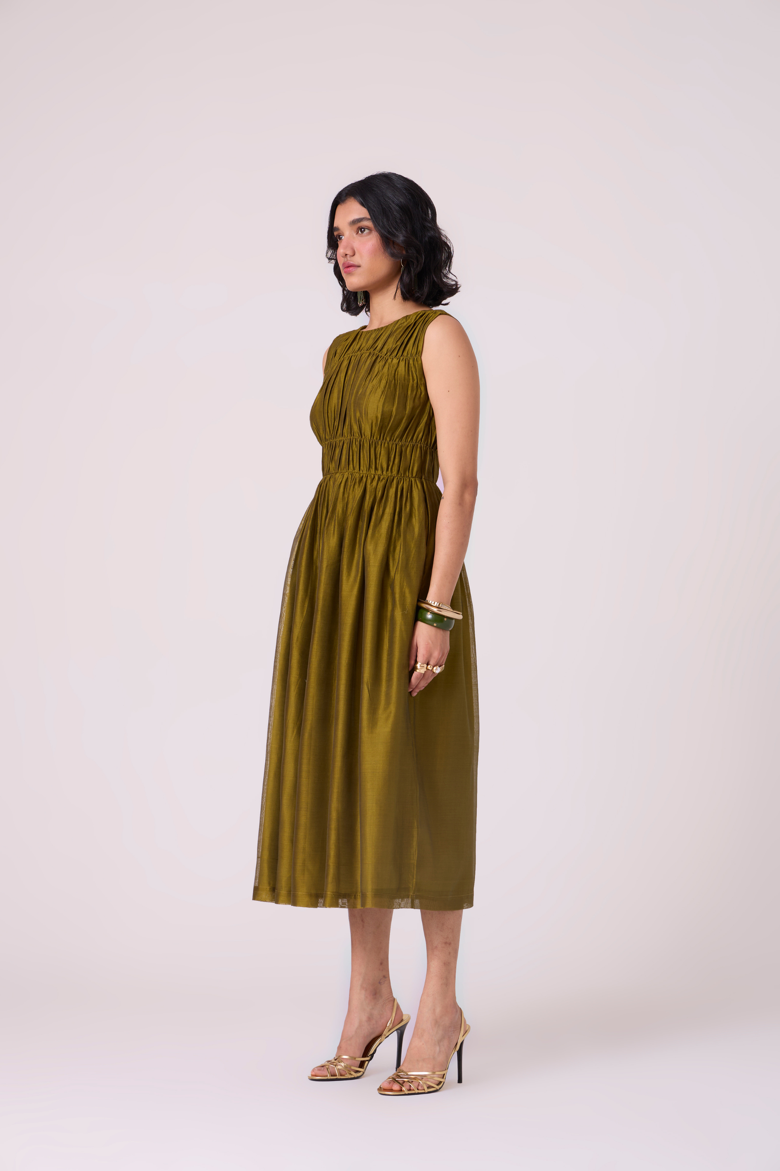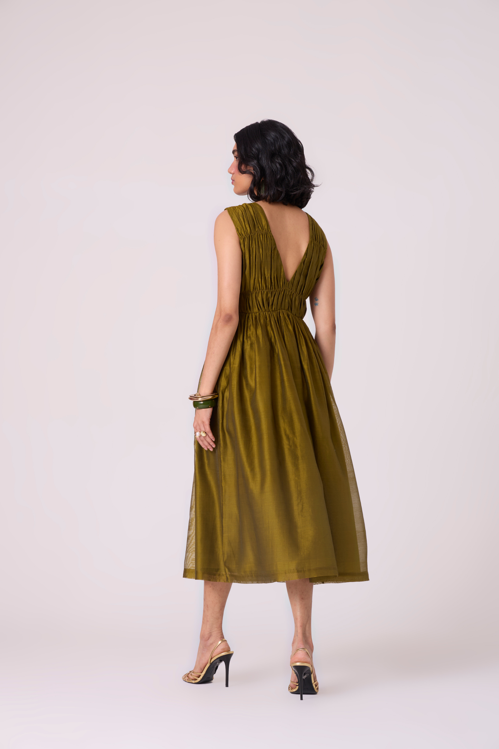 A sleeveless dress shaped by delicate ruching through the bodice features a high neckline in front and a deep V-back, creating a refined contrast between coverage and ease. Designed with in-seam pockets, a side zip fastening, and full lining for comfort and structure.