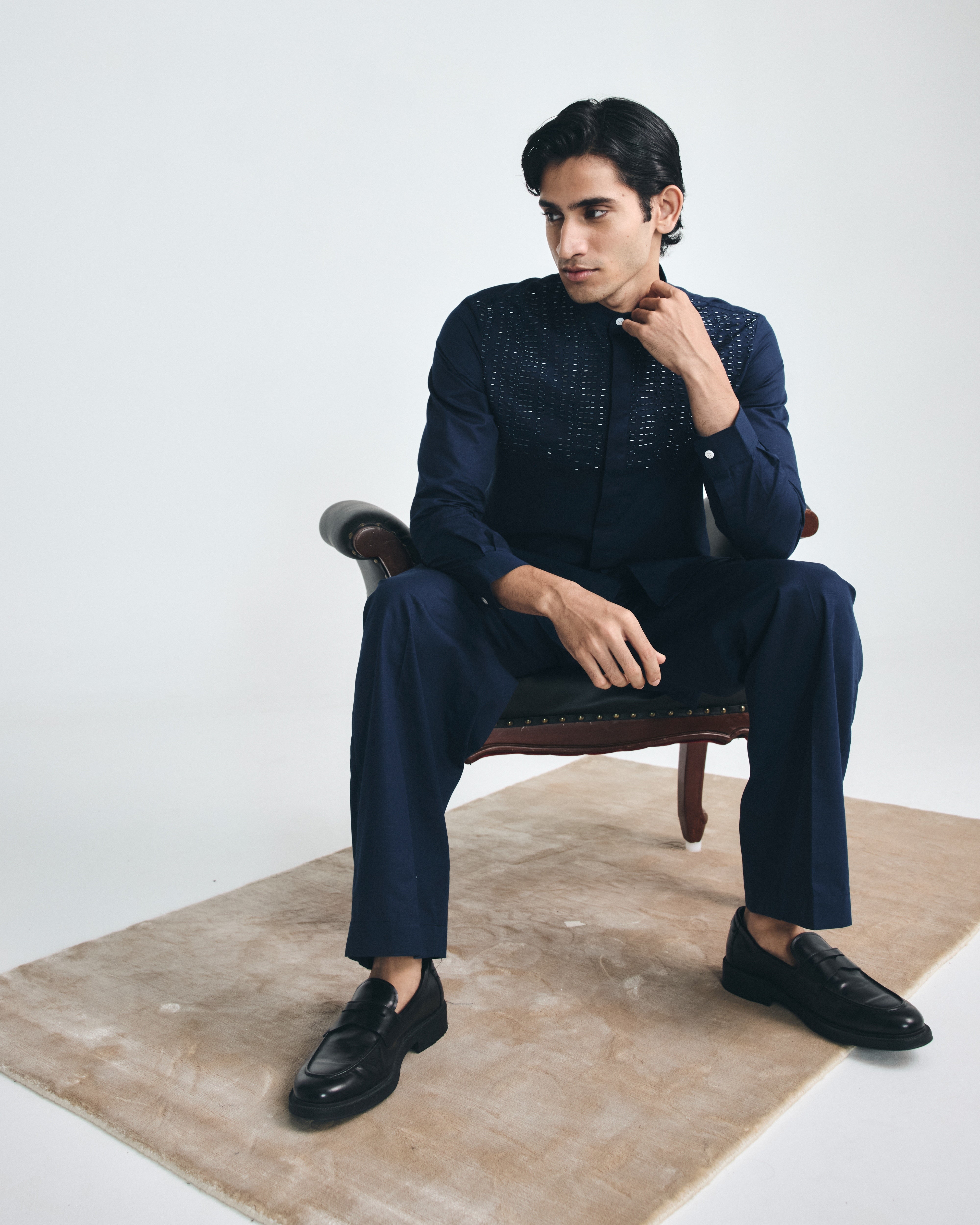 This navy blue cotton-linen, shirt-style short kurta features a mandarin collar, cuffed sleeves, two hip pockets, a concealed placket, and is enhanced with hand-embroidered cutdana on the shoulder. It includes one component, and the kurta length is 32”. This listing is for the kurta only, which can be paired with our signature trouser-style pajama or wide-leg pajama.