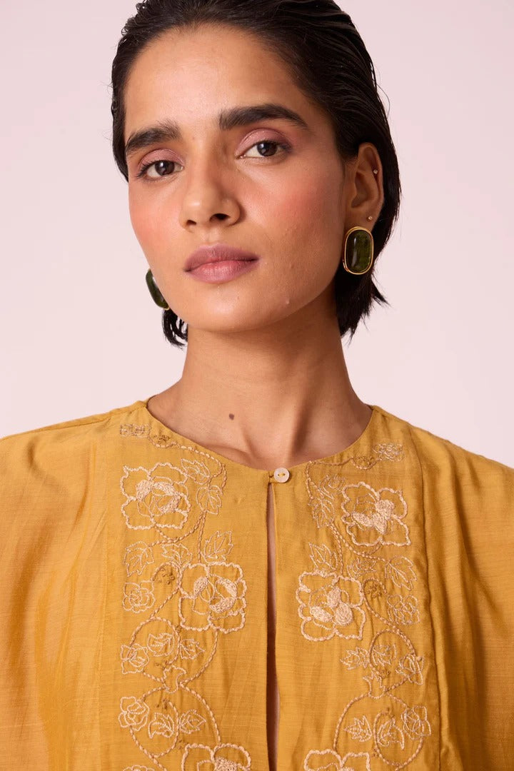 This piece features a composed silhouette with a quietly defined needlecord keyhole neckline, detailed with a hand-embroidered panel crafted in-house. Soft drop sleeves and fluid cupro lend ease to its day-to-evening form. Designed with in-seam pockets for everyday functionality, it is fully lined for comfort and coverage. Subtle variations in the embroidery reflect hand-done workmanship. Ethically made in India.