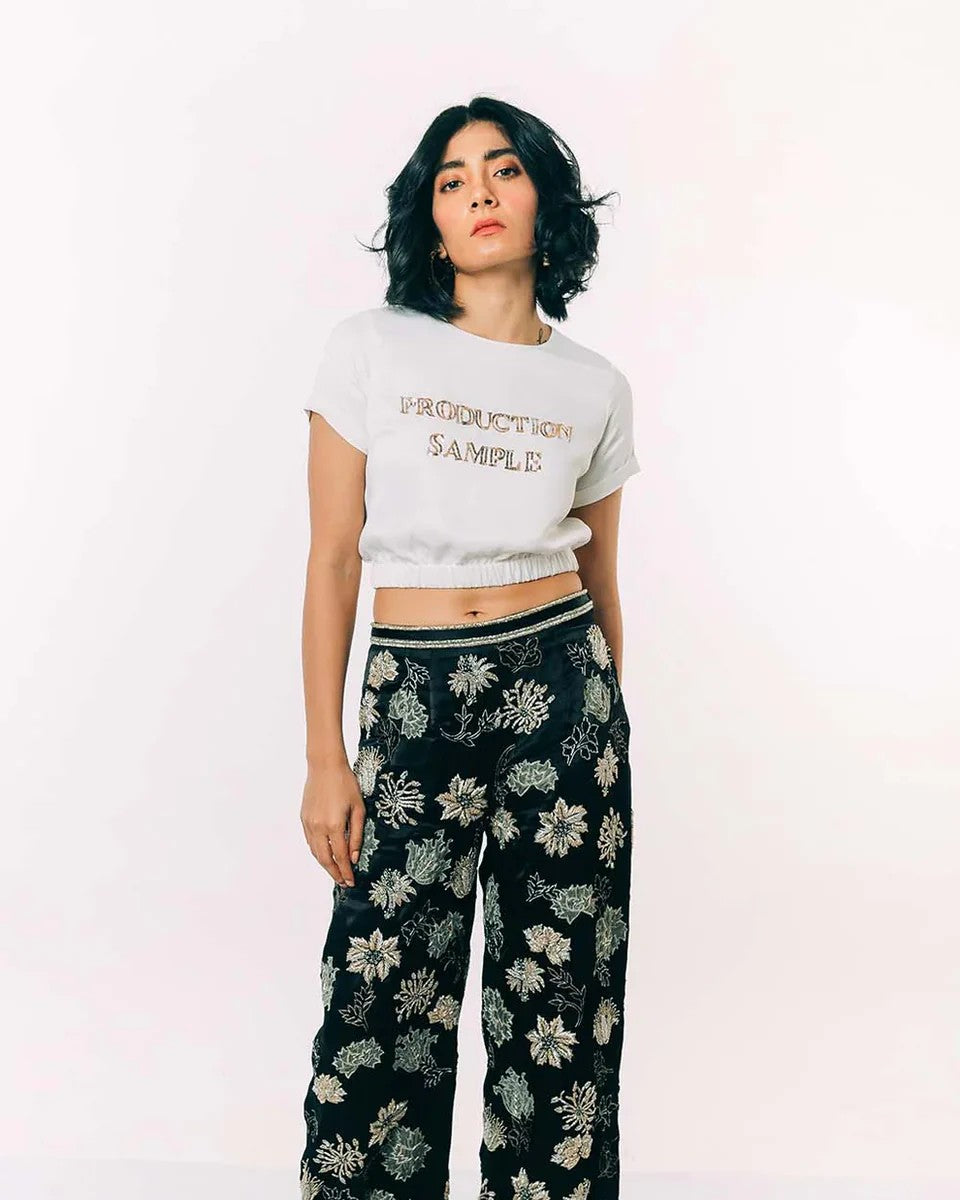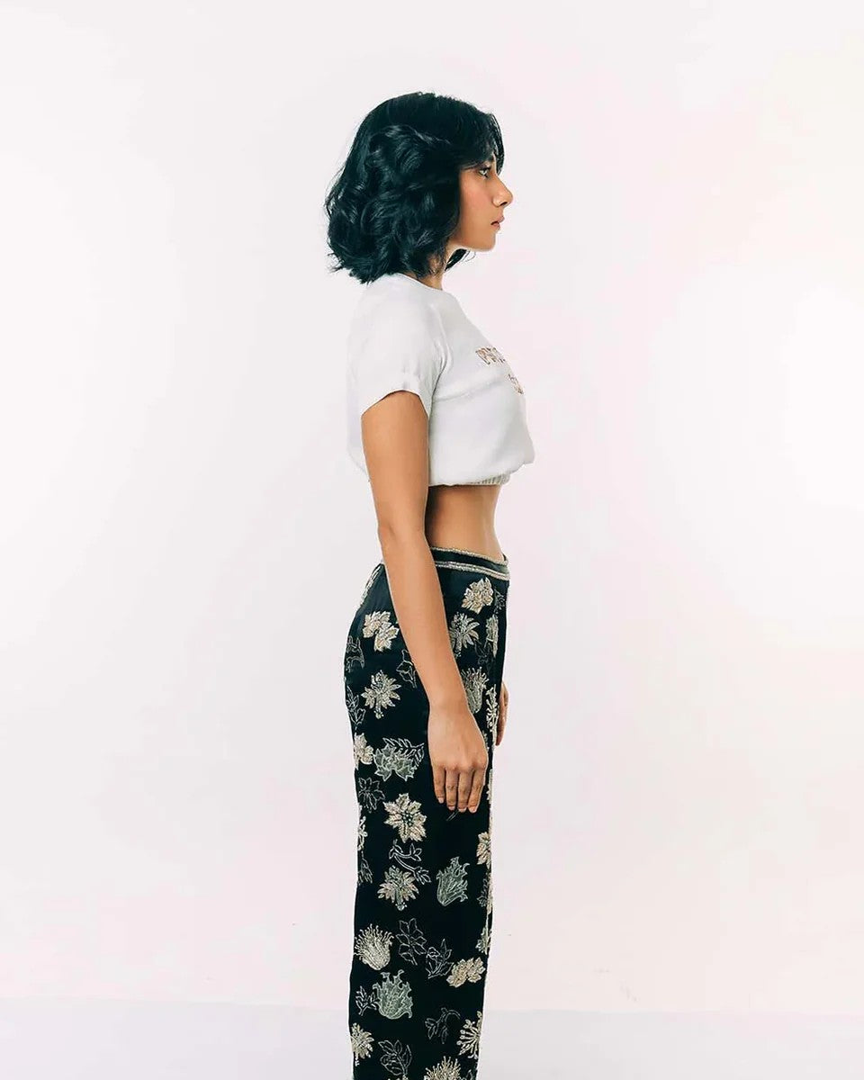 Crafted in heavy silk satin, this piece features intricate hand embroidery with coloured glass beads and stones. The embroidered wasit-band adds a striking contrast, while the wide-leg full-length silhouette.