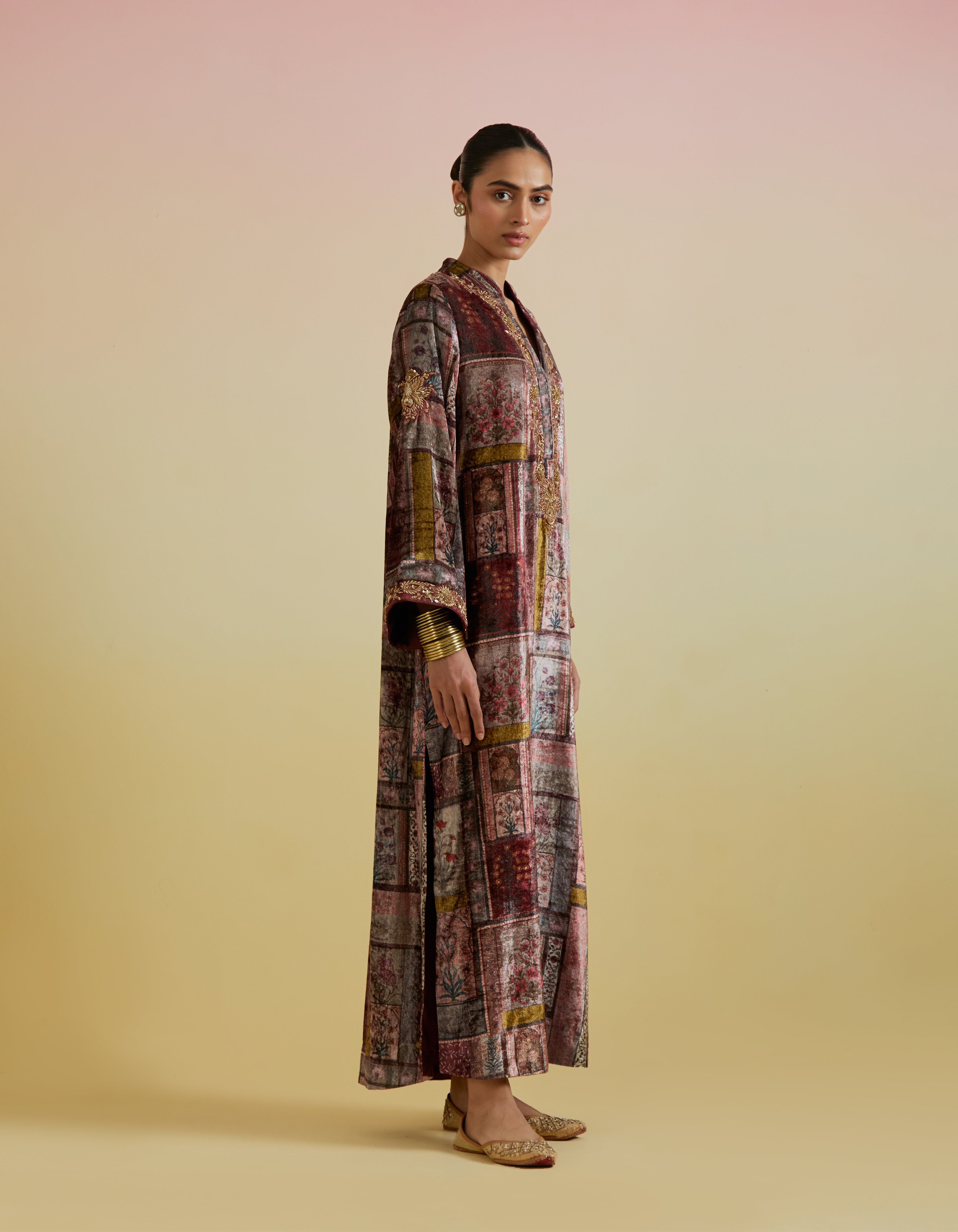 Crafted for those who appreciate artistry in every detail, our Anaya long kurta is designed for special occasions during the colder months. Cut in a relaxed, floor-length silhouette, this velvet kurta drapes effortlessly, offering a perfect balance of comfort and sophistication. Featuring a patchwork print with intricate embroidery across the neckline and sleeves, it makes a refined statement.