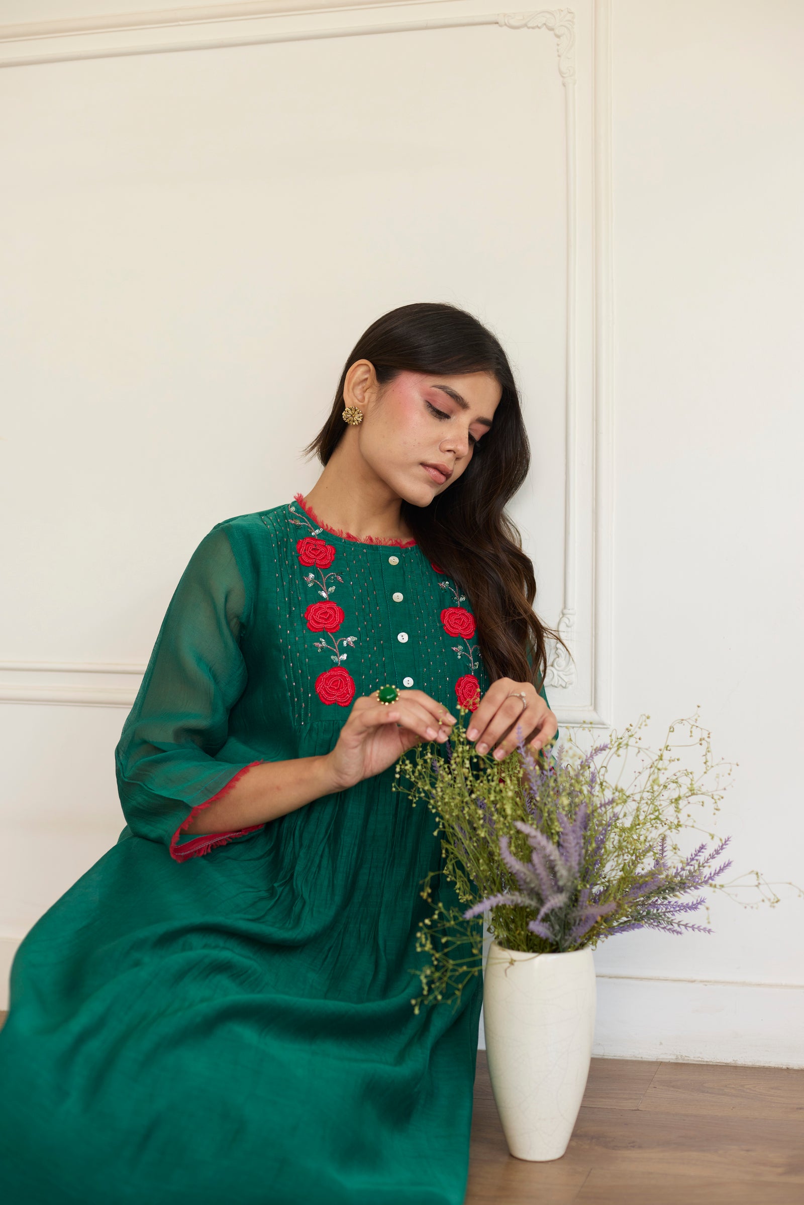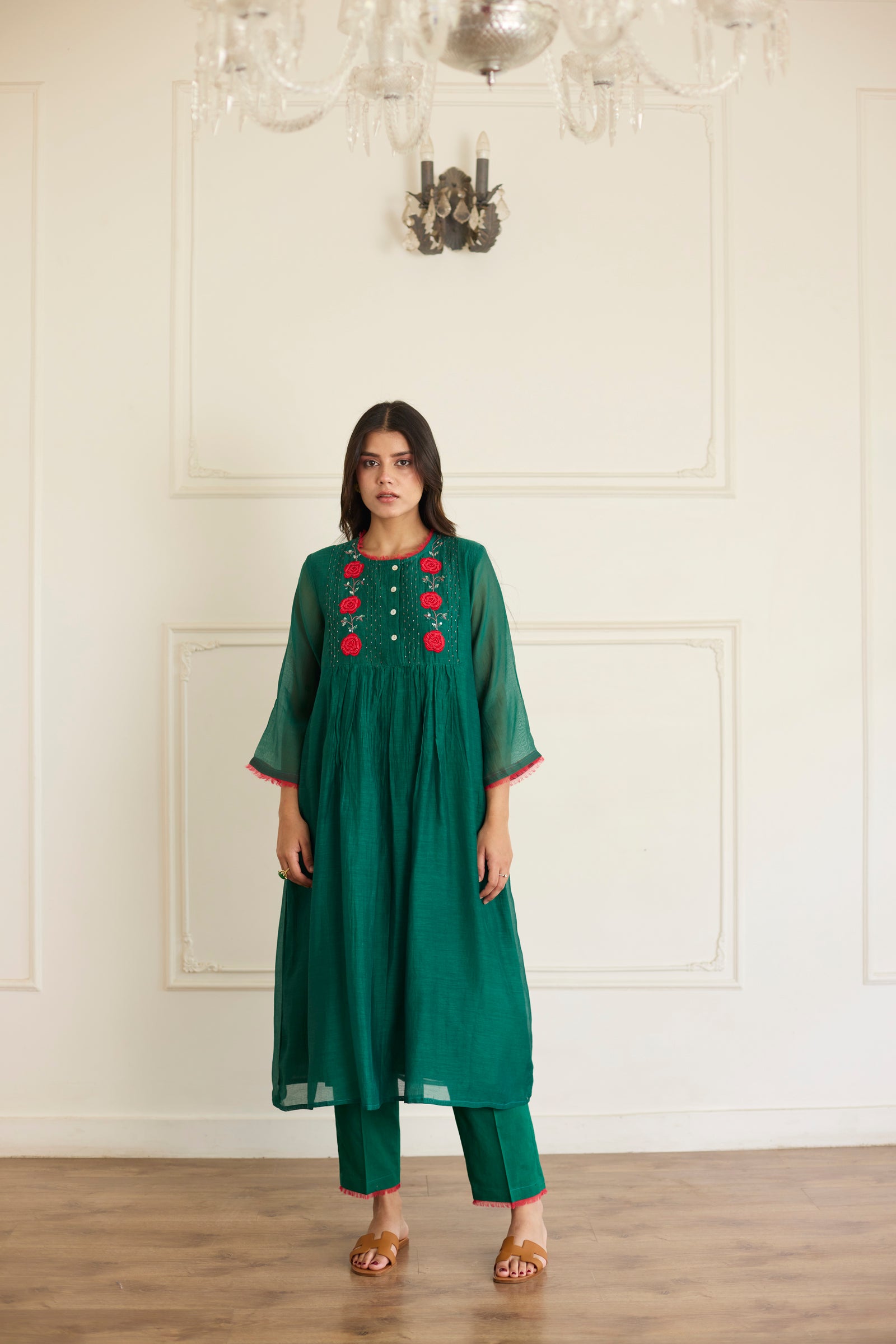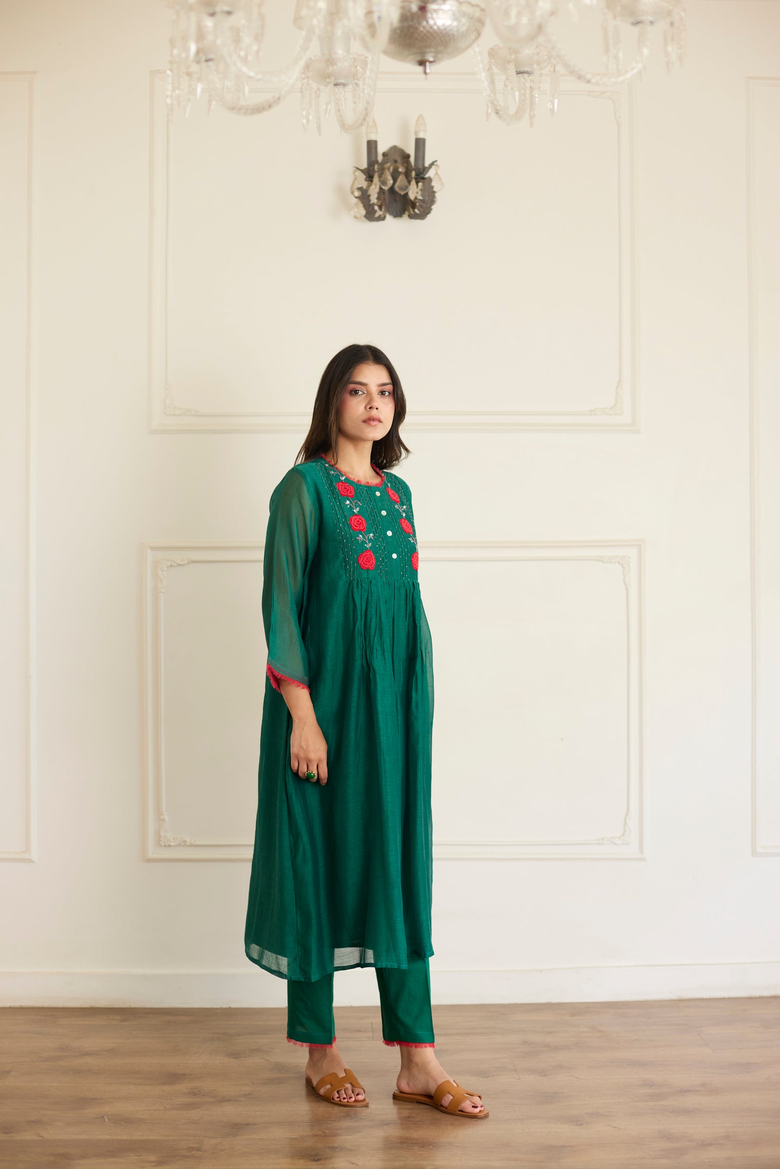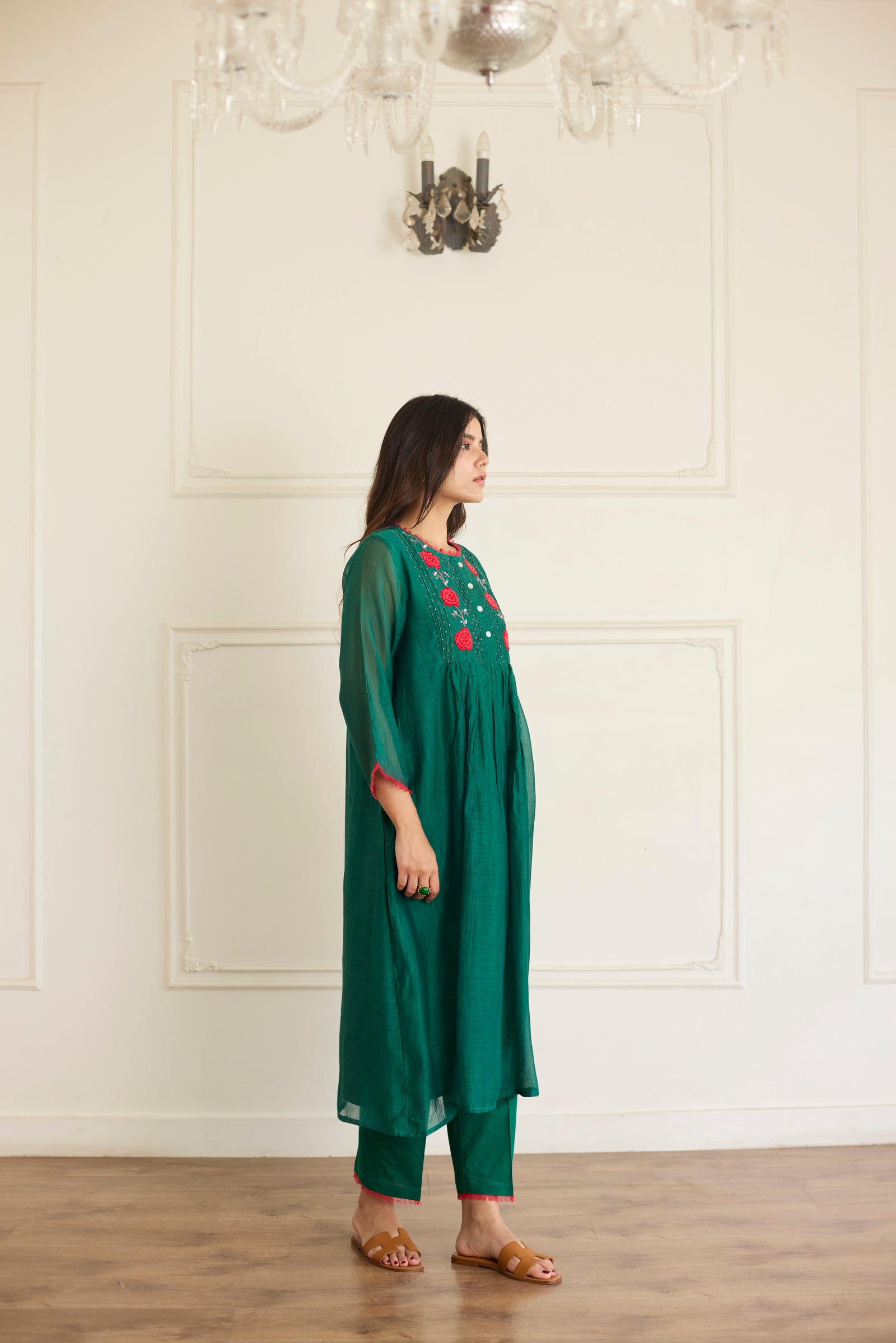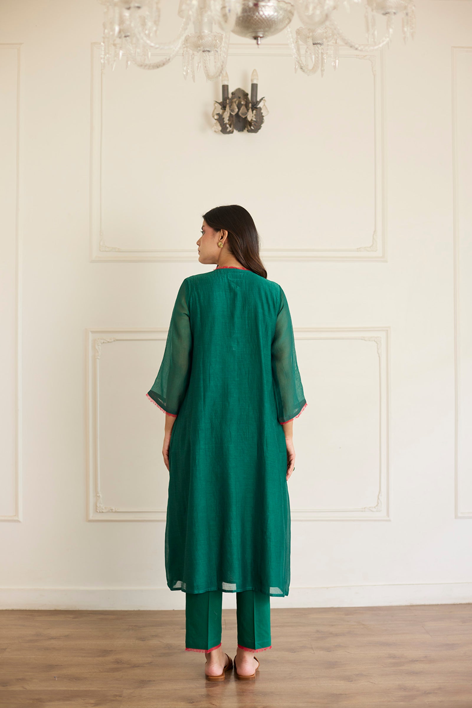 This relaxed-fit handwoven Chanderi co-ord features hand embroidery with Resham, sequins, and glass beads adorning the neckline and sleeves, paired with soft cotton trousers for effortless comfort and ease of movement. Each handcrafted piece carries the artisan's signature through unique variations in embroidery and color—celebrating the soulful beauty of handmade craftsmanship.