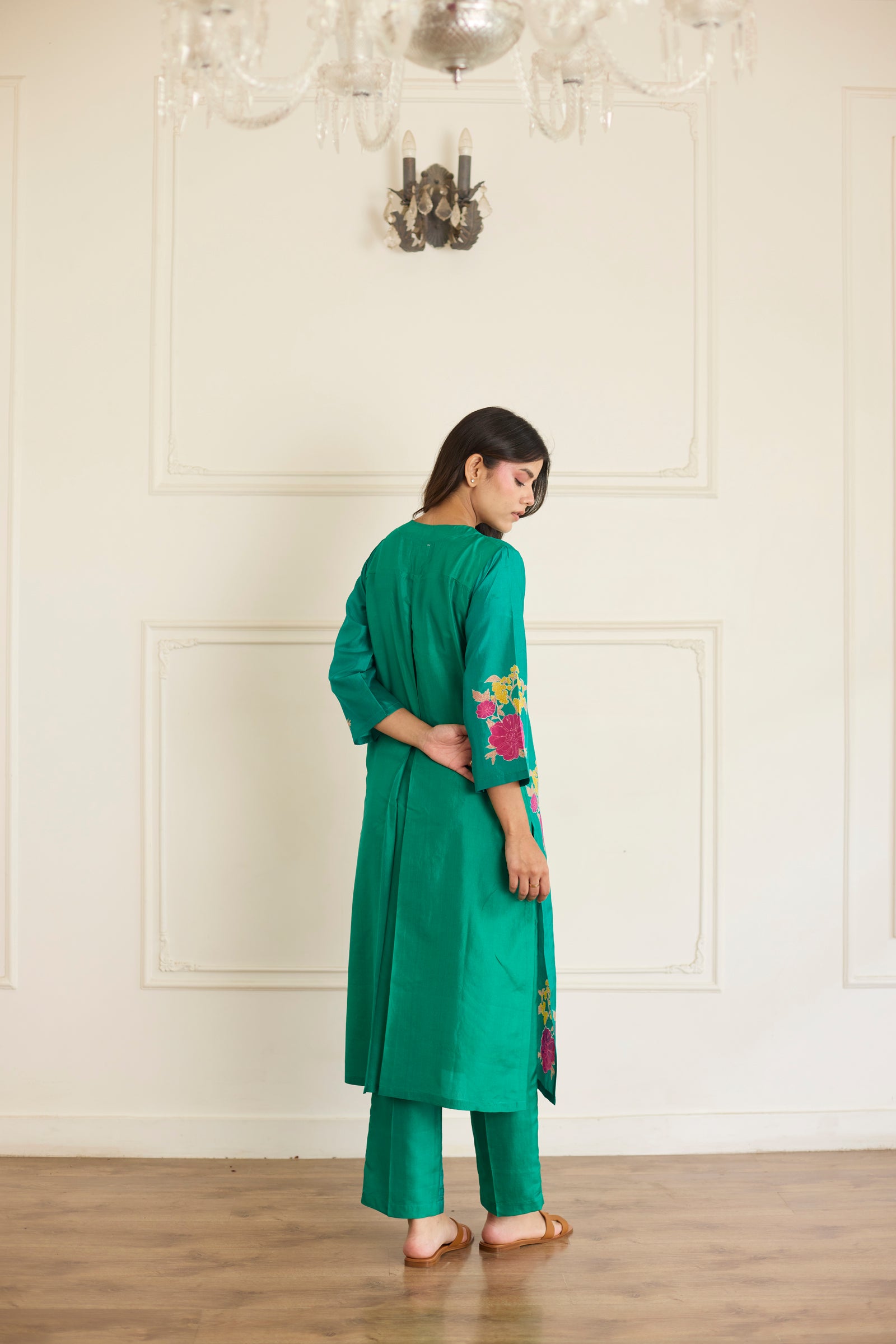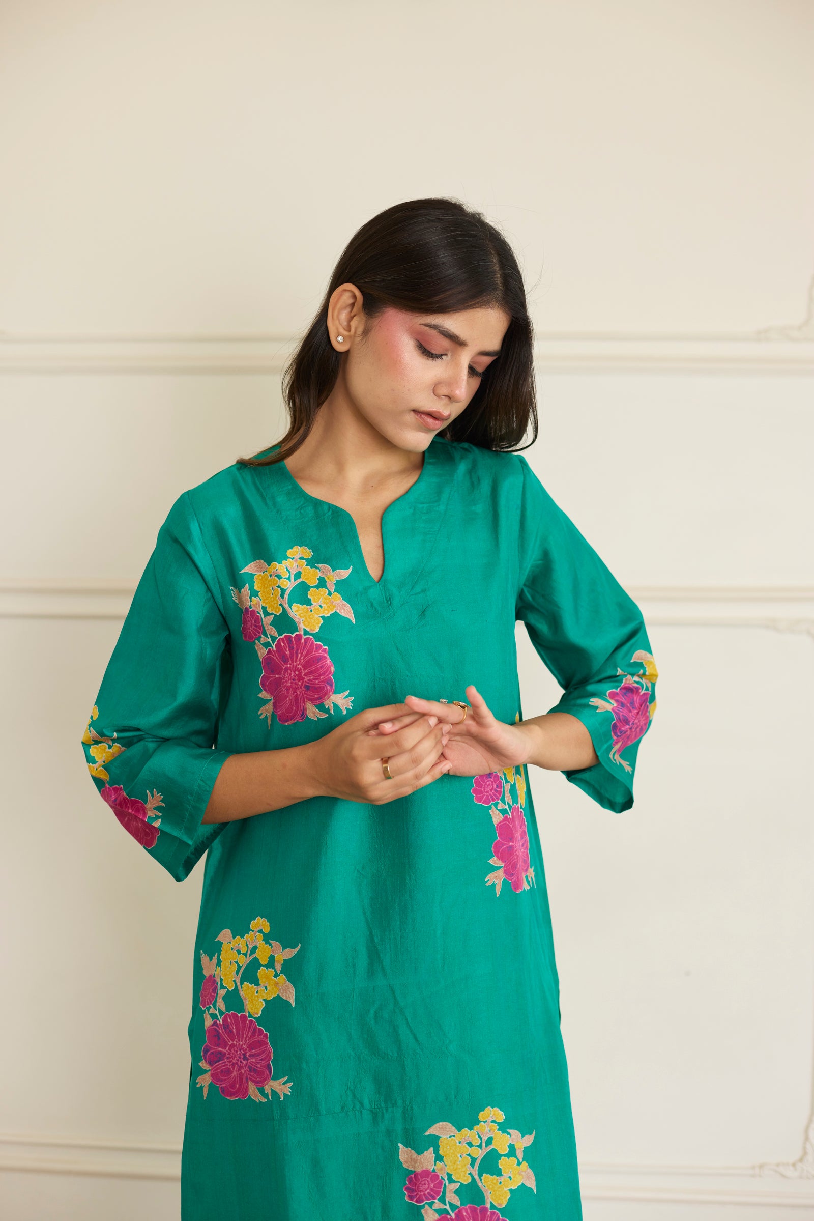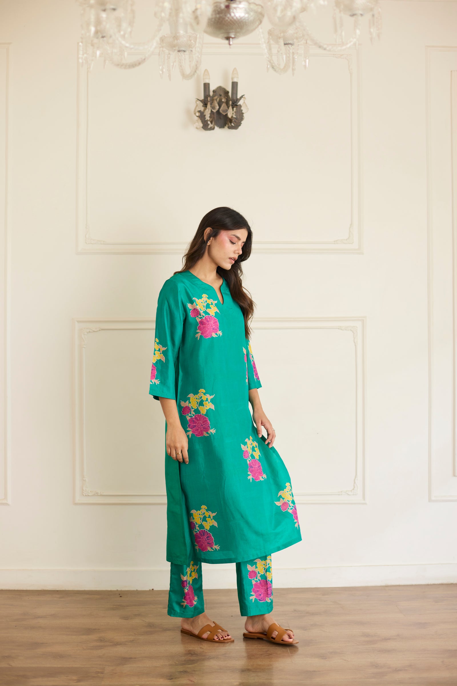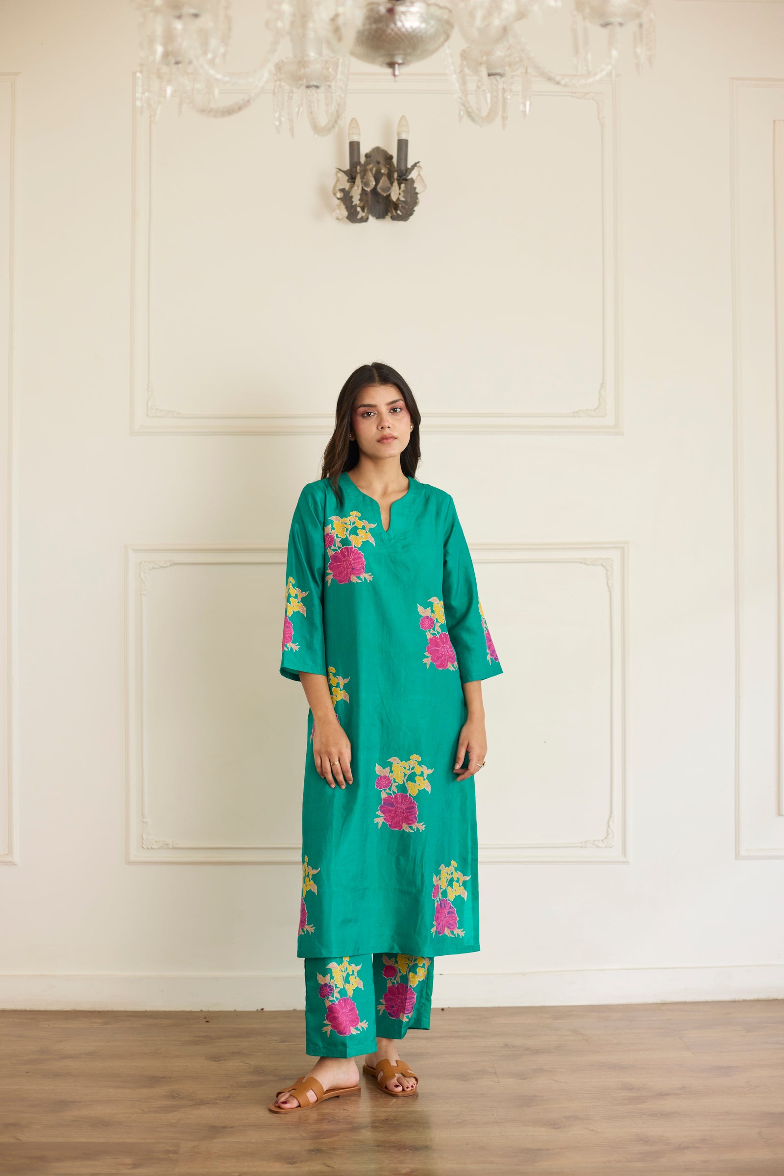 This handcrafted silk co-ord features hand block prints on both the relaxed-fit top and matching silk trousers, with the fluid drape and effortless silhouette blending traditional craftsmanship with contemporary style. Each piece is handcrafted with care, showcasing the artisan's skill through unique block print variations.