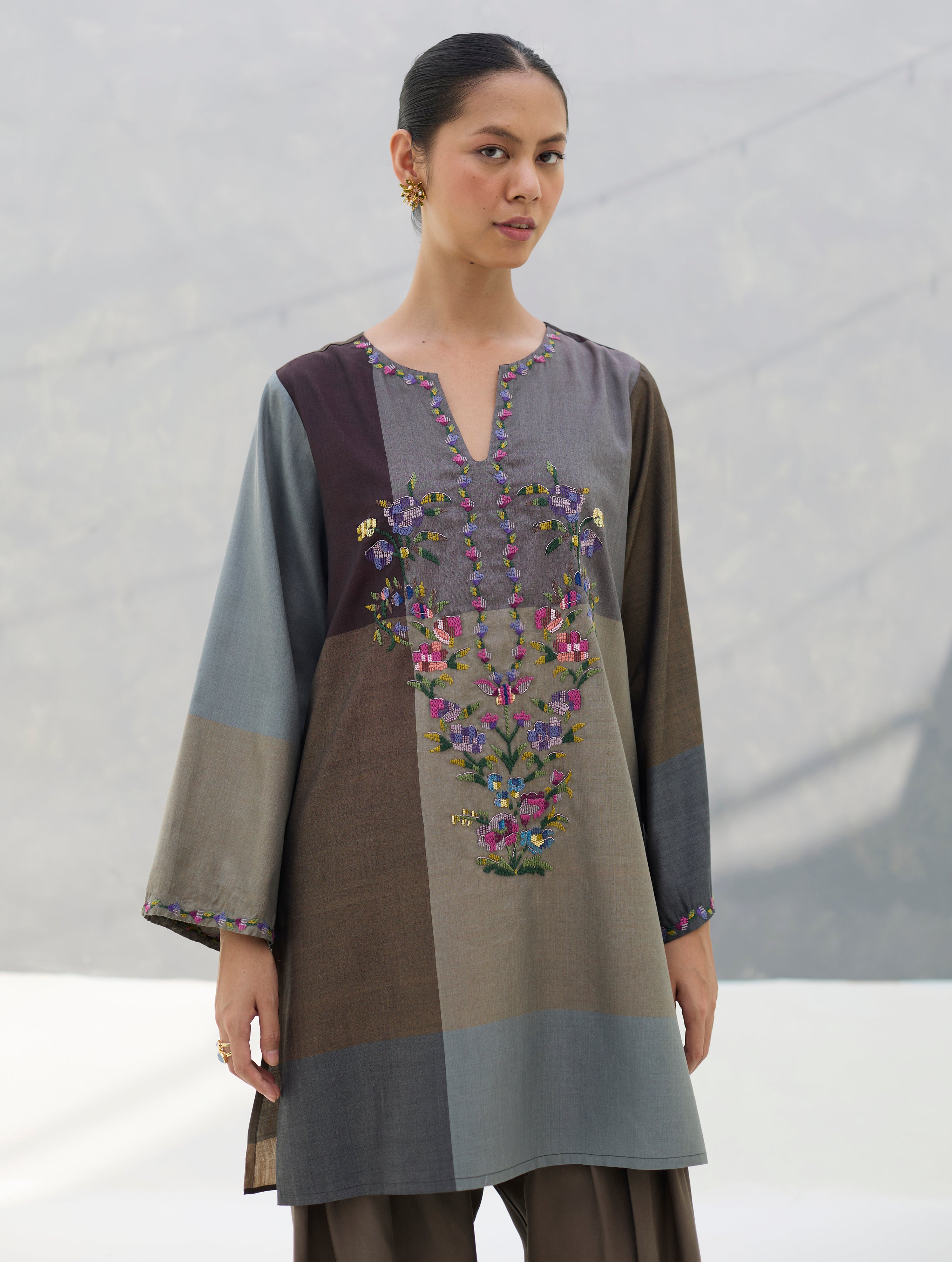Kurta - The Athiya kurta is handcrafted in our timeless eri (ahimsa) silk with a woven oversized colour-block check pattern in 4-5 colour tones.The beautiful Athiya silhouette is intricately embroidered with multi-coloured hand-work inspired from 18th Century Victorian textiles, made in the form of pixelated floral motifs placed thoughtfully at the yoke. The modern take on embroidery is enhanced texturally using varying thread-embroidery techniques and subtle beadwork. Highlighted dabka accents—traditional zari work—add a metallic sheen to the embroidery. The full bell sleeves are finished with thoughtful embroidery detailing at the hem. An easy, yet statement, kurta that works well for various formal and informal gatherings Pant - This vibrant Farsi salwar is crafted from soft luxurious Mulberry silk, featuring a comfortable, voluminous silhouette that tapers gently at the ankle. A striking contrast border at the bottom hem provides a sharp, polished finish. Dupatta - This meticulously handwoven dupatta is made in a lightweight soft eri (ahimsa) silk, with a colour-block check pattern weave in 4-5 colours. The careful paneling creates a sophisticated, multi-hued pattern. The dupatta is finished with a woven metallic border along the edges further accented with hand-embroidered beadwork along the corners.