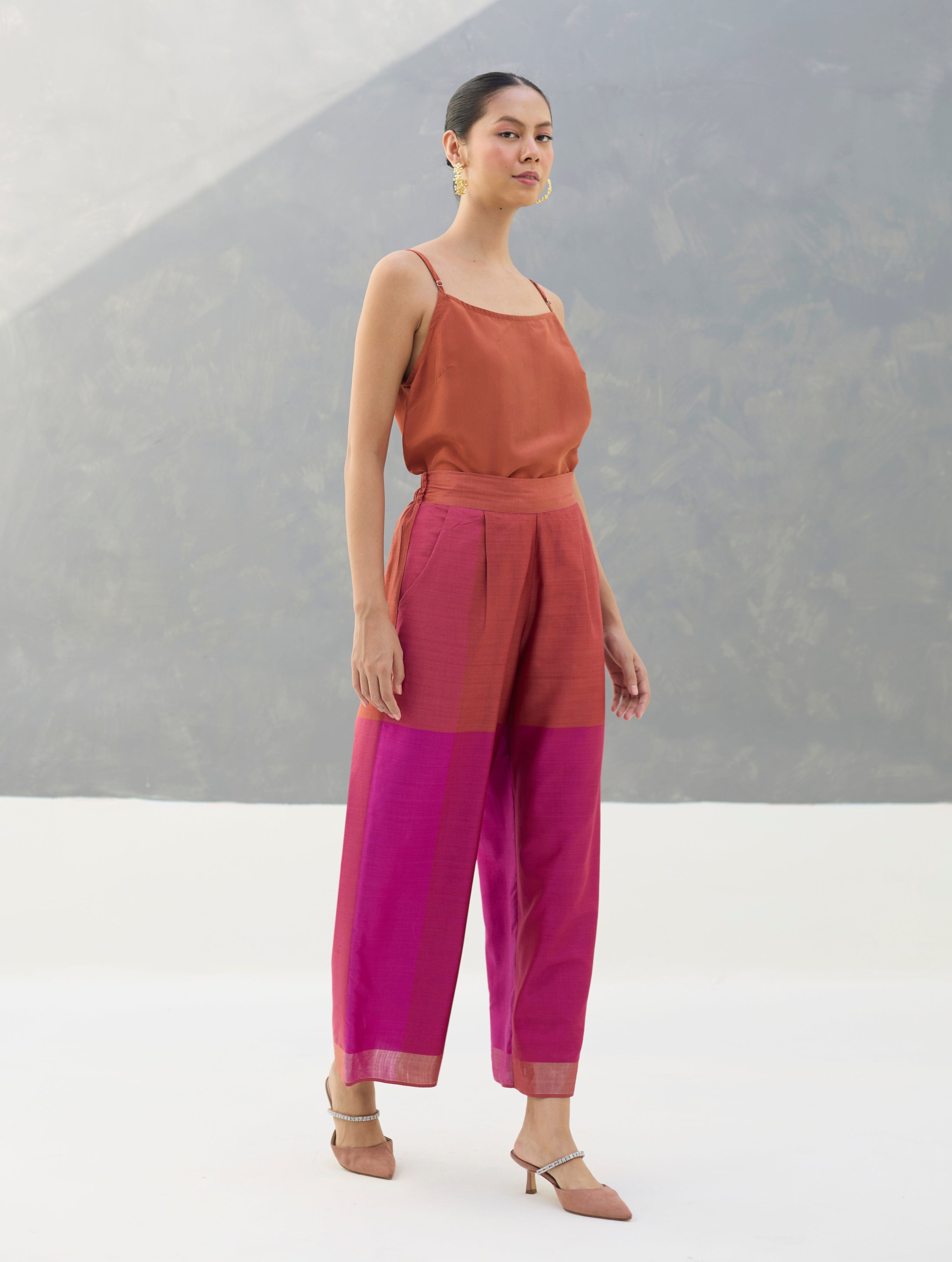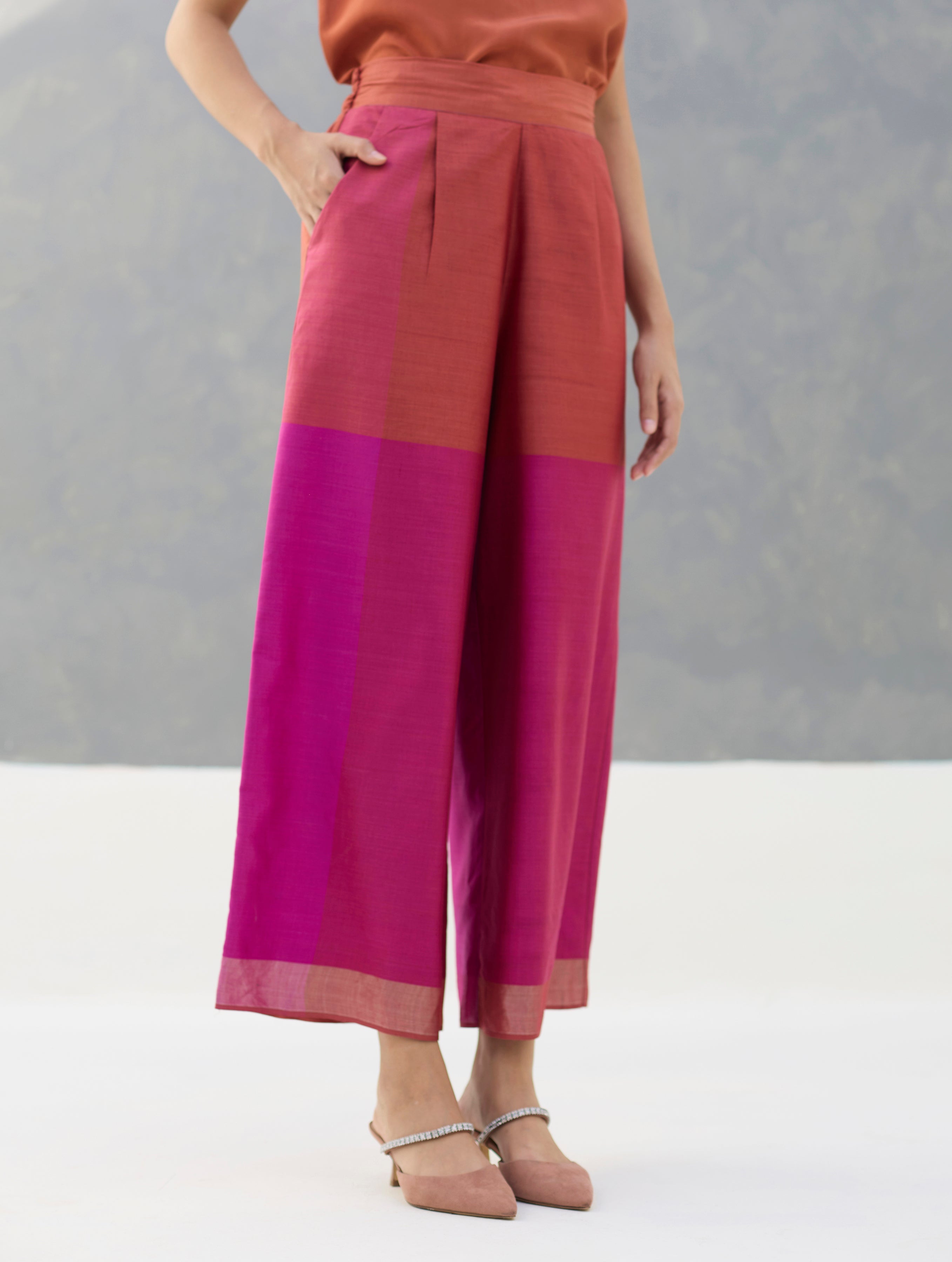 The versatile culotte is crafted in our soft handloom eri (ahimsa) silk, woven as an oversized colour-block check pattern in 4-5 shades. Designed for comfort and functionality, the culottes include a back elasticated waistband with an inside drawstring for an adjustable fit, as well as comfortable pockets. The piece is intricately finished with a subtle woven metallic border at the hem.