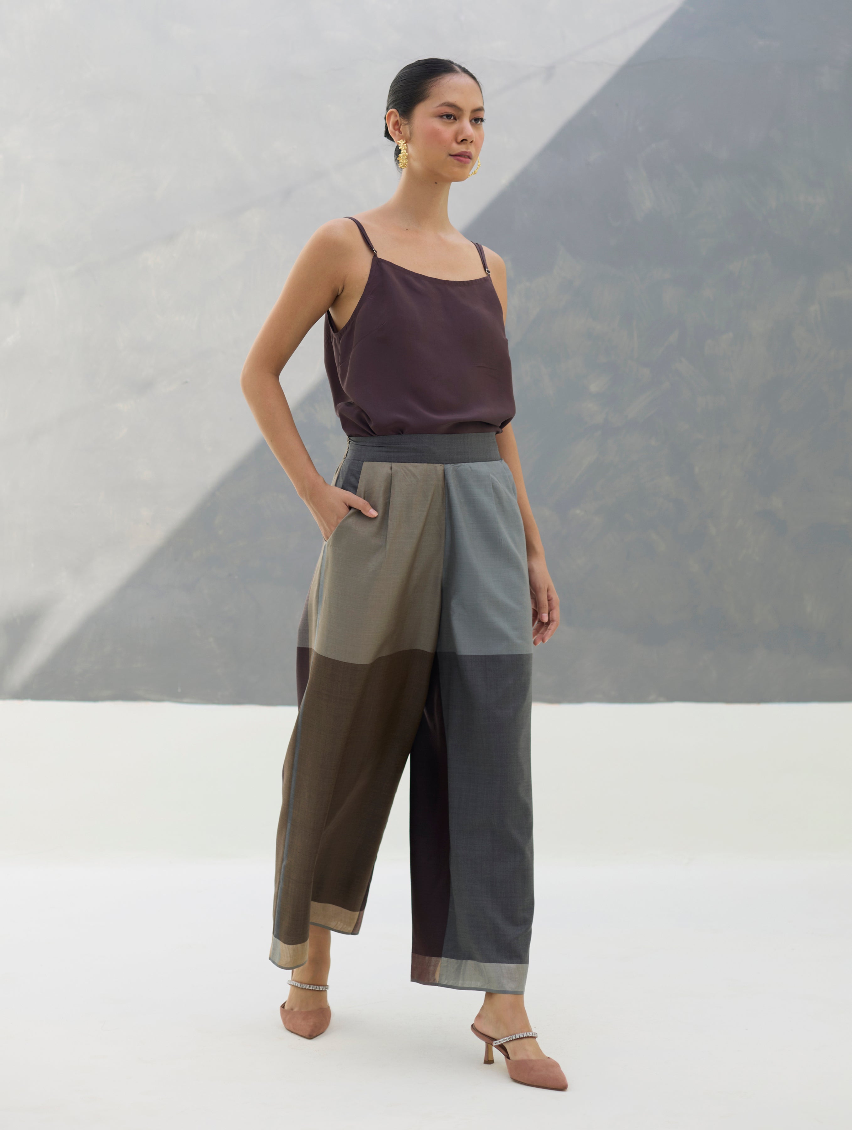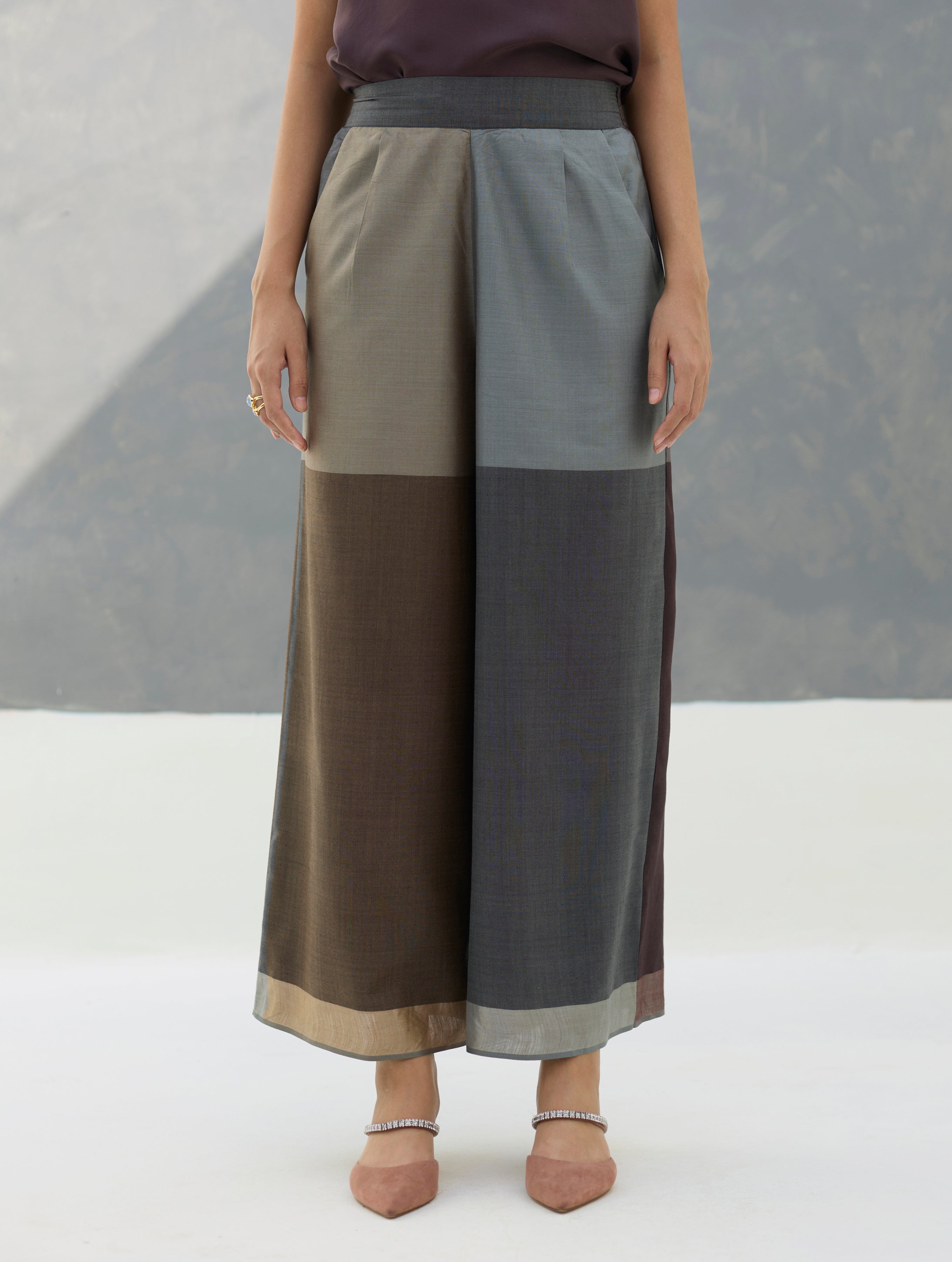 The versatile culotte is crafted in our soft handloom eri (ahimsa) silk, woven as an oversized colour-block check pattern in 4-5 shades. Designed for comfort and functionality, the culottes include a back elasticated waistband with an inside drawstring for an adjustable fit, as well as comfortable pockets. The piece is intricately finished with a subtle woven metallic border at the hem.