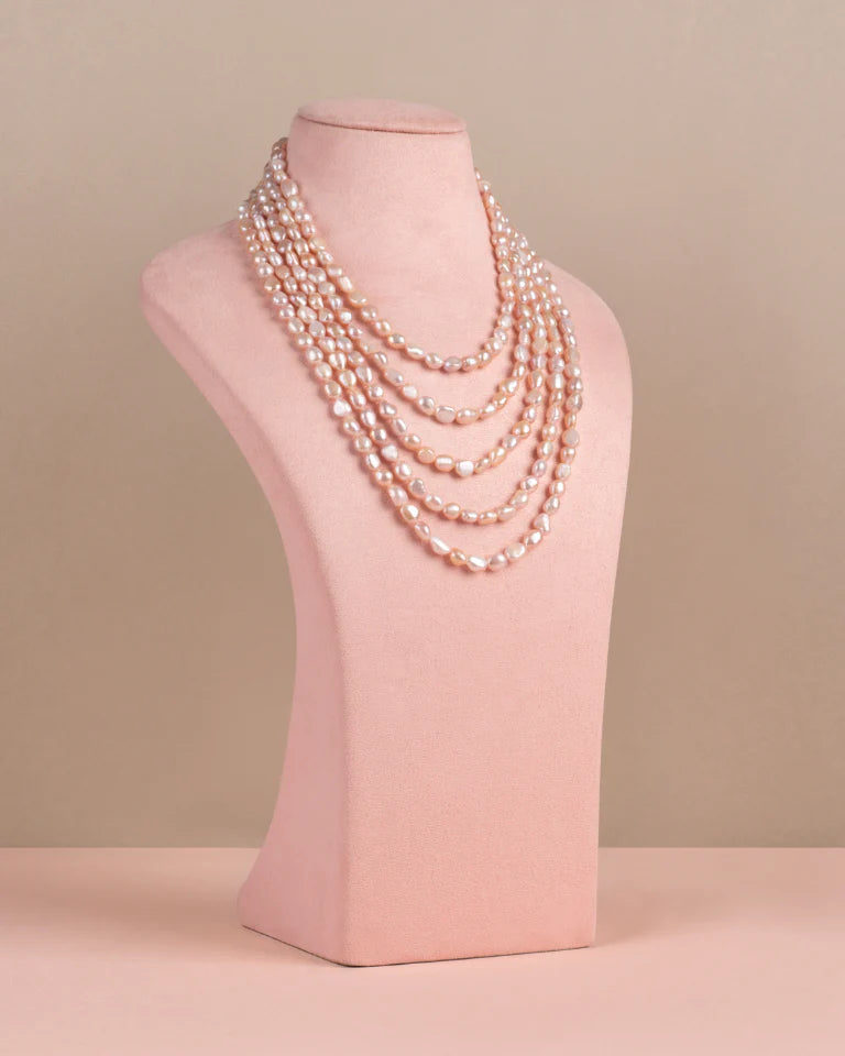 This layered necklace features natural pink baroque pearls in varying sizes, creating a multi-dimensional, elegant design that combines organic shapes with a sophisticated, versatile style perfect for both everyday wear and special occasions