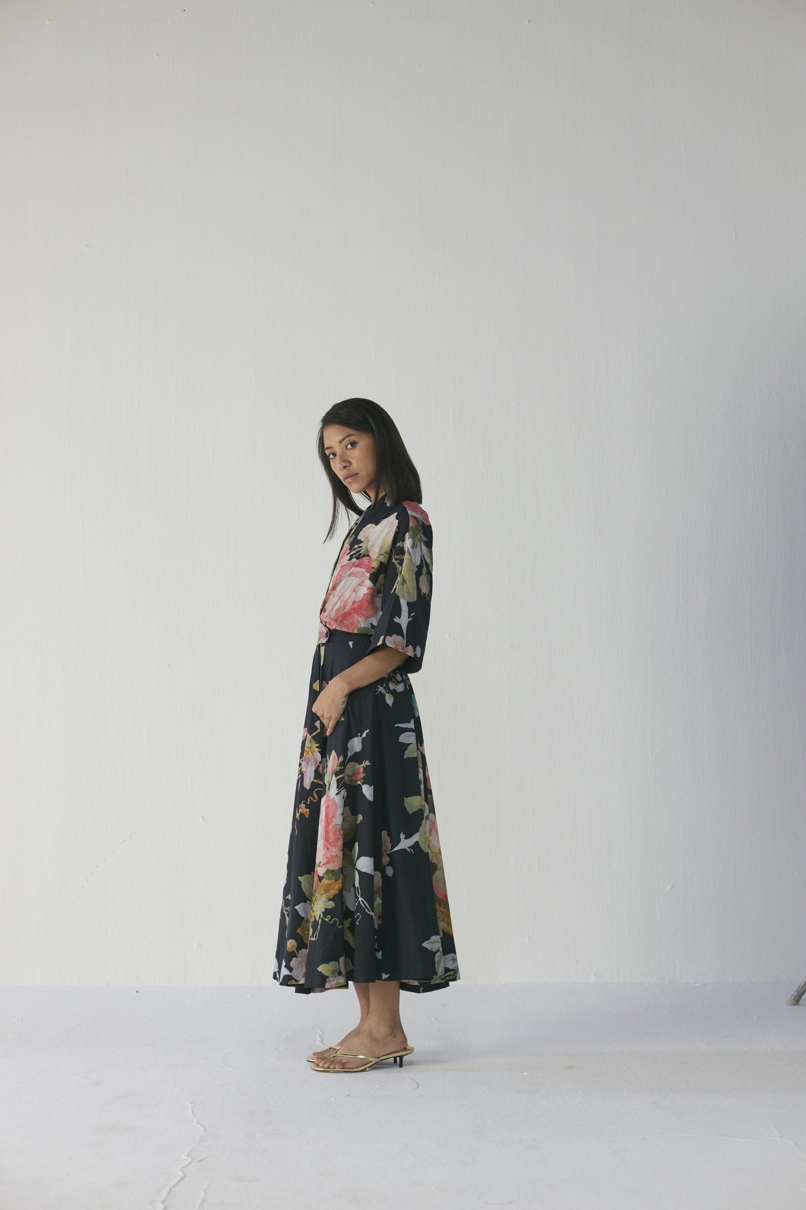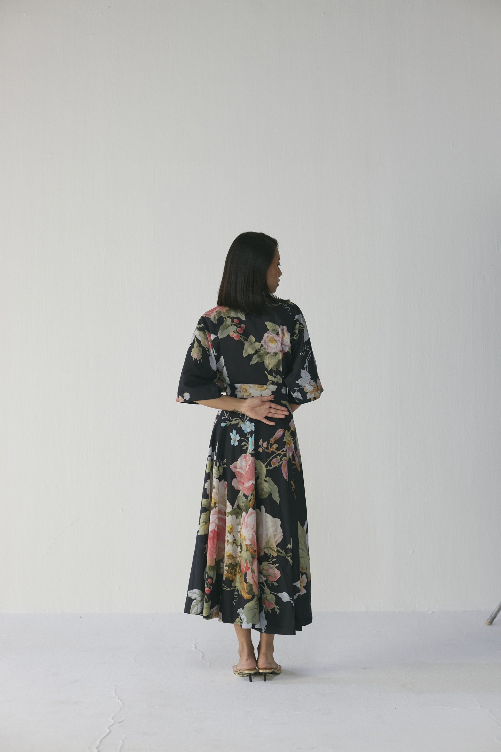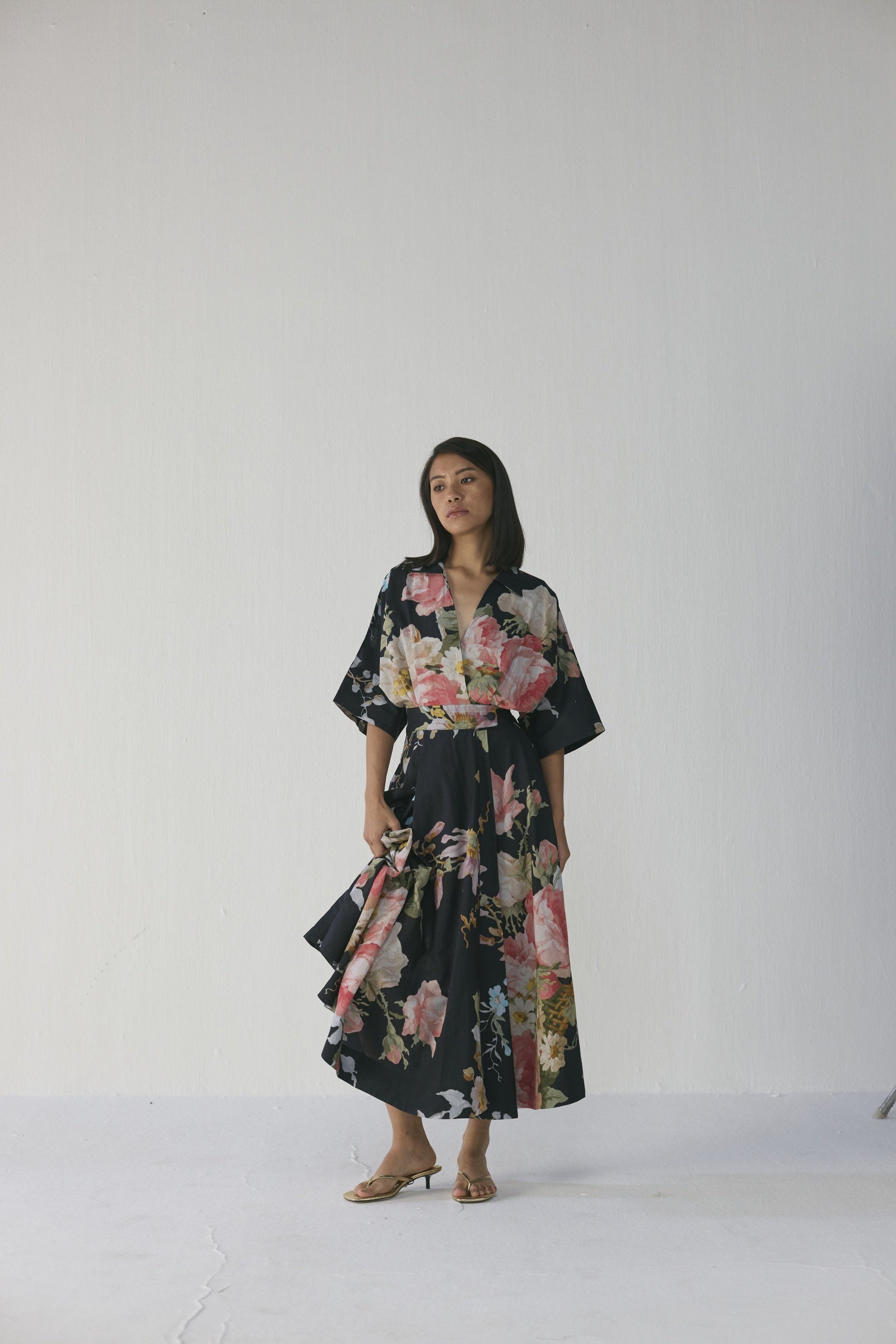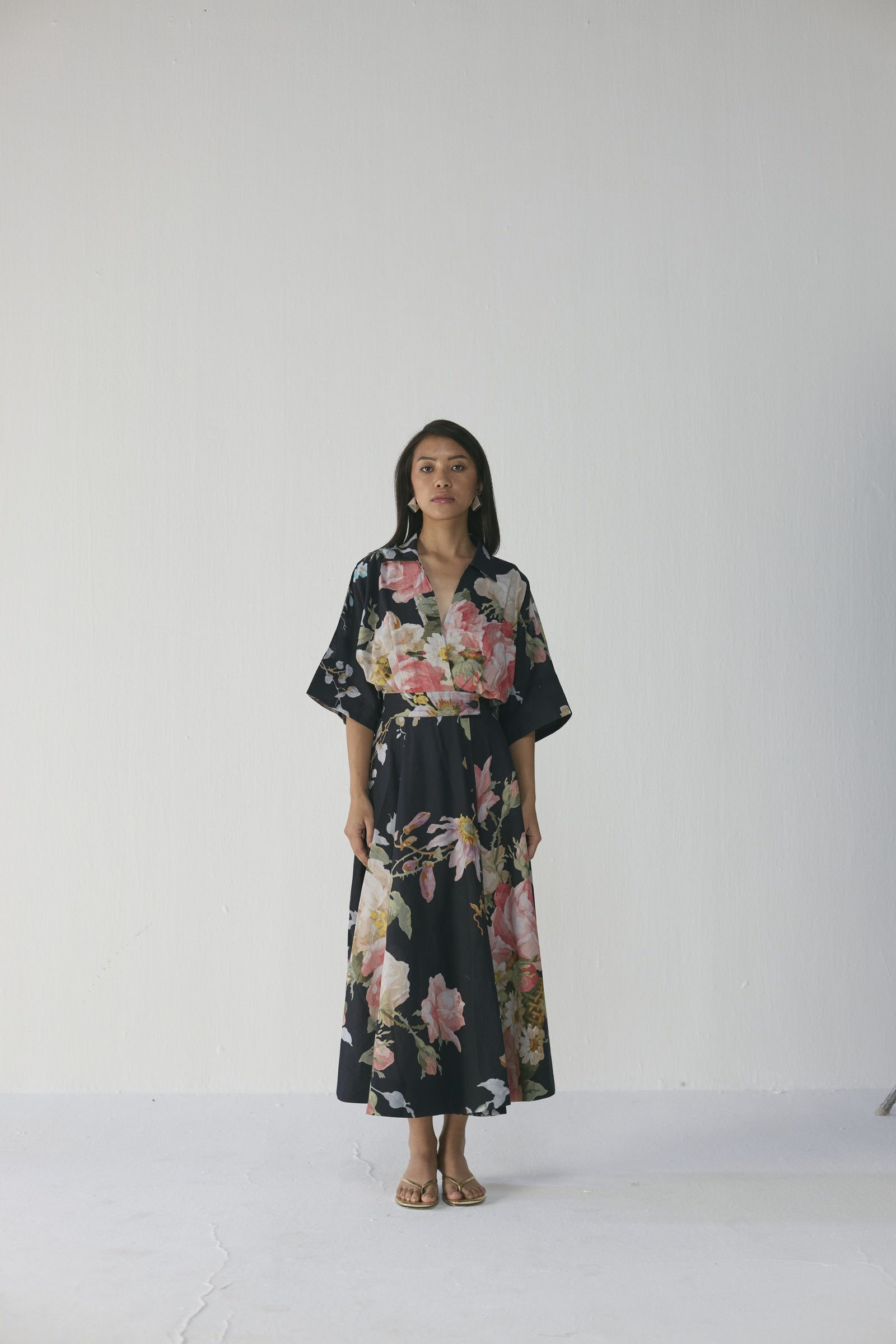 This flowy floral dress showcases a striking large-scale painterly print of blooming roses and delicate foliage in blush pink, ivory, sage green, and powder blue set against a deep black base, crafted in lightweight poplin with a relaxed-fit bodice, elegant V-neckline, wide kimono sleeves, and a fluid ankle-length flare that moves beautifully, offering effortless comfort and timeless sophistication from day to evening; the model is 5'9" and wearing a size small.