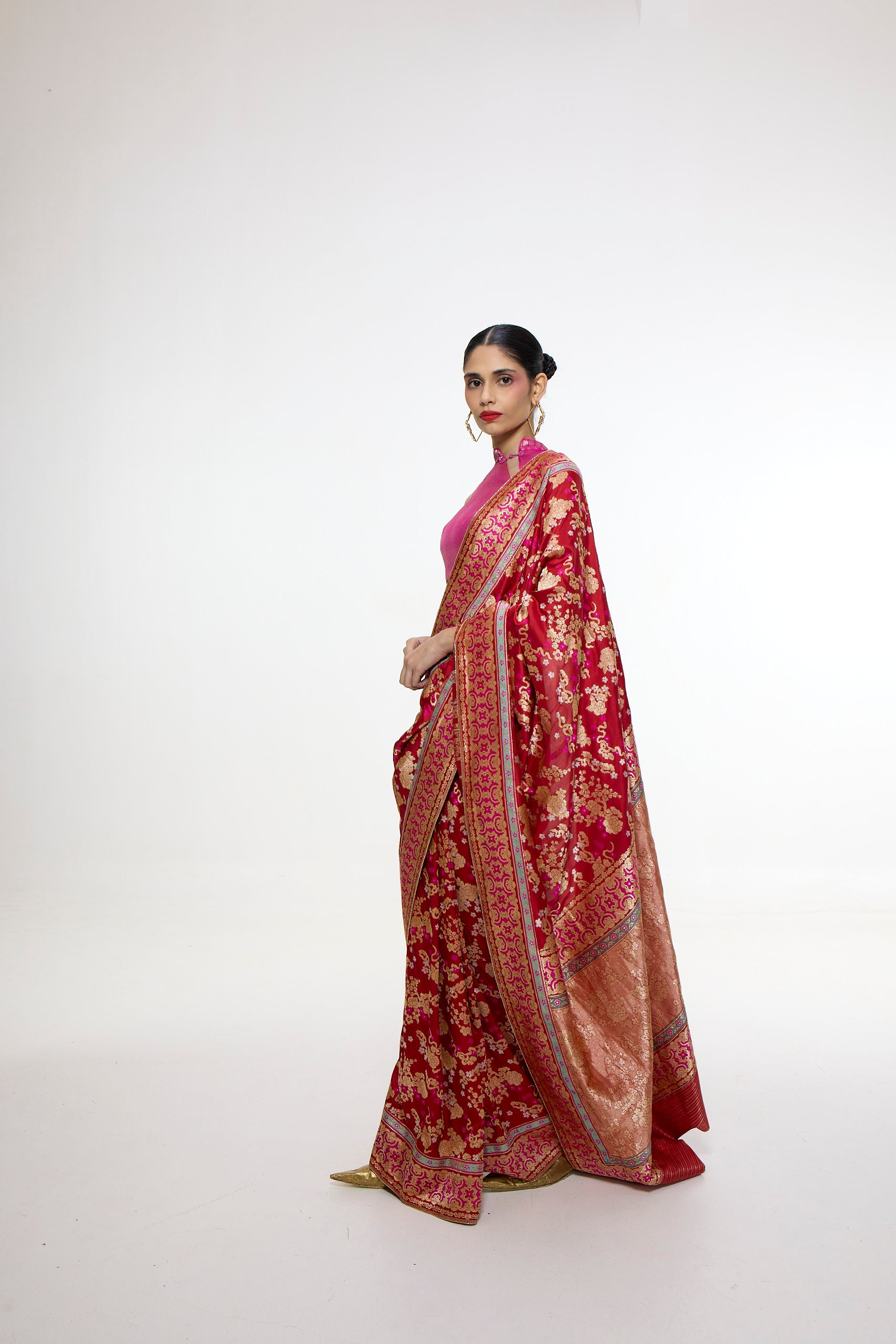 Our Handwoven Ruby Red Mashroo Silk Sari from the Silk Dialogue collection celebrates the playful dance between Oriental culture and Banarasi heritage—where motifs, ideas, and techniques come together through a craft-centric lens. Handwoven in the Kadhwa Banarasi technique and crafted from the softest, most fluid satin silk, this ruby red masterpiece features intricate Oriental-inspired motifs, offering endless styling possibilities. We recommend cinching the sari at the waist with a handwoven Banarasi belt to create a structured, elegant look—perfect for festive celebrations and wedding occasions, this sari ensures all eyes are on you.