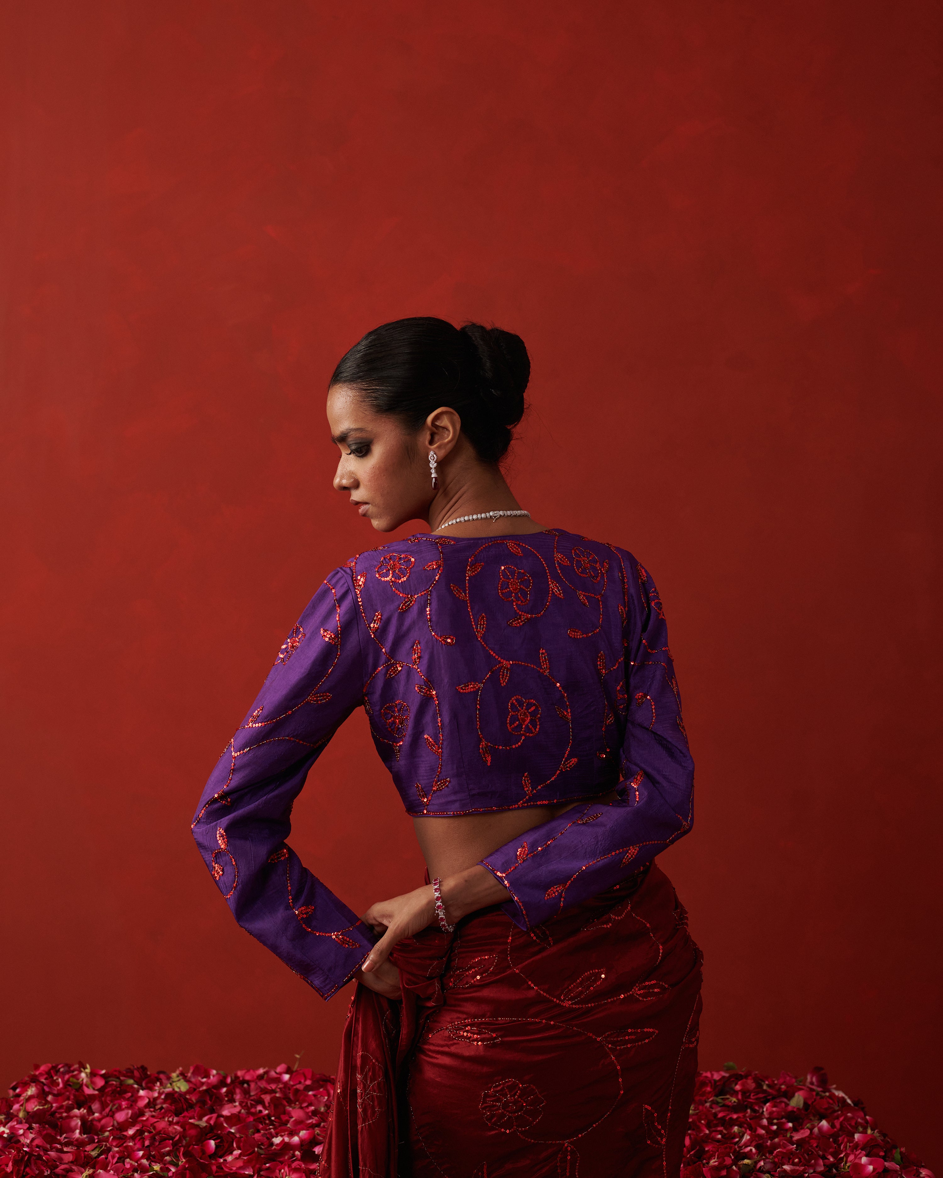 Crafted in a jewel-toned silk, the ‘Ziya’ blouse features a classic round neckline and full-length sleeves. The surface is delicately hand-embroidered with tonal sequin vines and floral motifs that flow across the body and arms in subtle, glimmering patterns. A fitted silhouette with a cropped length and clean, structured back completes this timeless piece-one that balances tradition with quiet glamour. Pair it with the 'Laal Ishq' sari or style it with contrast tones for festive evenings.