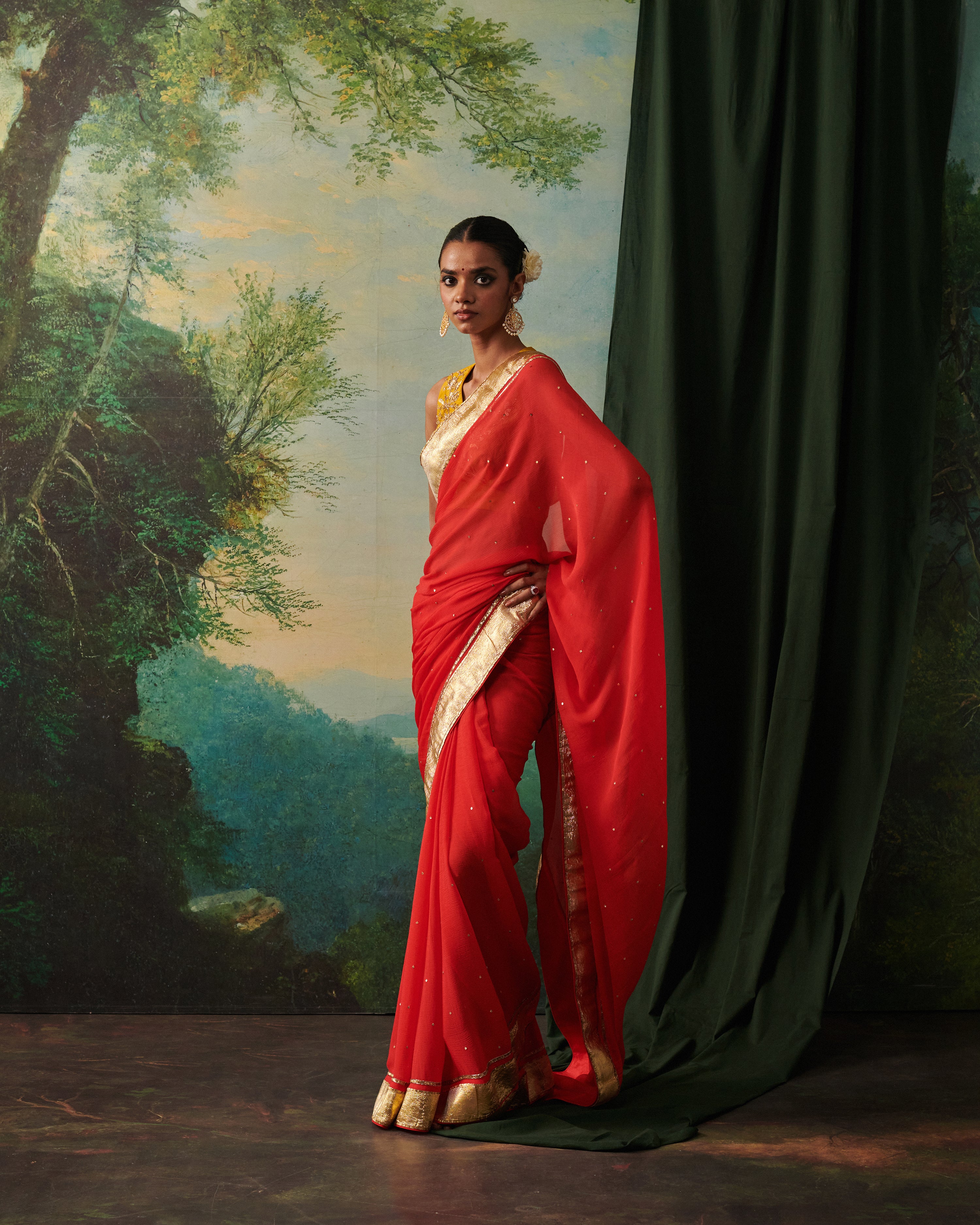 Fida' sari in pure chiffon, finished with a broad gold lappa lace border and delicate hand embroidery in sequins scattered like dew across its length. The sheer fabric flows effortlessly, catching light with every fold, while the contrast gold adds richness to the otherwise minimal palette. Paired here with the yellow 'Nimbu' blouse, it brings together classic romance with a hint of play.This sari is a celebration of timeless elegance-simple yet striking, perfect for moments that deserve a little shimmer without saying too much.