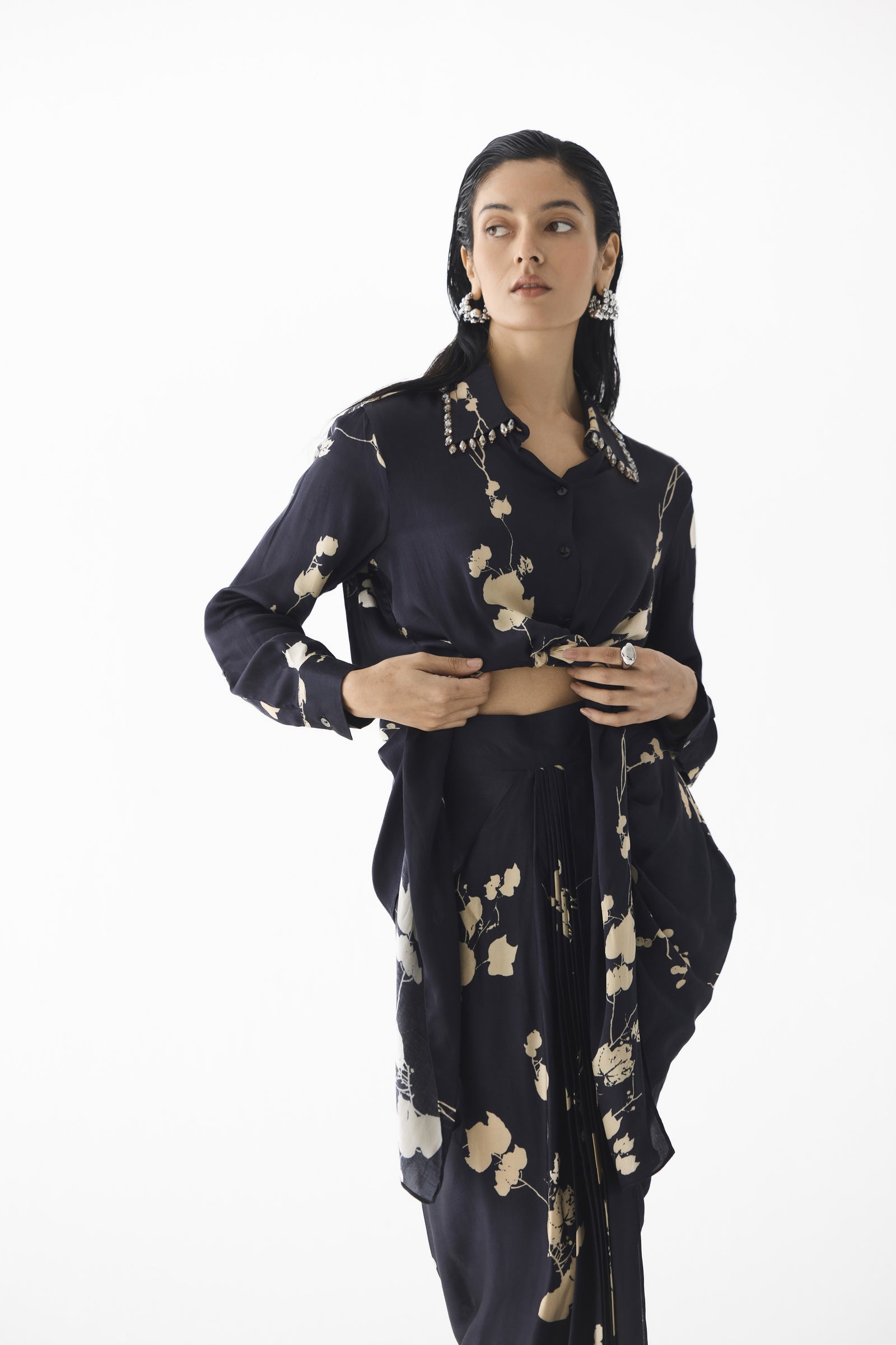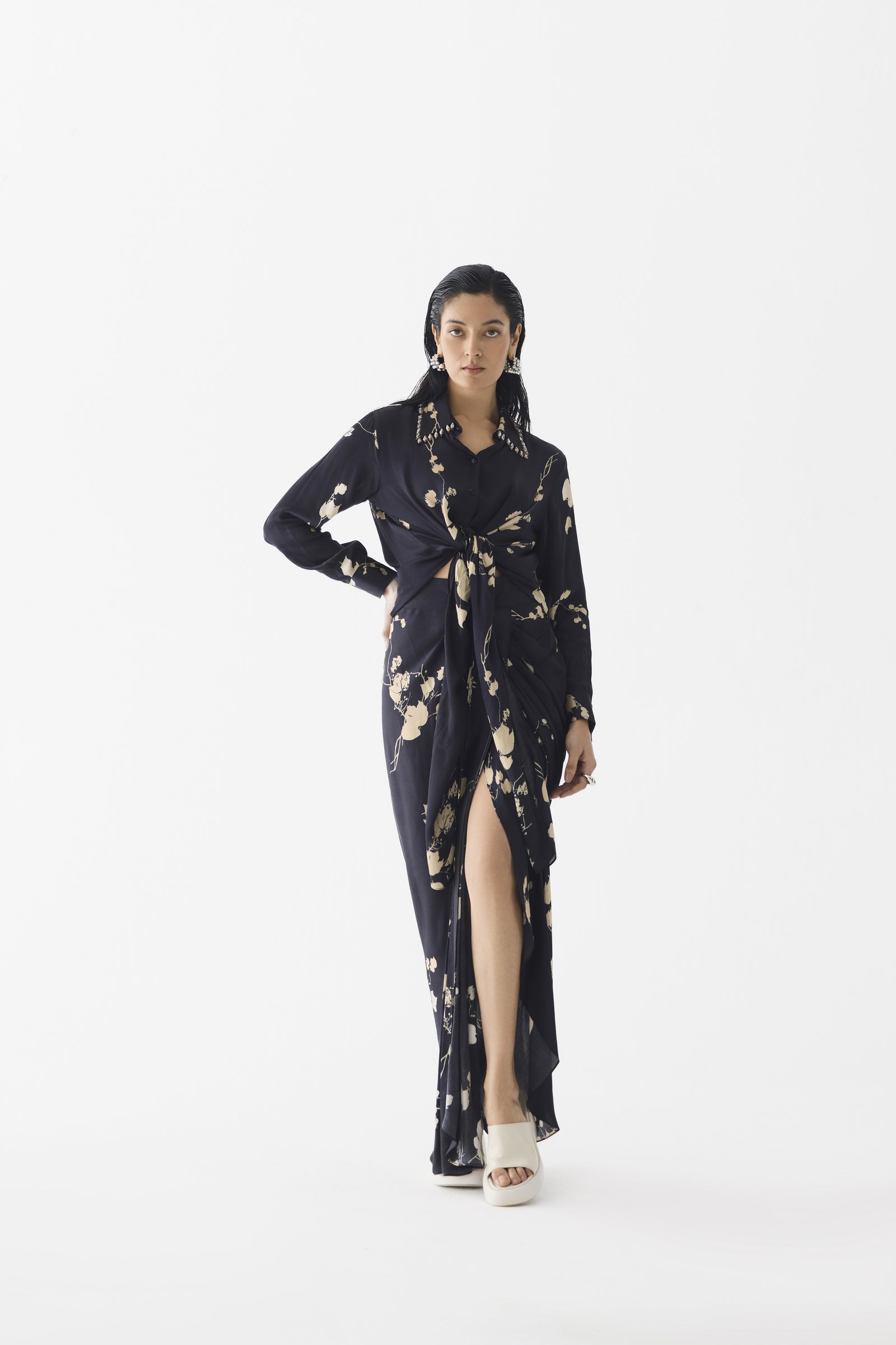The Black Sakura Crop Top & Skirt, crafted from stunning trans-seasonal vegan silk, are a statement two-piece set featuring a chic black sakura flower print, a crop top with a waist knot and hanging Swarovski detailing on the collar, paired with a matching black sakura draped skirt with a front slit and side zipper, creating an elegant look when styled with heels; the model is wearing a size S and is 5'8".