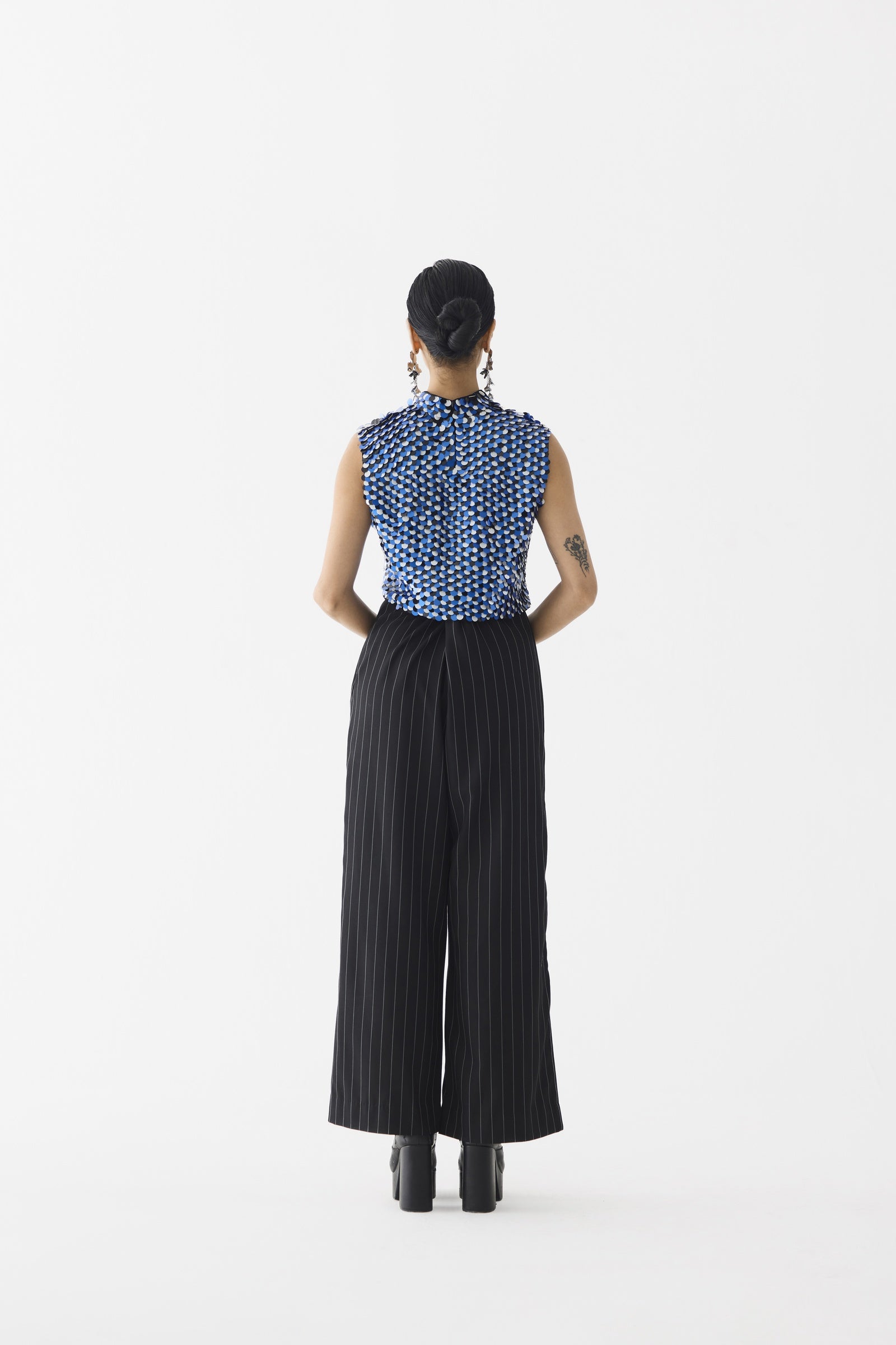 The Blue Paradise Sequin Top, crafted from stunning trans-seasonal organza, is a statement blouse hand-embroidered with tricolour sequins inspired by the birds of paradise flower, featuring a sleeveless silhouette with side zippers, a high-neck collar with back hooks, and a chic finish that pairs beautifully with black contrast suiting pants and heels for an elegant look; the model is wearing a size S and is 5'10".