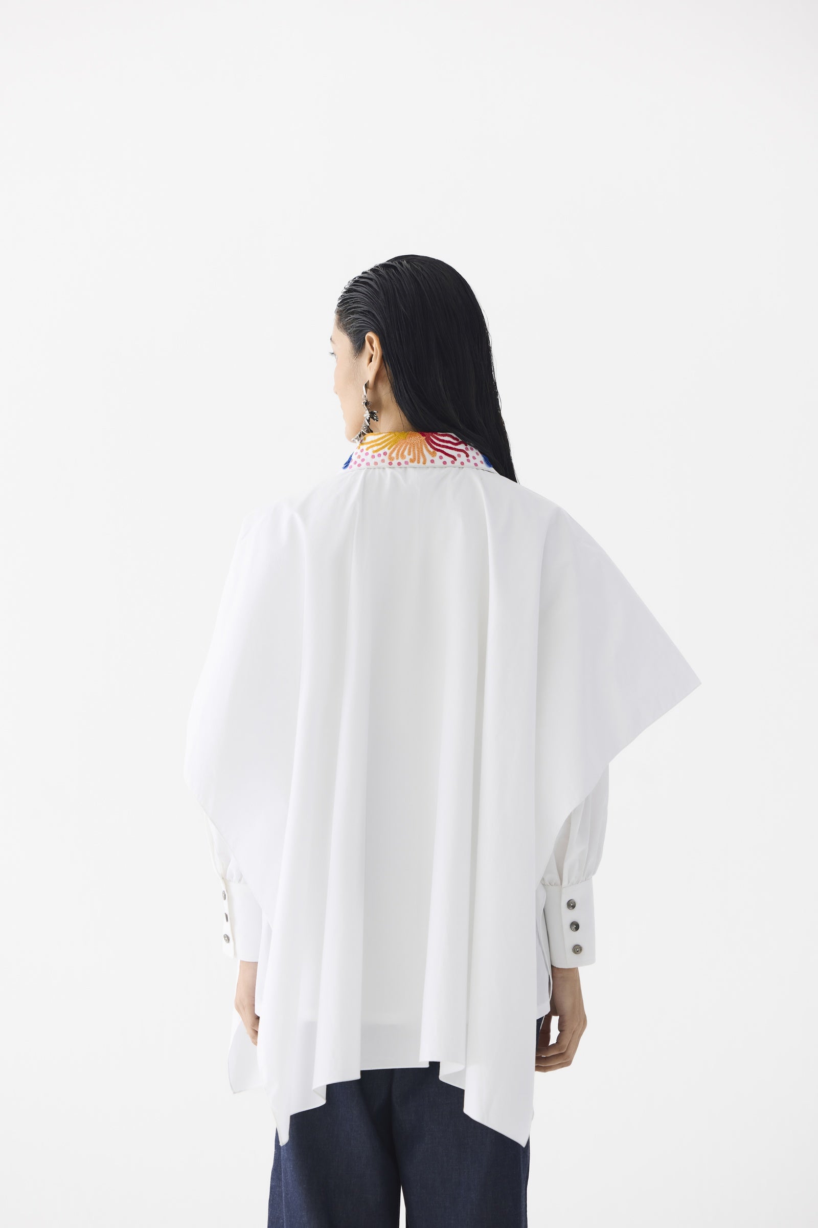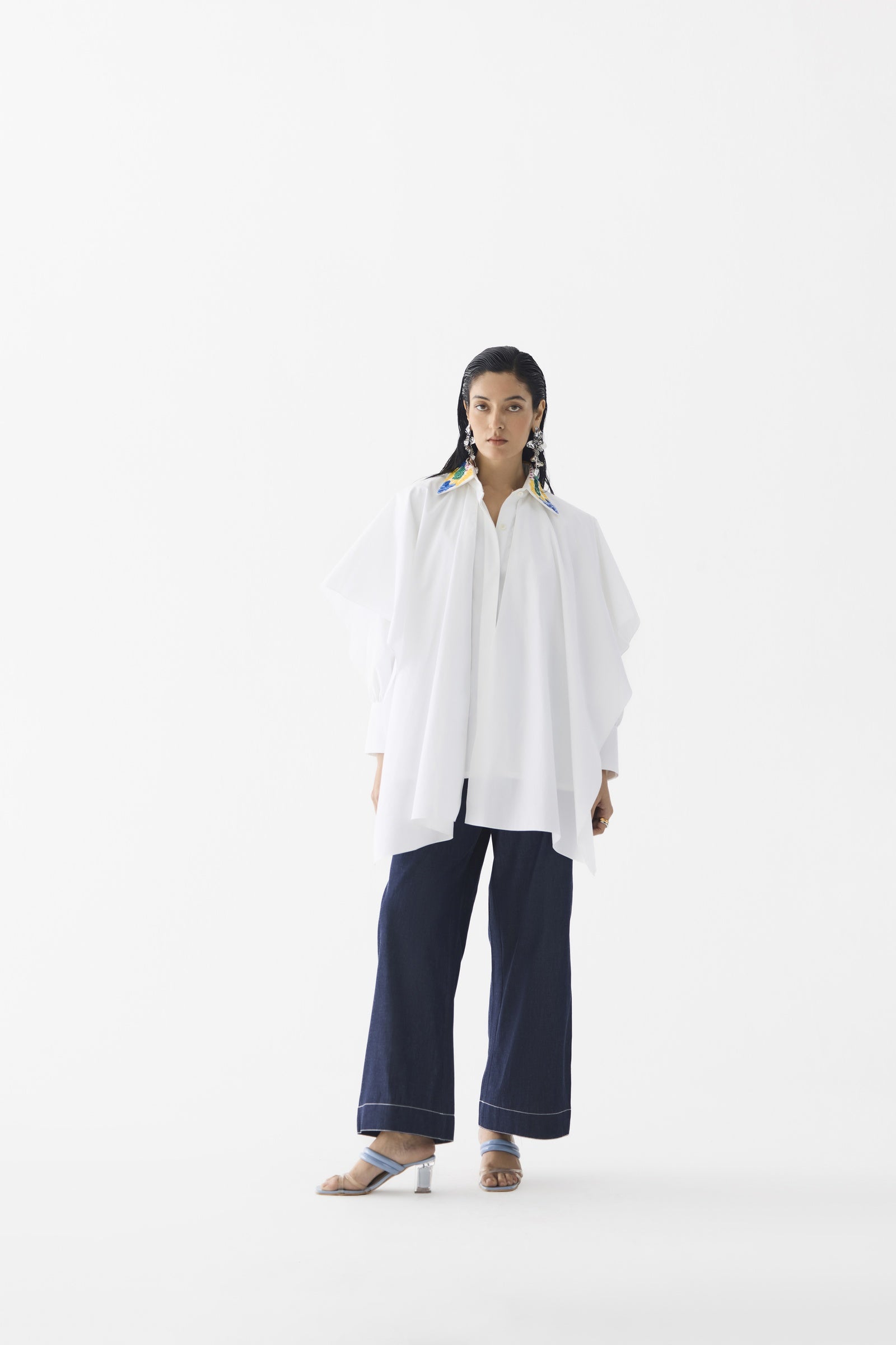 The Calla Layered Poplin Shirt, crafted from stunning trans-seasonal pure white poplin, features an asymmetric fit with a front opening, a multi-coloured sequin-embroidered collar, and a unique double-layered design, making it a statement piece that pairs effortlessly with denims or black pants and looks elegant when styled with heels; the model is wearing a size M and is 5'10".
