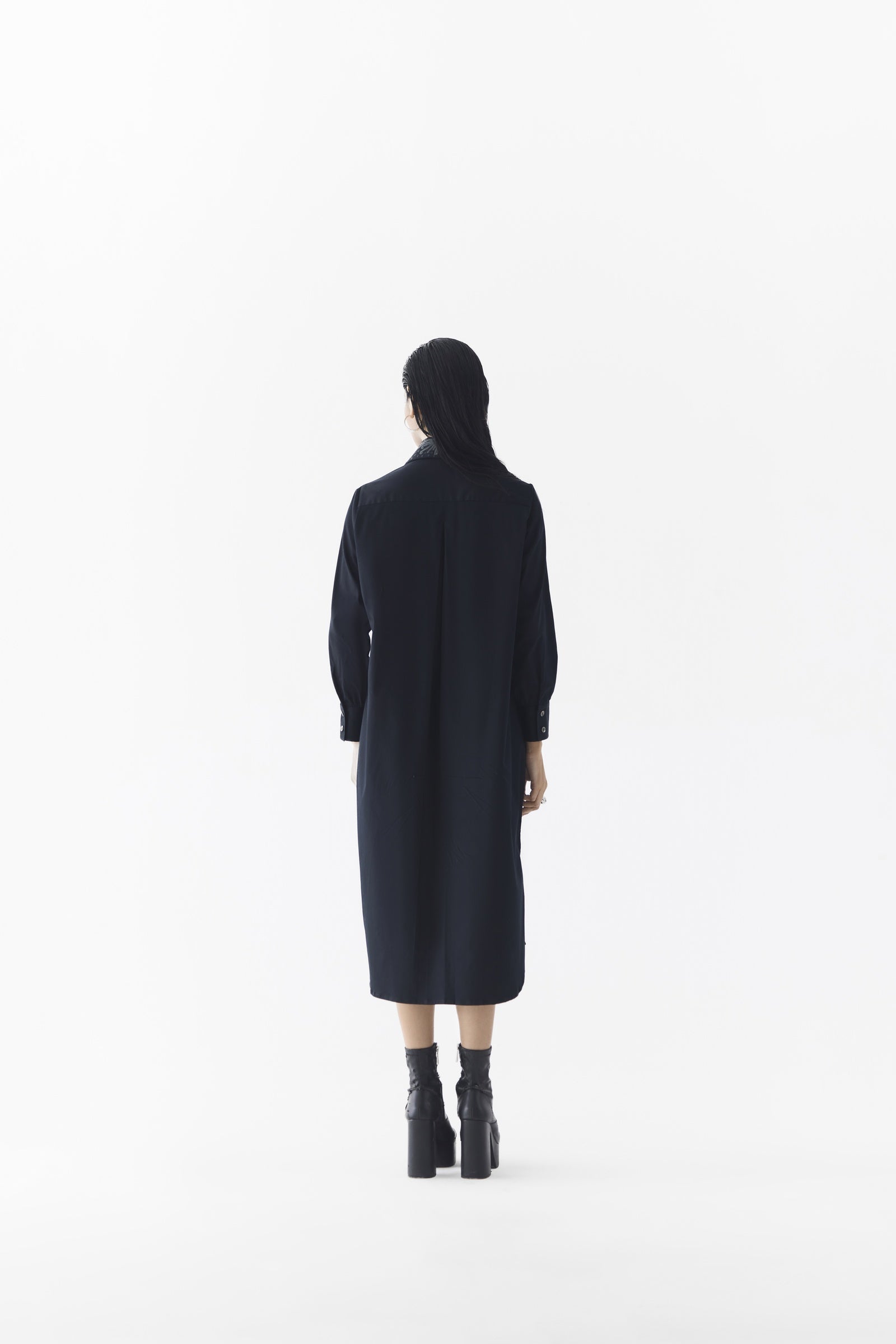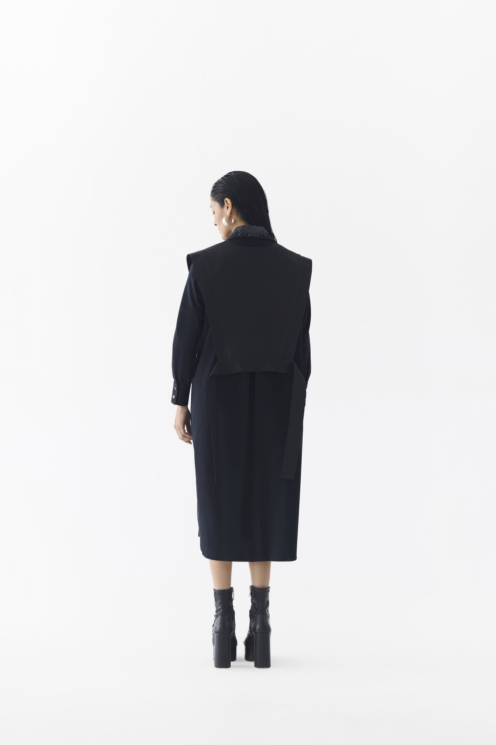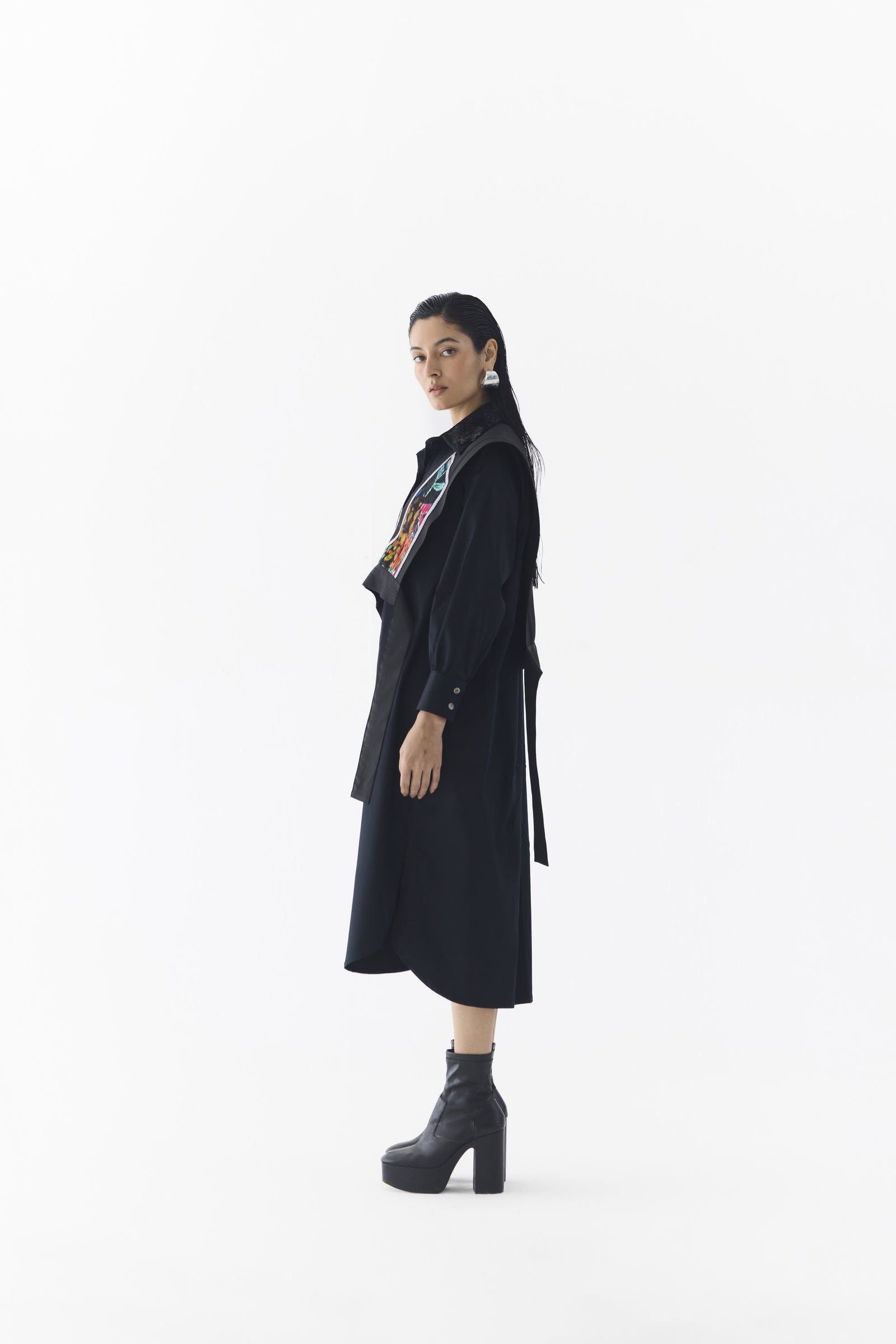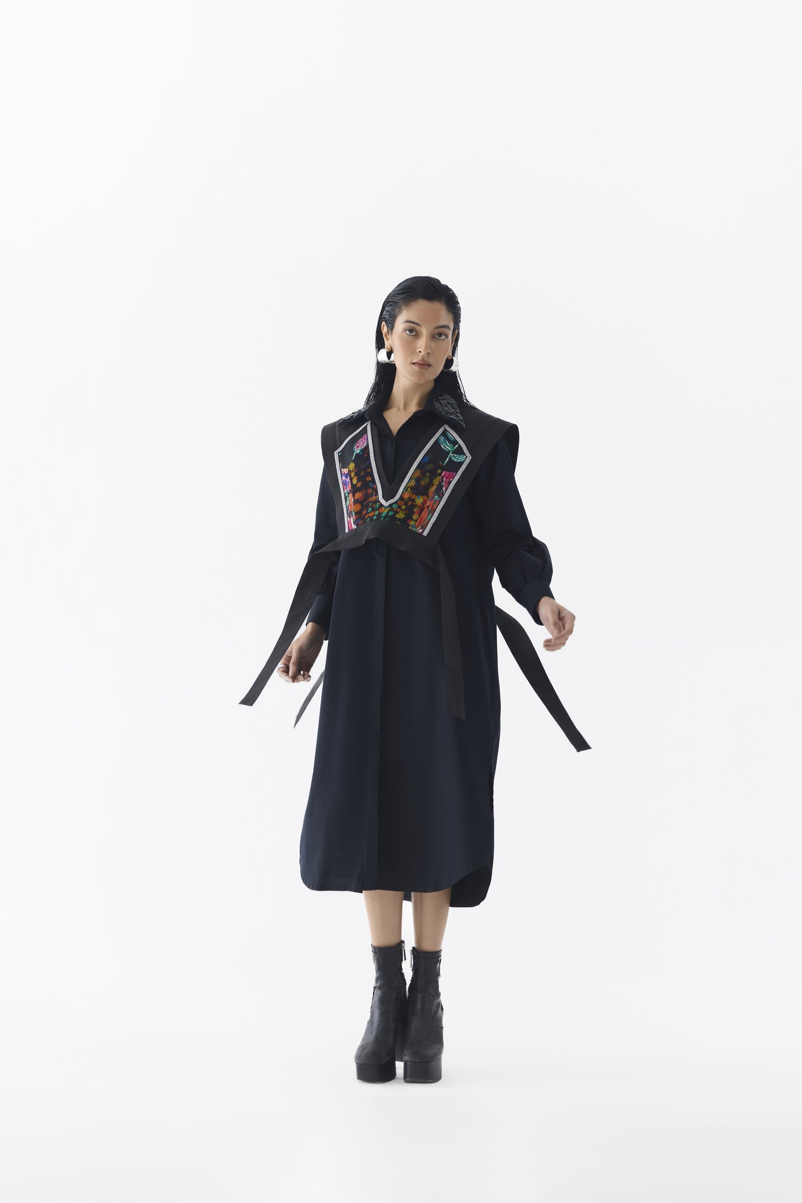 The Calla Shirt Dress with Multi Vest, crafted from stunning trans-seasonal poplin, is a statement piece featuring a boxy silhouette with a front opening, an embroidered sequin collar, and a V-neckline, complemented by a removable patchwork vest layered on top, creating an elegant look when styled with heels; the model is wearing a size M and is 5'8".