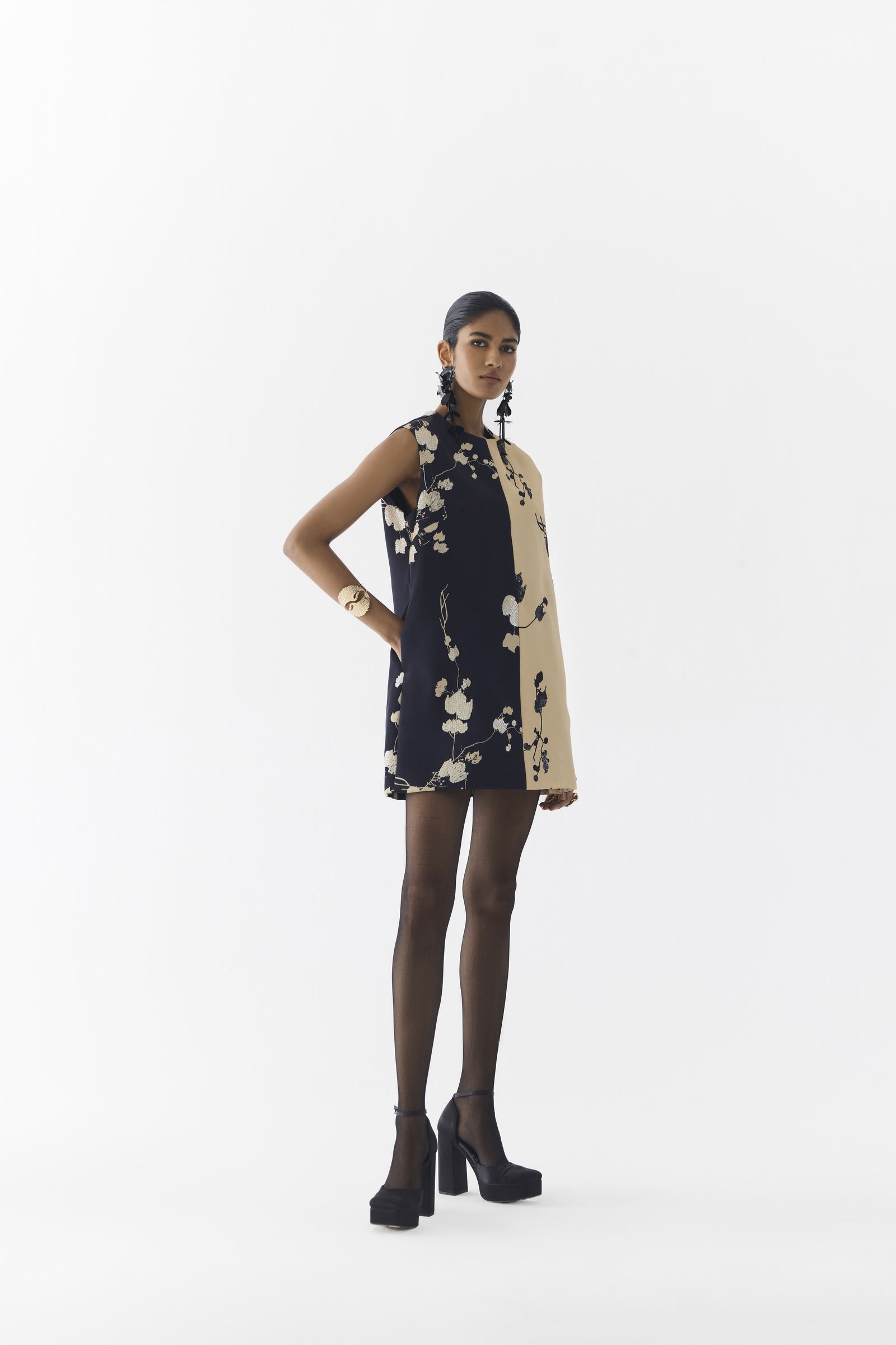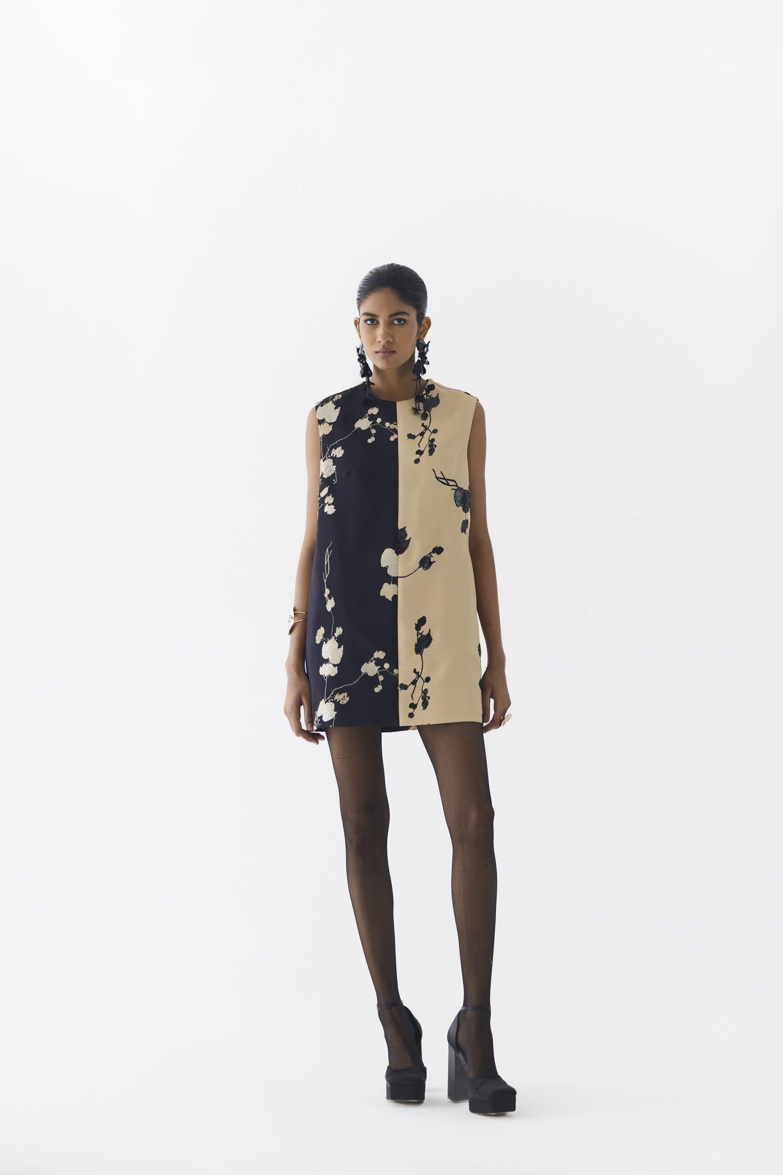 The Sakura Half and Half Dress, crafted from stunning trans-seasonal vegan silk, is a statement mini shift dress featuring a straight fit with a half-and-half sakura flower print in cream and black, sequin-embroidered tonal flowers throughout, a centre back zipper, lining, and pockets, making it an elegant choice when styled with heels; the model is wearing a size S and is 5'10".