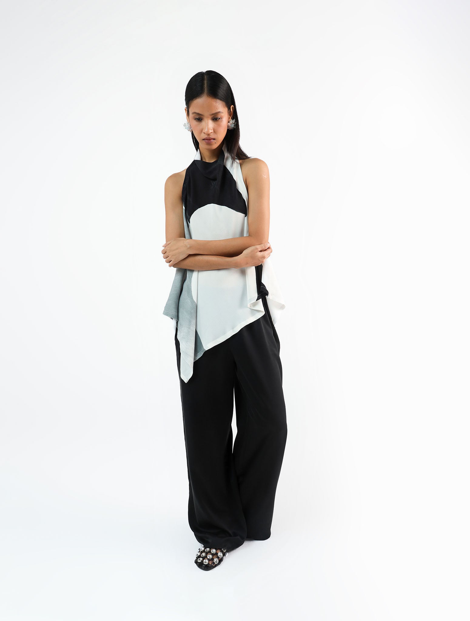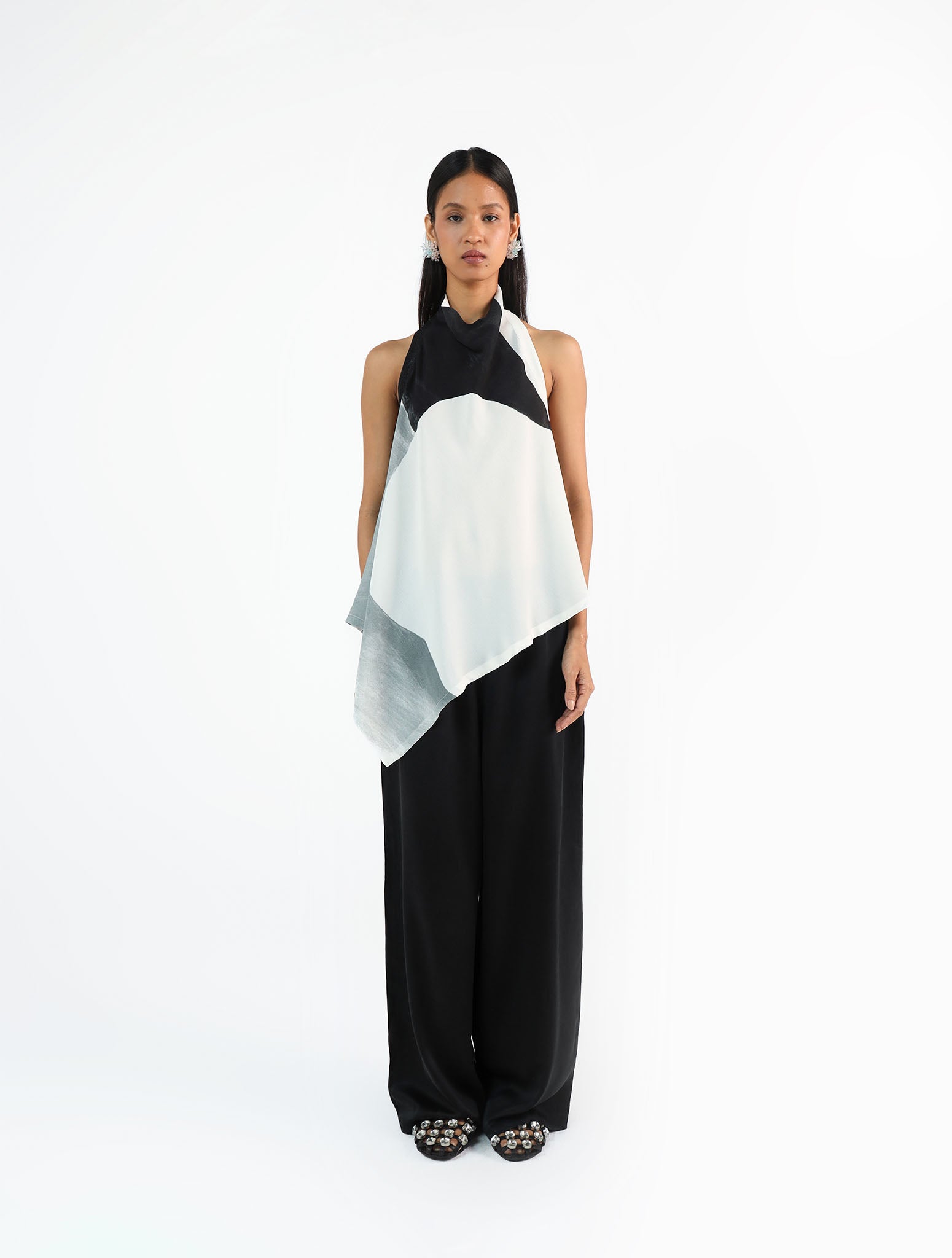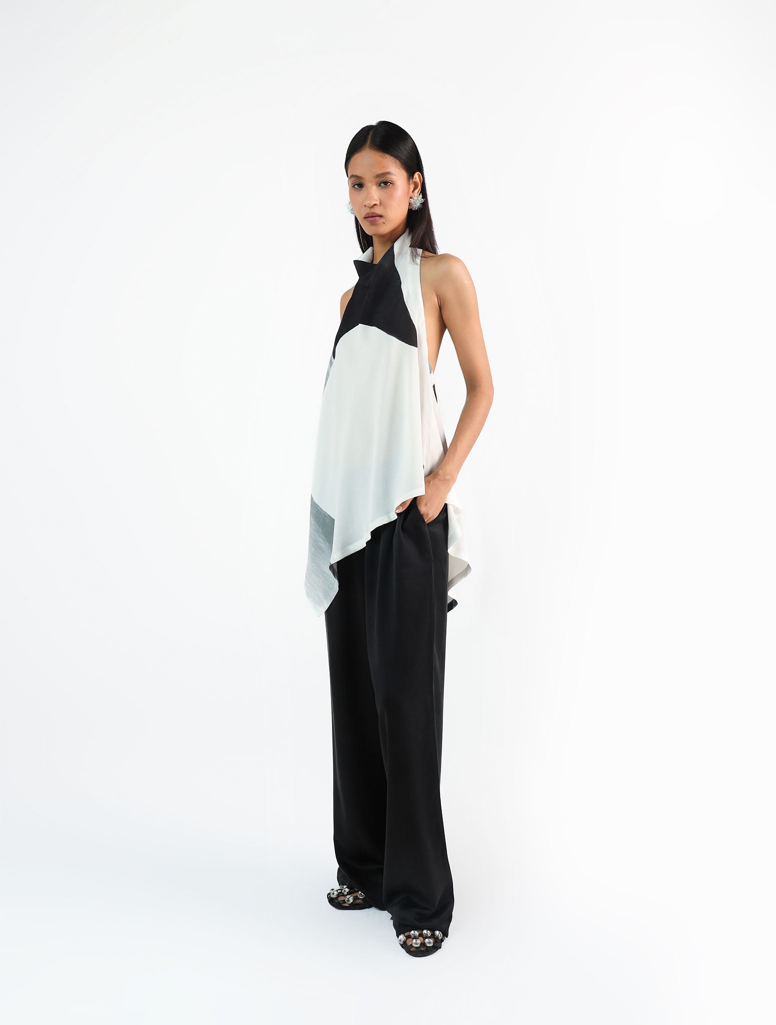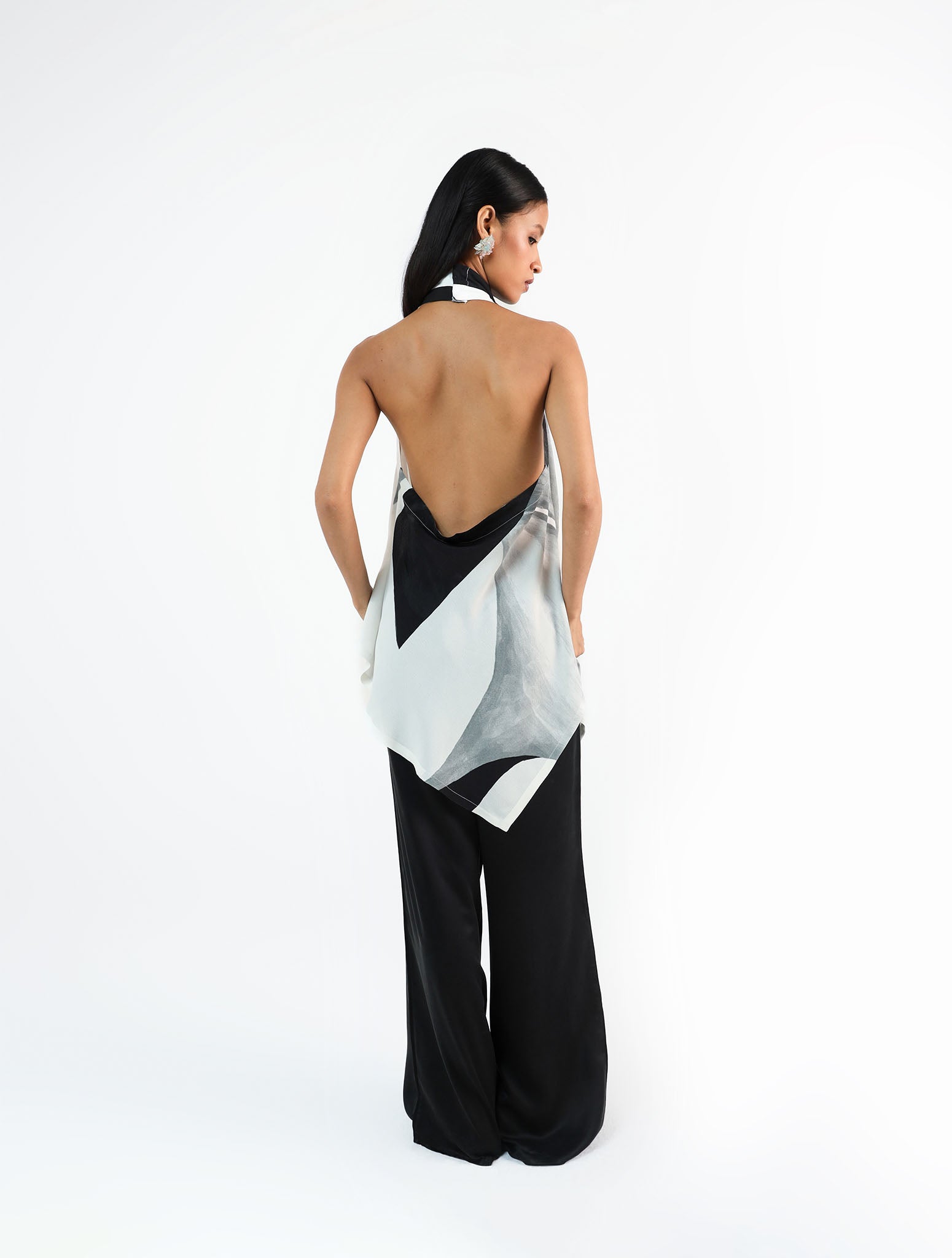 Pure Crepe, hand-painted in a bold black-and-white abstract print. The halter-neck top falls in a relaxed silhouette with a low back and tie detail. As each piece is hand-painted, prints may vary slightly with every piece.