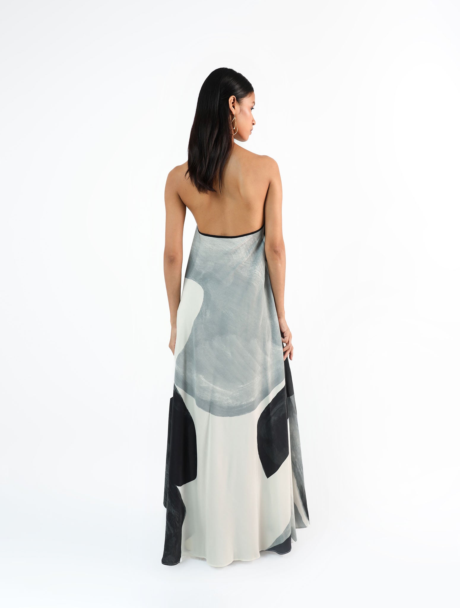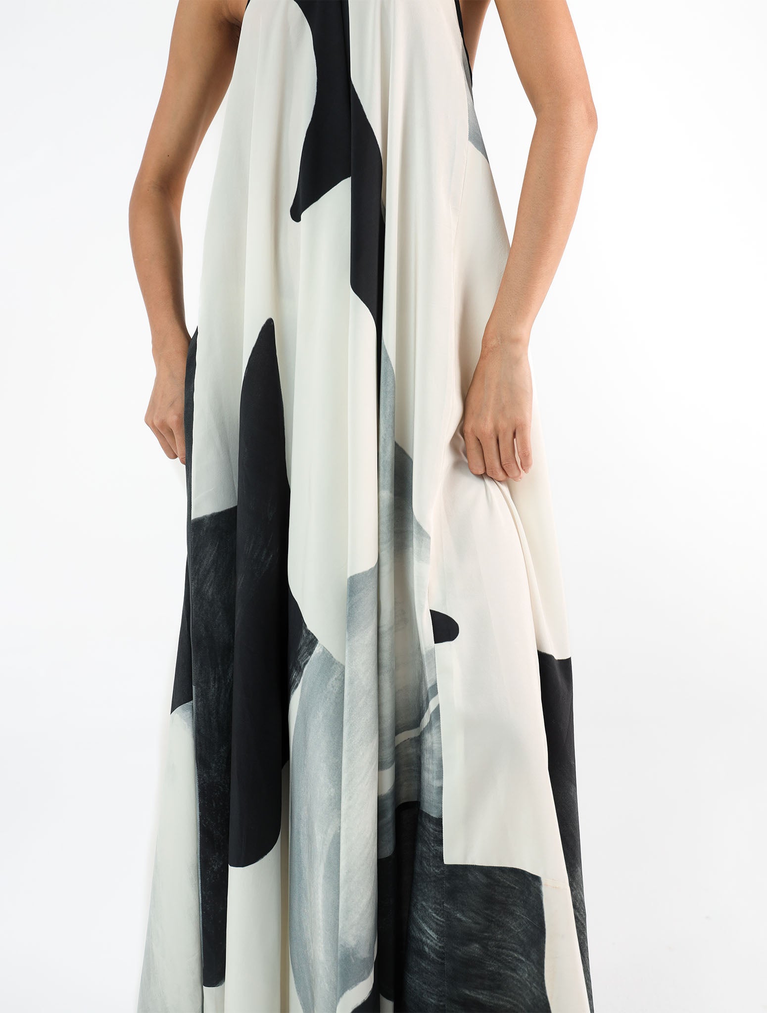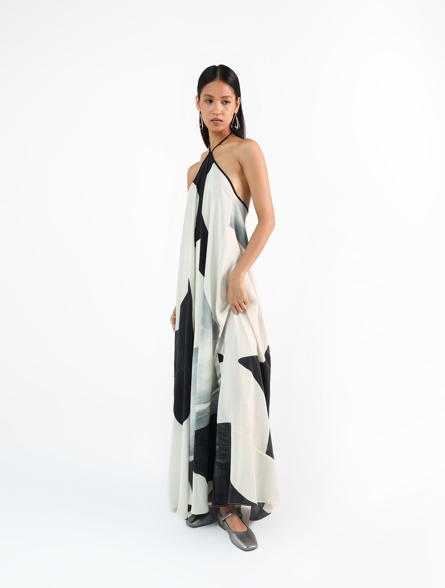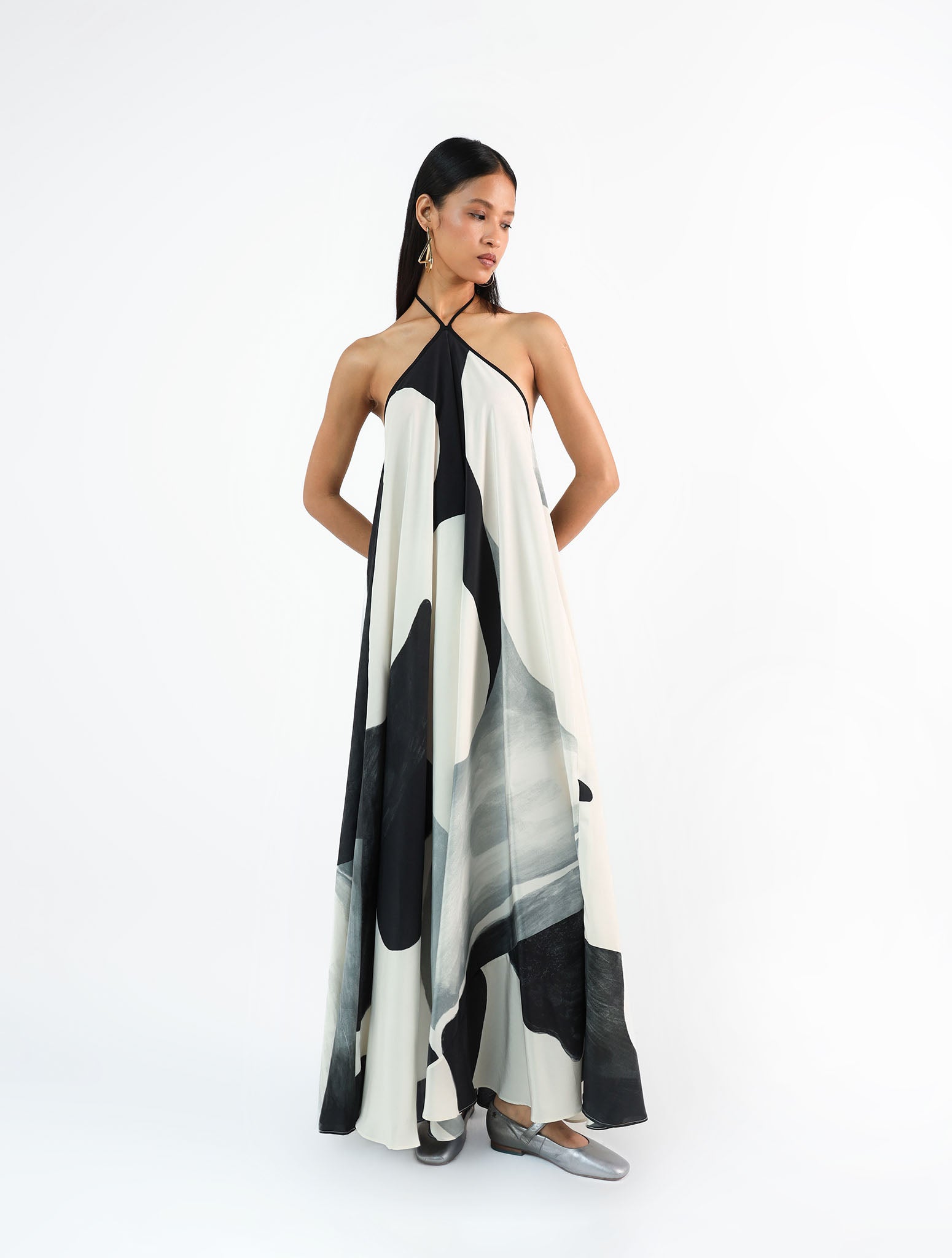 Pure Crepe, hand-painted in a bold black-and-white abstract print. The halter-neck maxi dress is cut in a relaxed silhouette, finished with an open low back and tie detail. Prints may differ slightly with each piece.