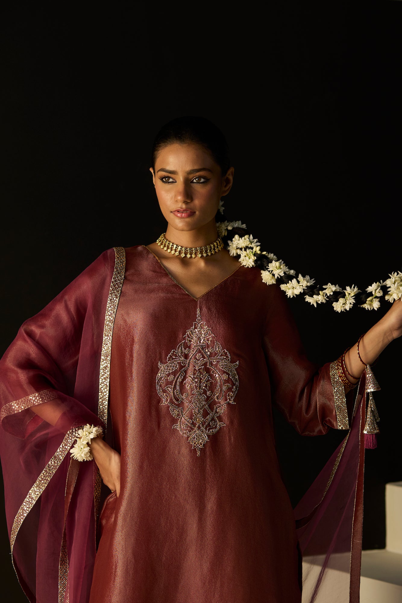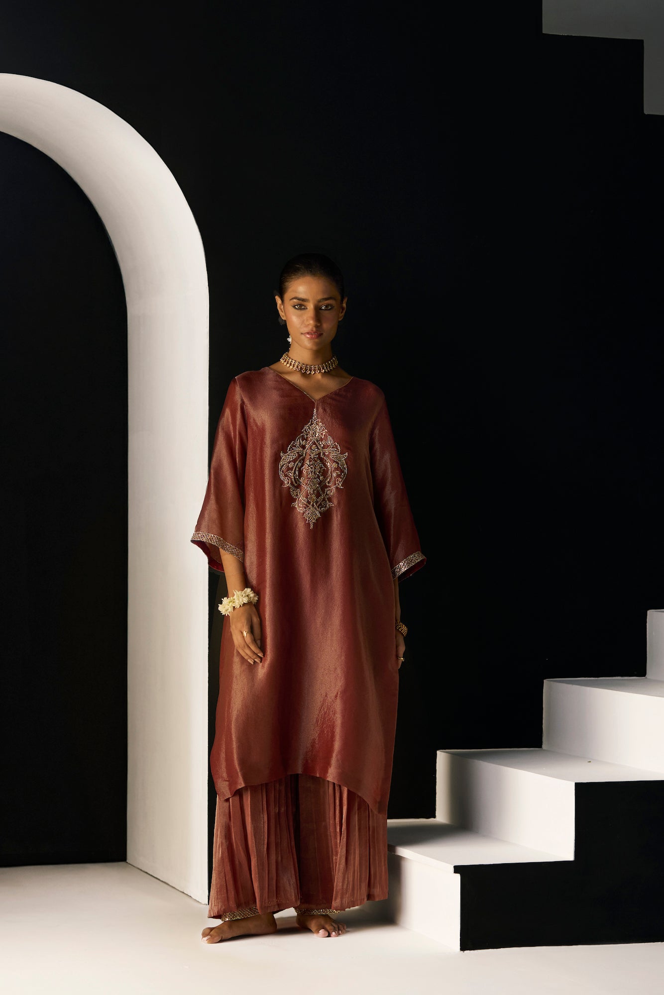 The Rust Sana Suit is a relaxed kurta set crafted in rich silk blends adorned with hand embroidery. The earthy rust shade enhances its handcrafted elegance, celebrating traditional artistry in a modern silhouette
