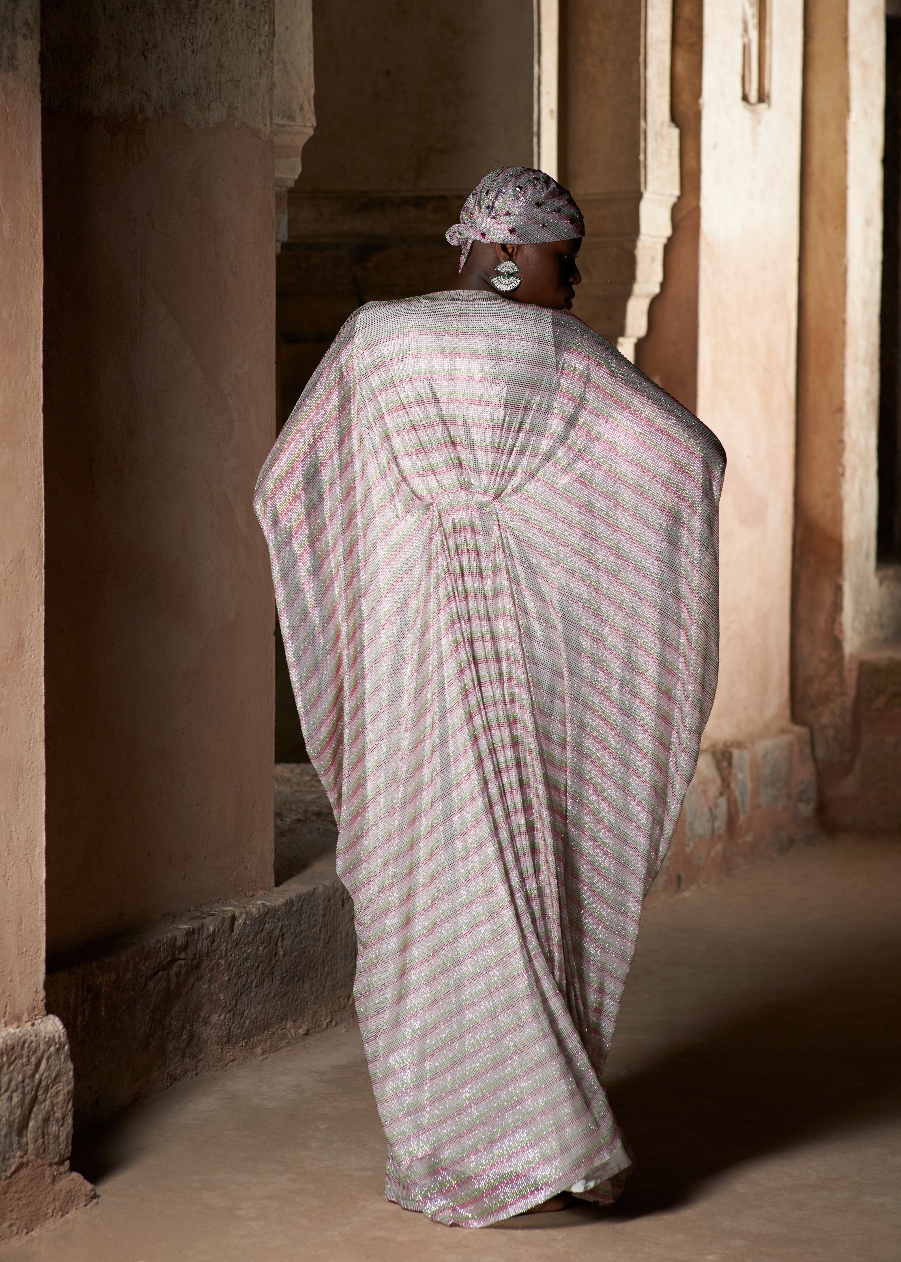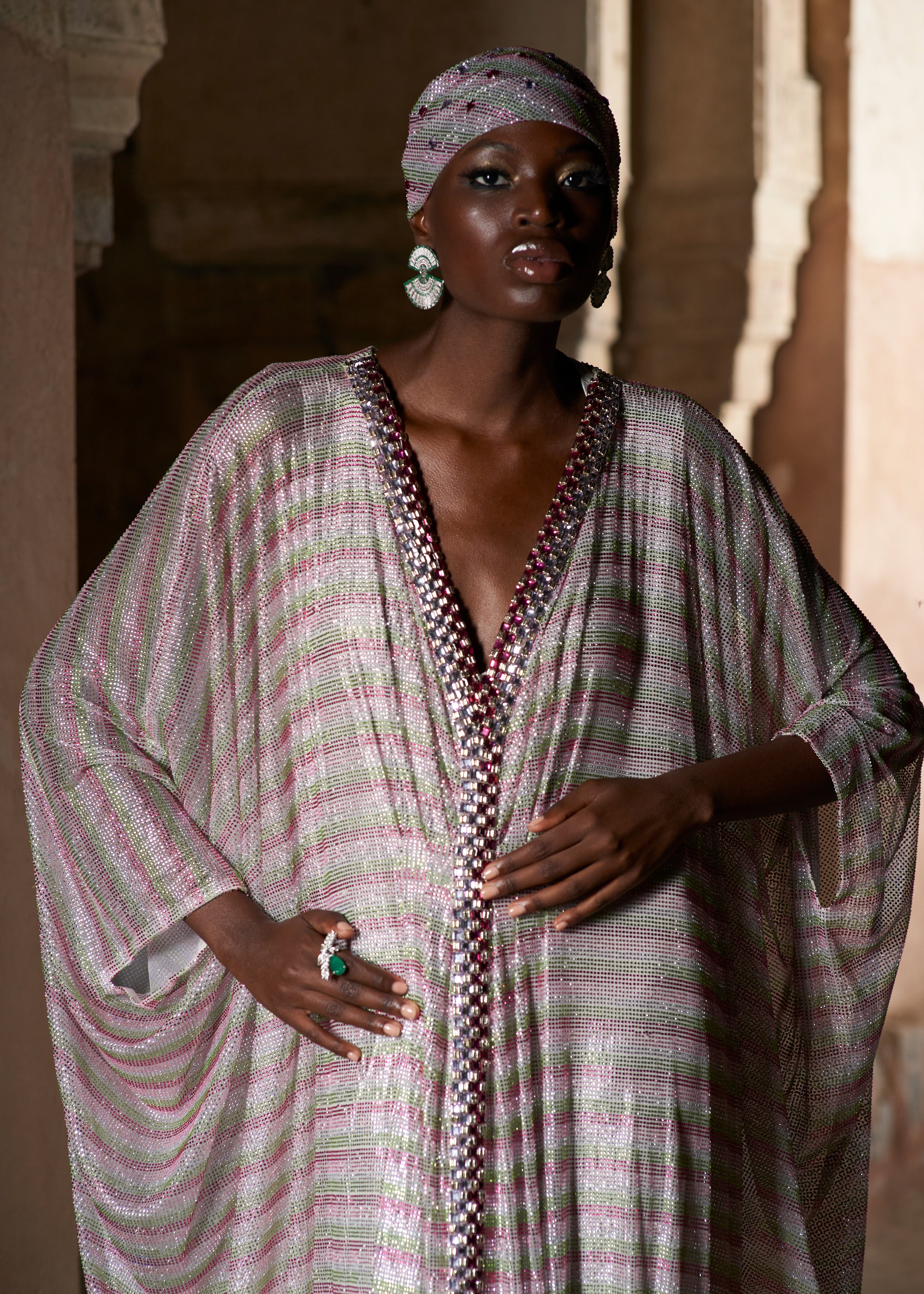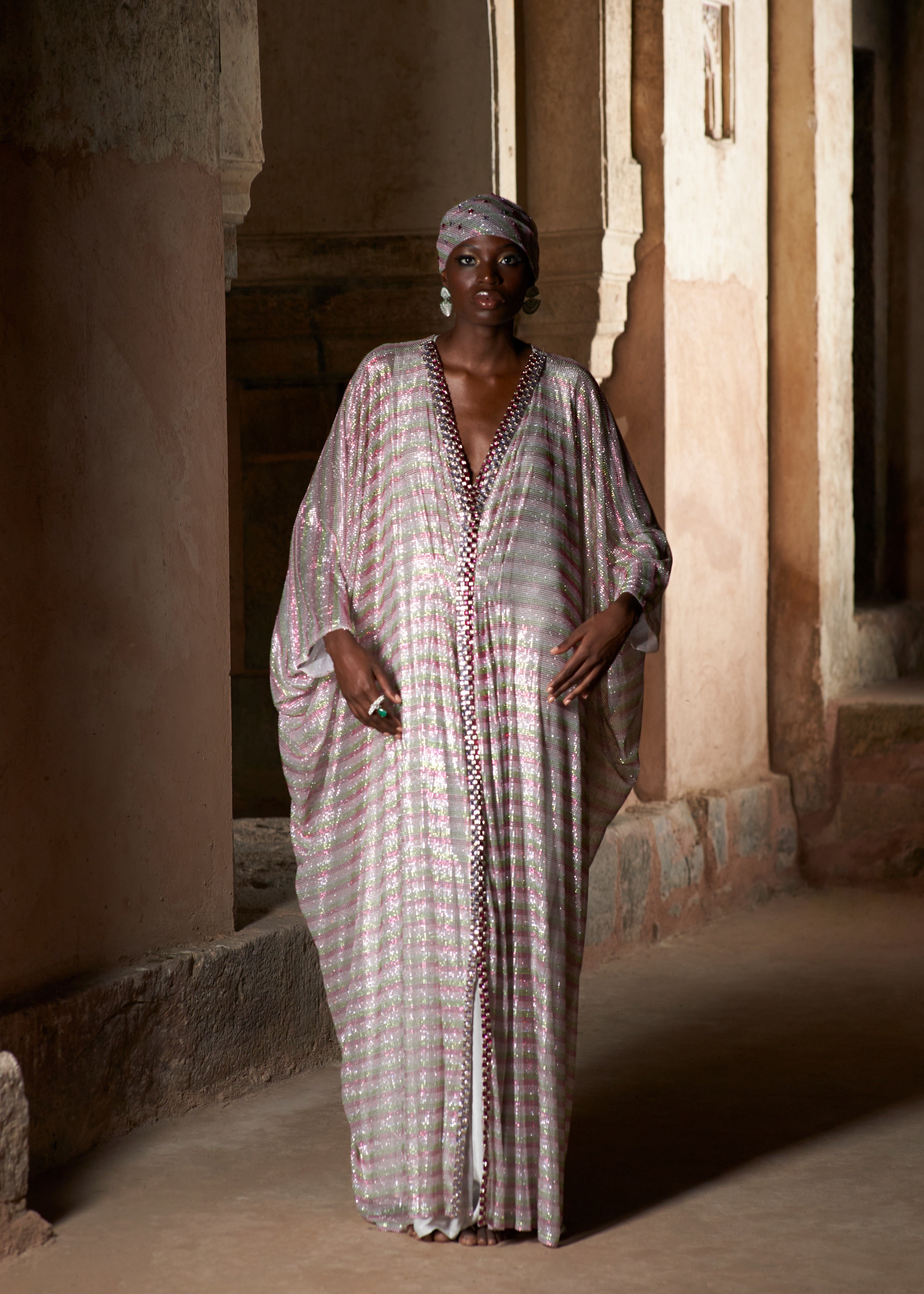 Dark and light pink, and light green print, crystal embellished striped full-length kaftan with a crepe slip along with a matching headgear accessory. All our pieces are handcrafted, so slight variations in color or detailing may occur, making each outfit unique.