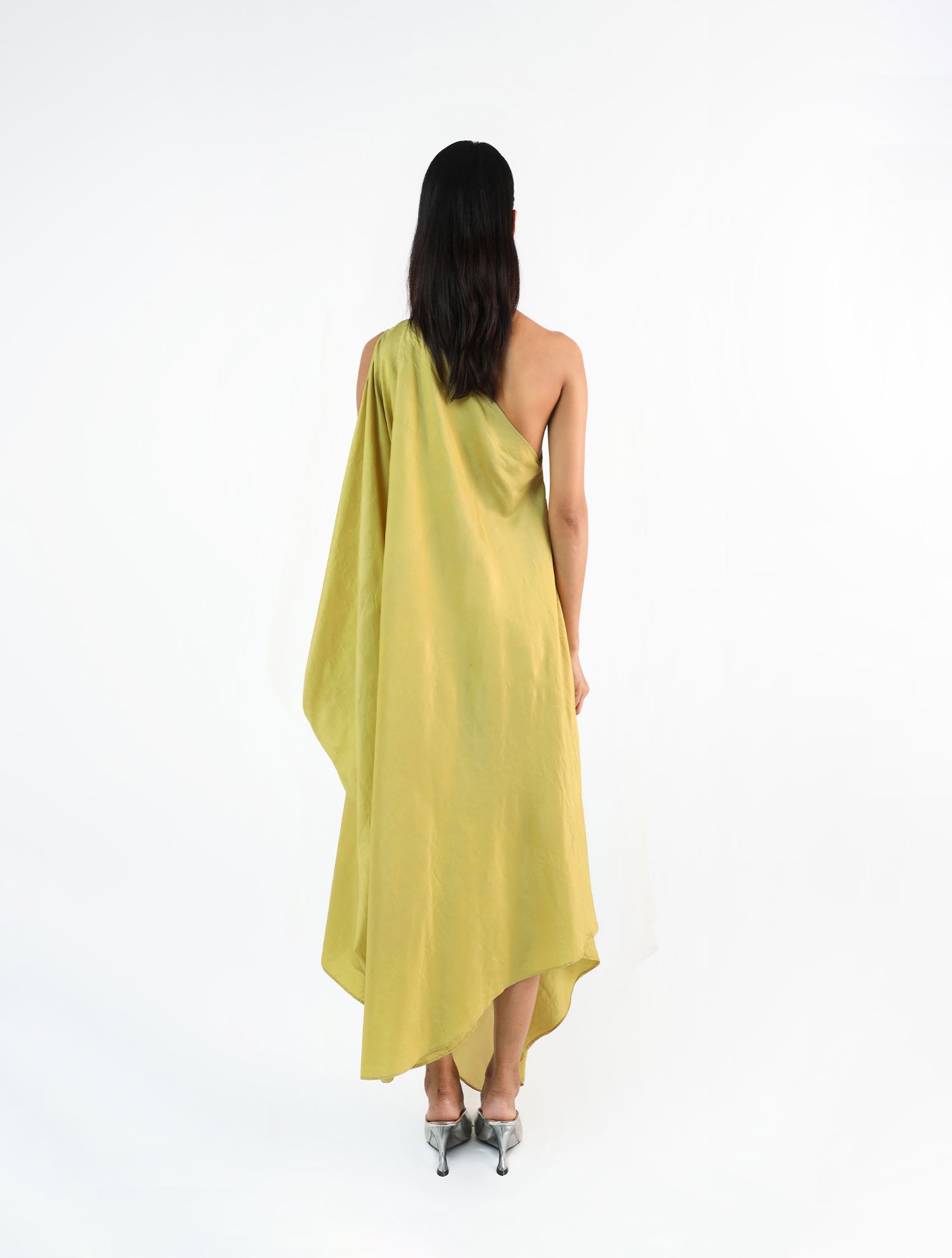 Crafted in lightweight Pure Silk, this fluid one-shoulder dress in yellow-green drapes with an elegant cowl detail along the side. The uneven hem adds sculptural movement, while a beaded fabric belt transforms the silhouette for a distinct look.
