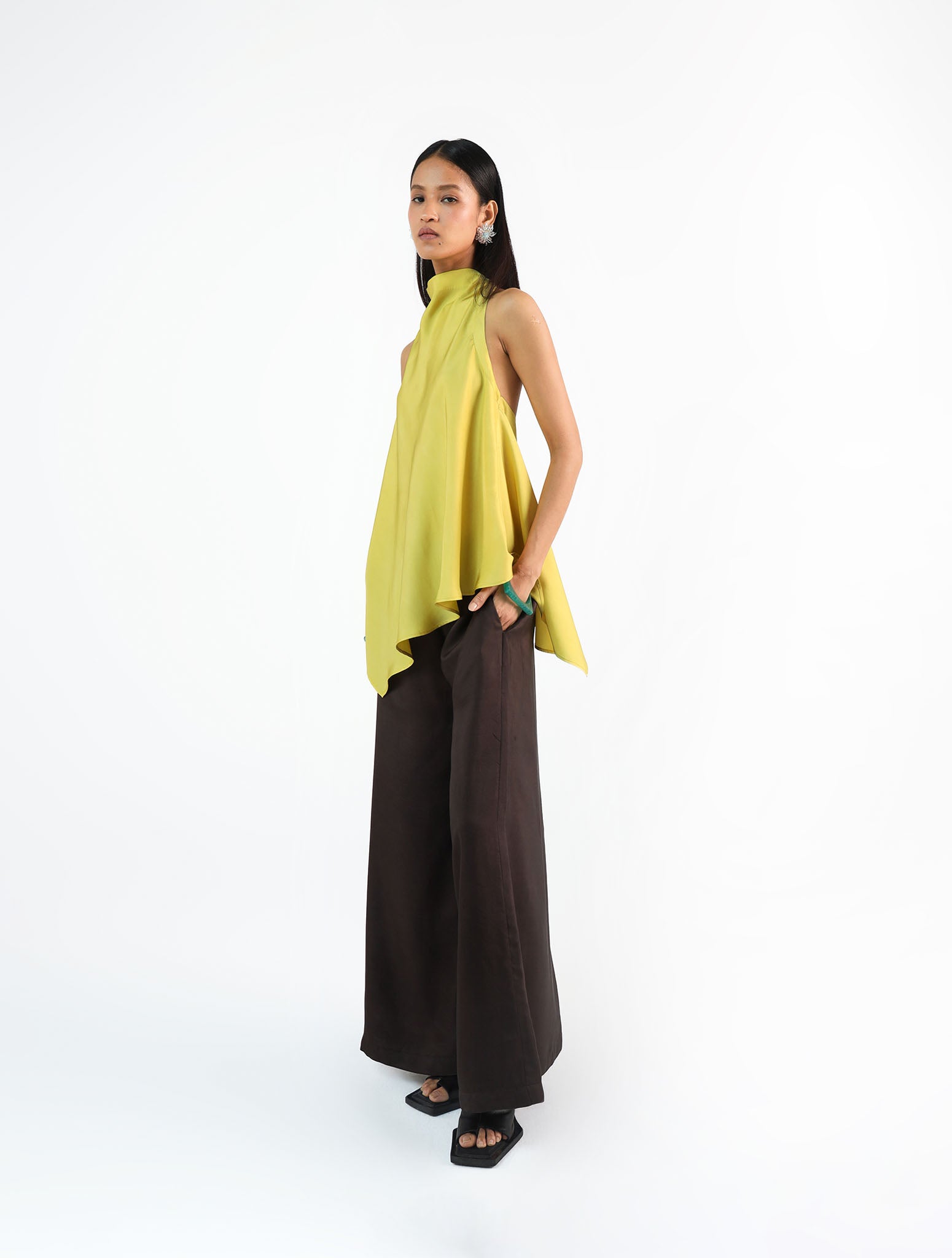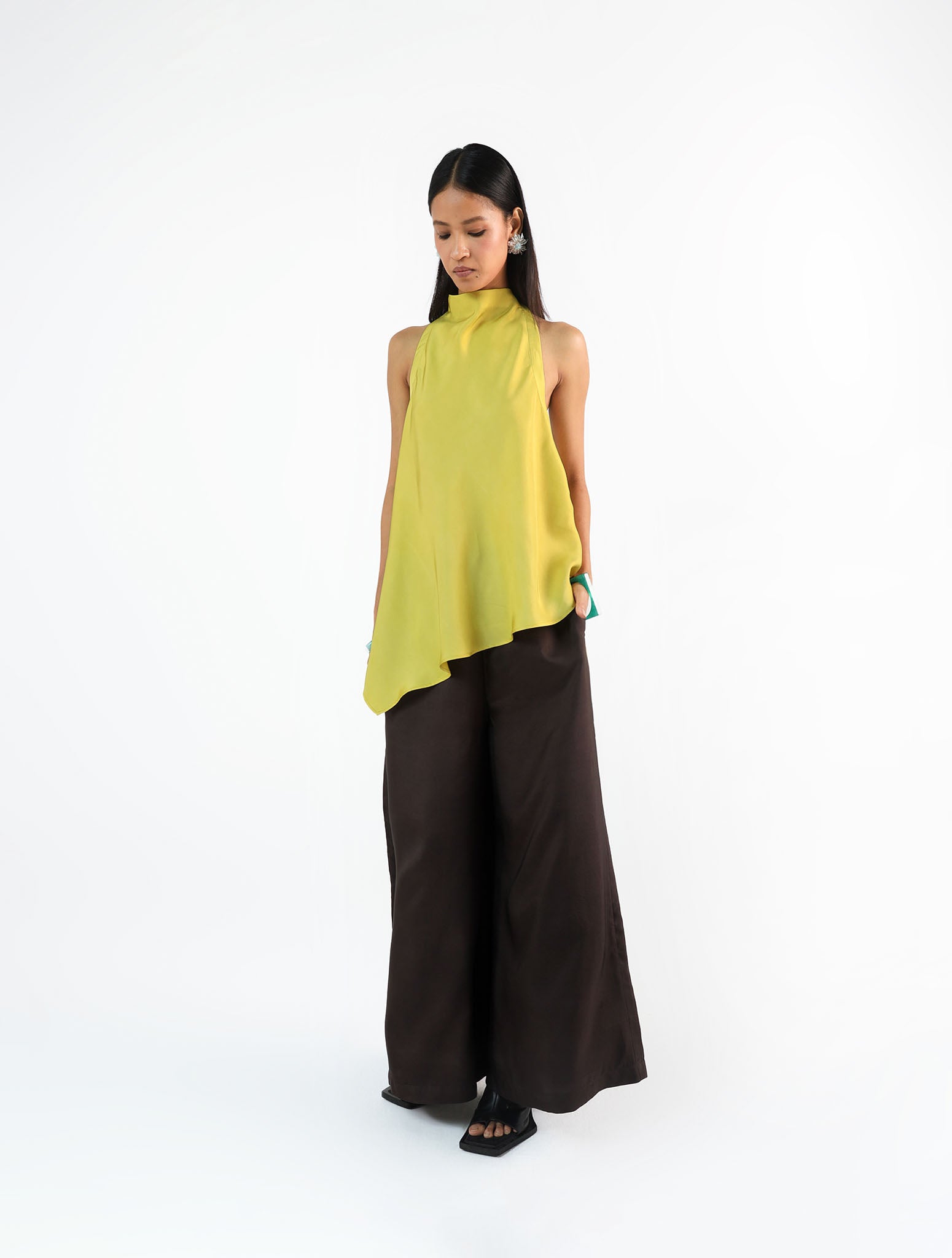Silk Twill in yellow-green. A halter neck with a back tie, cut with an asymmetrical hem. Relaxed and fluid - made to move with ease. As each piece is handcrafted, slight variations enhance its unique character.