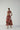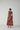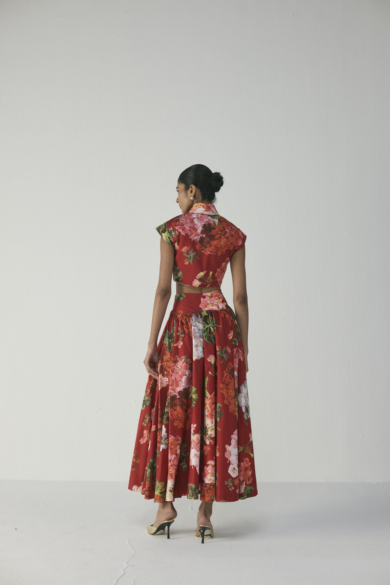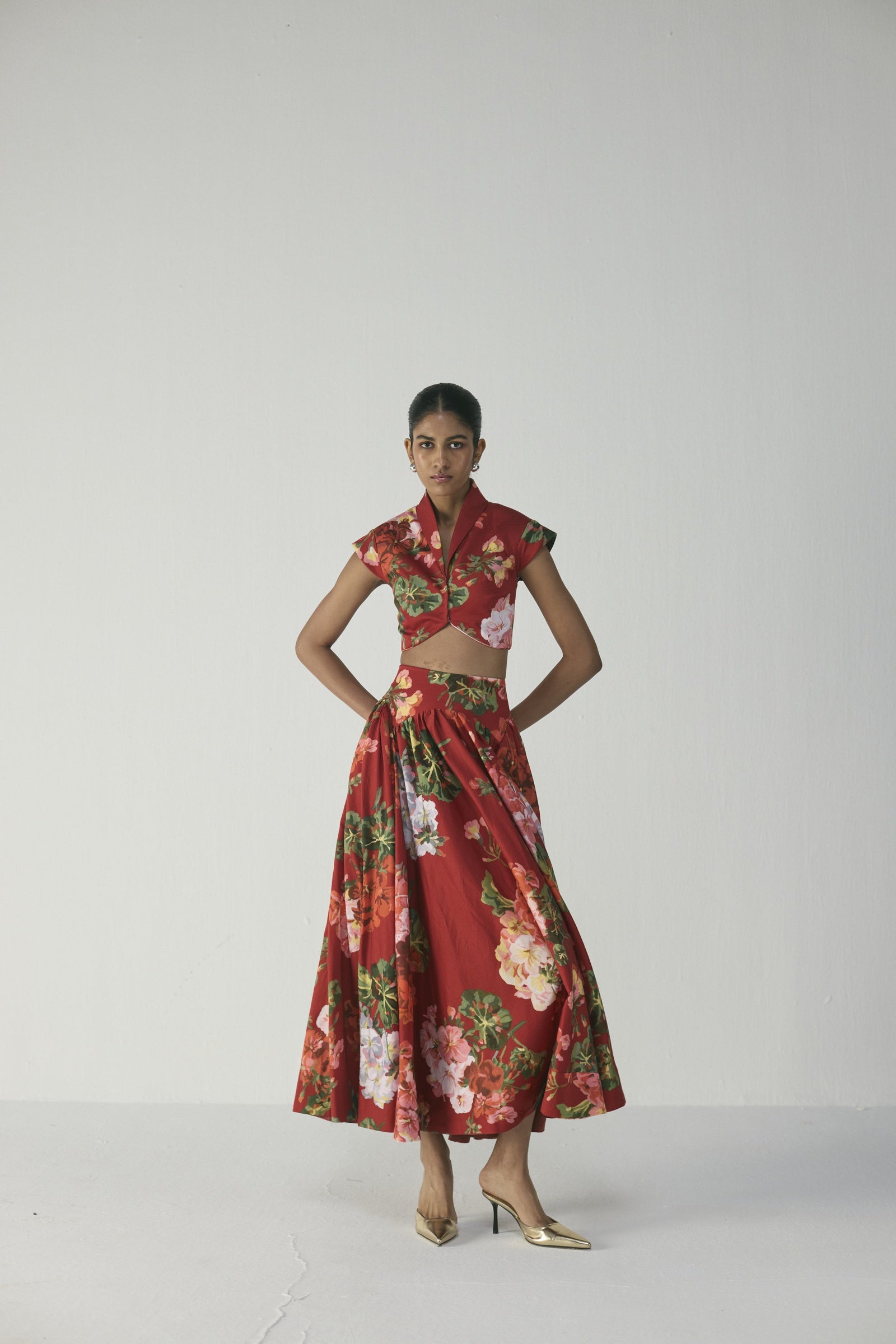 This two-piece ensemble features a structured cropped top with a sculpted collar, cap sleeves, and a V-shaped under-bust cutout, paired with a high-waisted, full-length, voluminous skirt, all adorned in a vibrant painterly floral print of pink, lilac, coral, and green on a rich red base, crafted in lightweight, breathable fabric for effortless movement and a bold yet romantic silhouette—perfect for festive occasions, formal summer events, or stylish daytime gatherings; the model is 5'9" and wearing a size small.