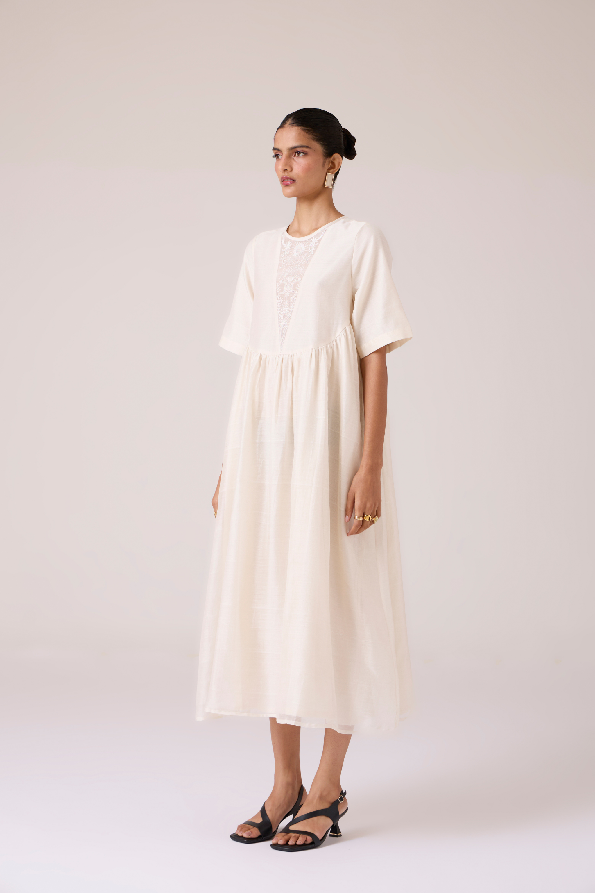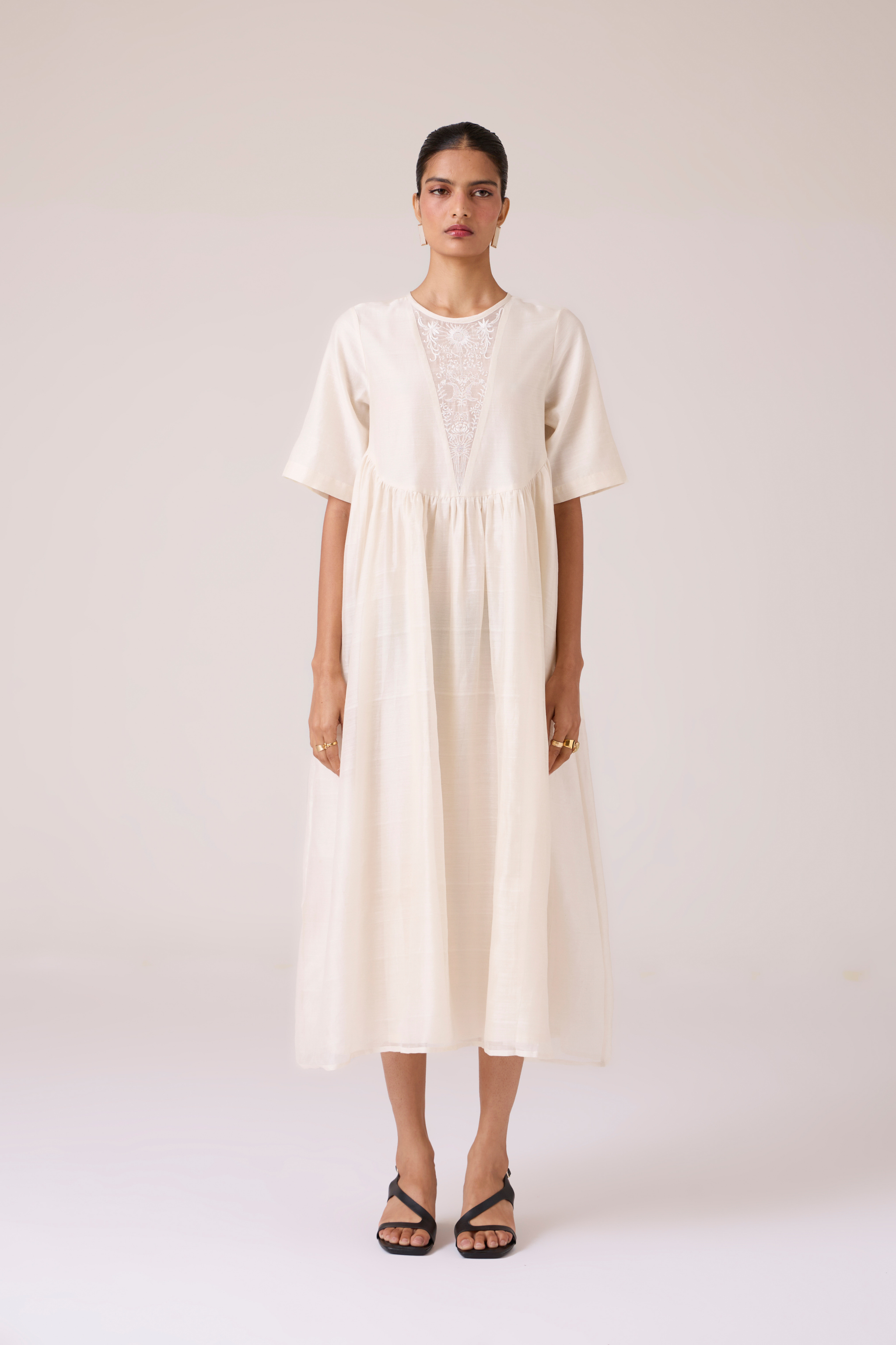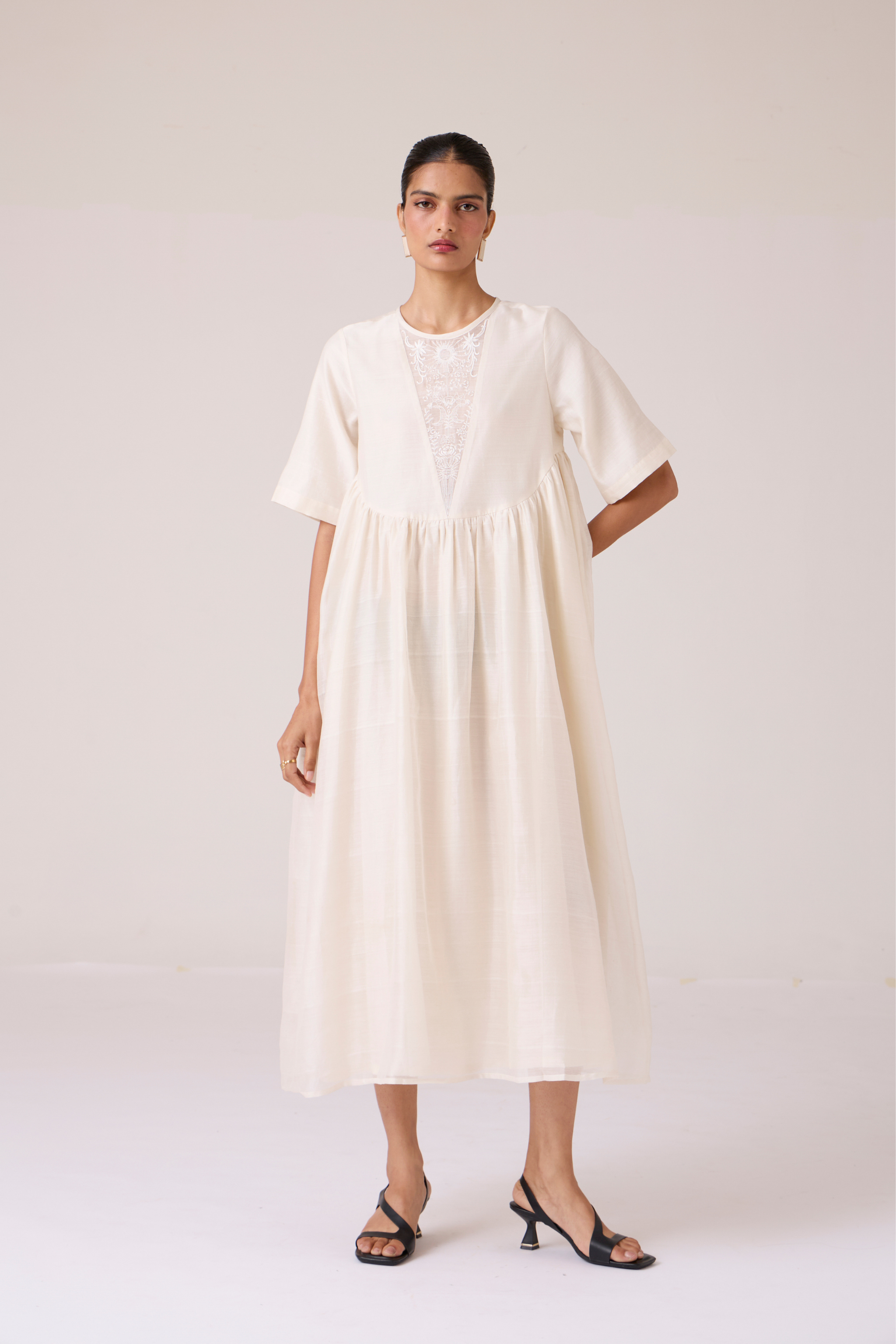 This dress makes ease monumental. Crafted from handwoven Chanderi with natural sheen and translucence, it features an embroidered sheer V-panel at the neckline, crafted by hand. The curved yoke and generous flare create a study in lightness with presence. A rouleau button fastening at the back provides secure closure, while functional inseam pockets are incorporated into the side seams. Fully lined for structure and comfort, the dress carries slight variations in embroidery that reflect its artisanal work.