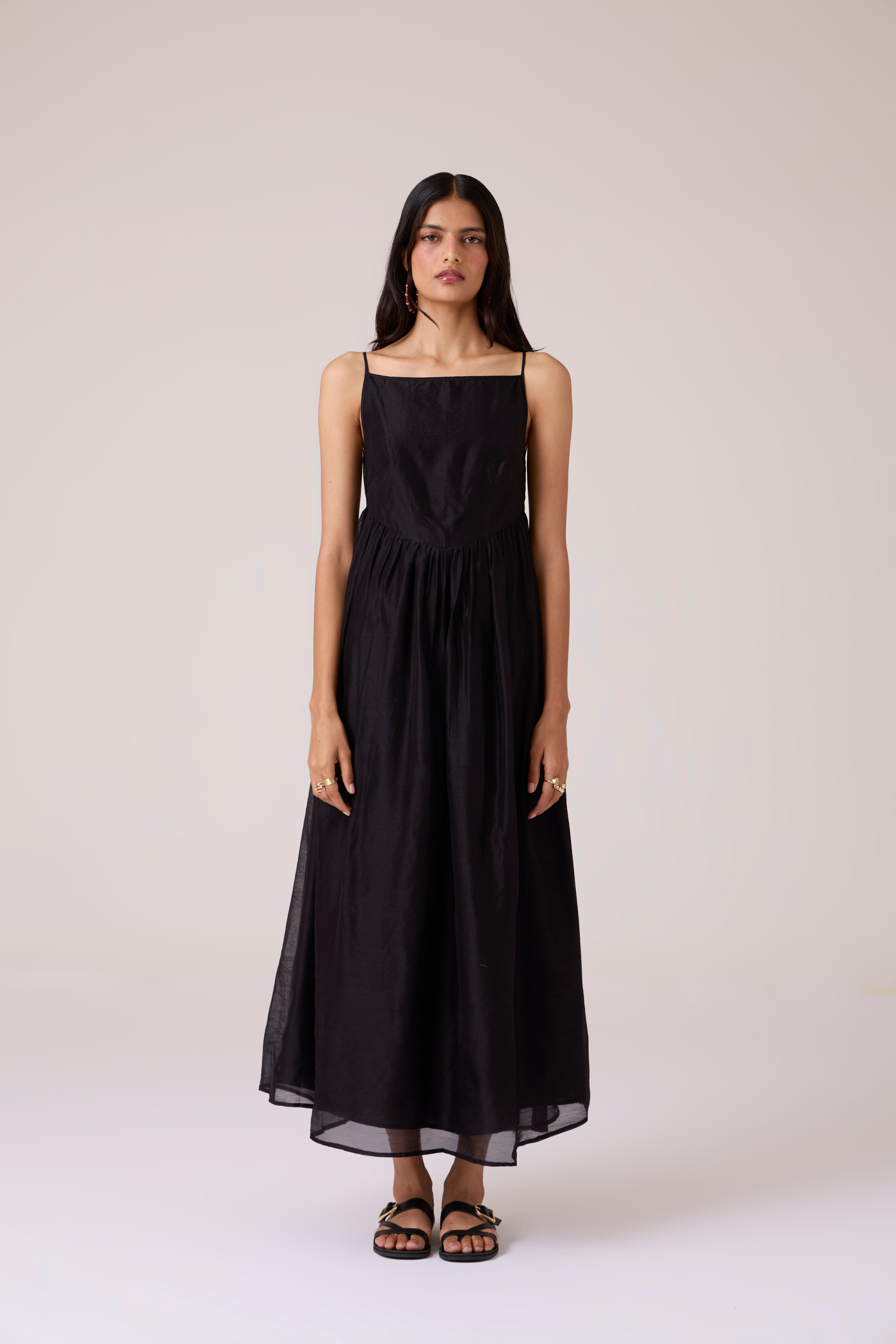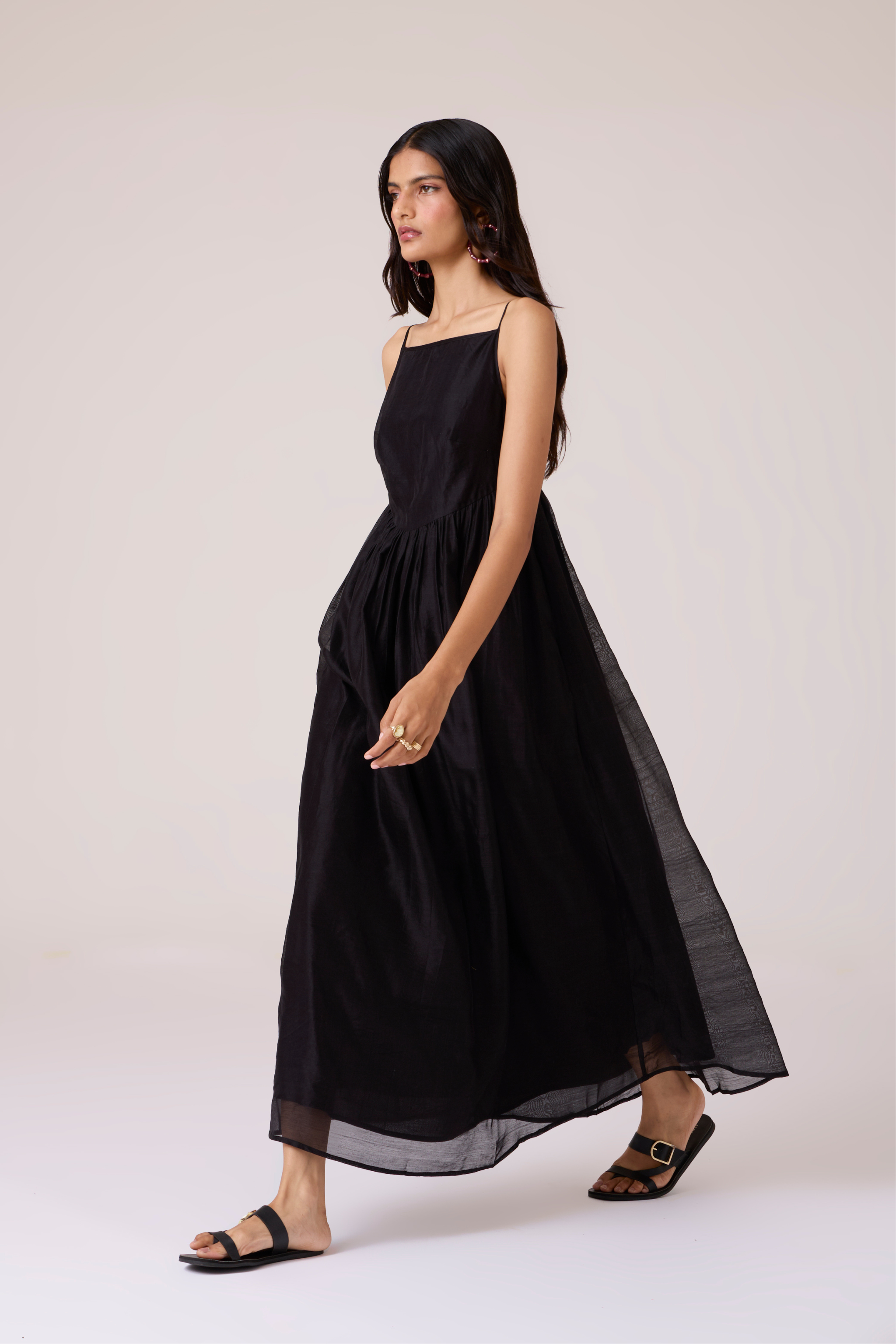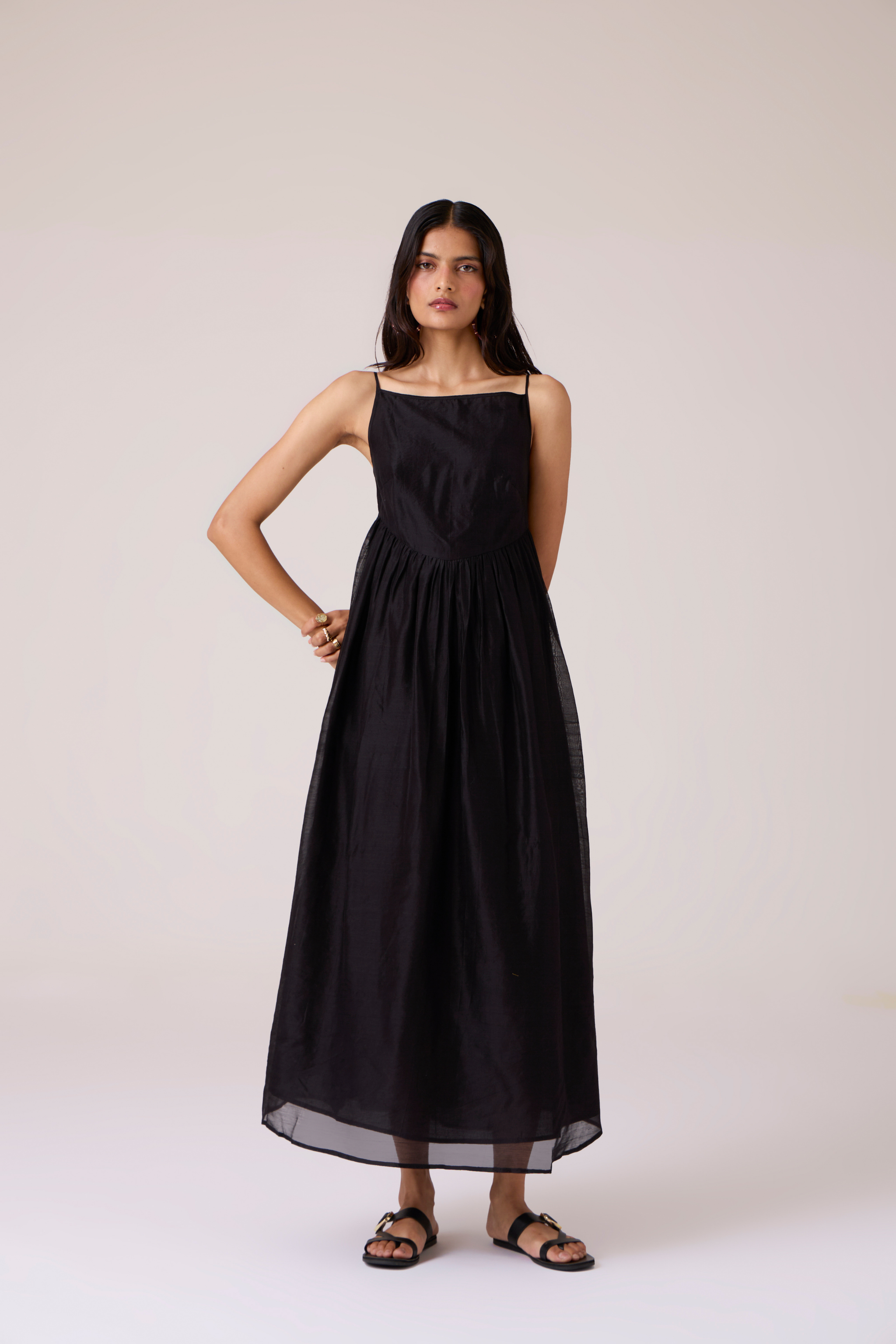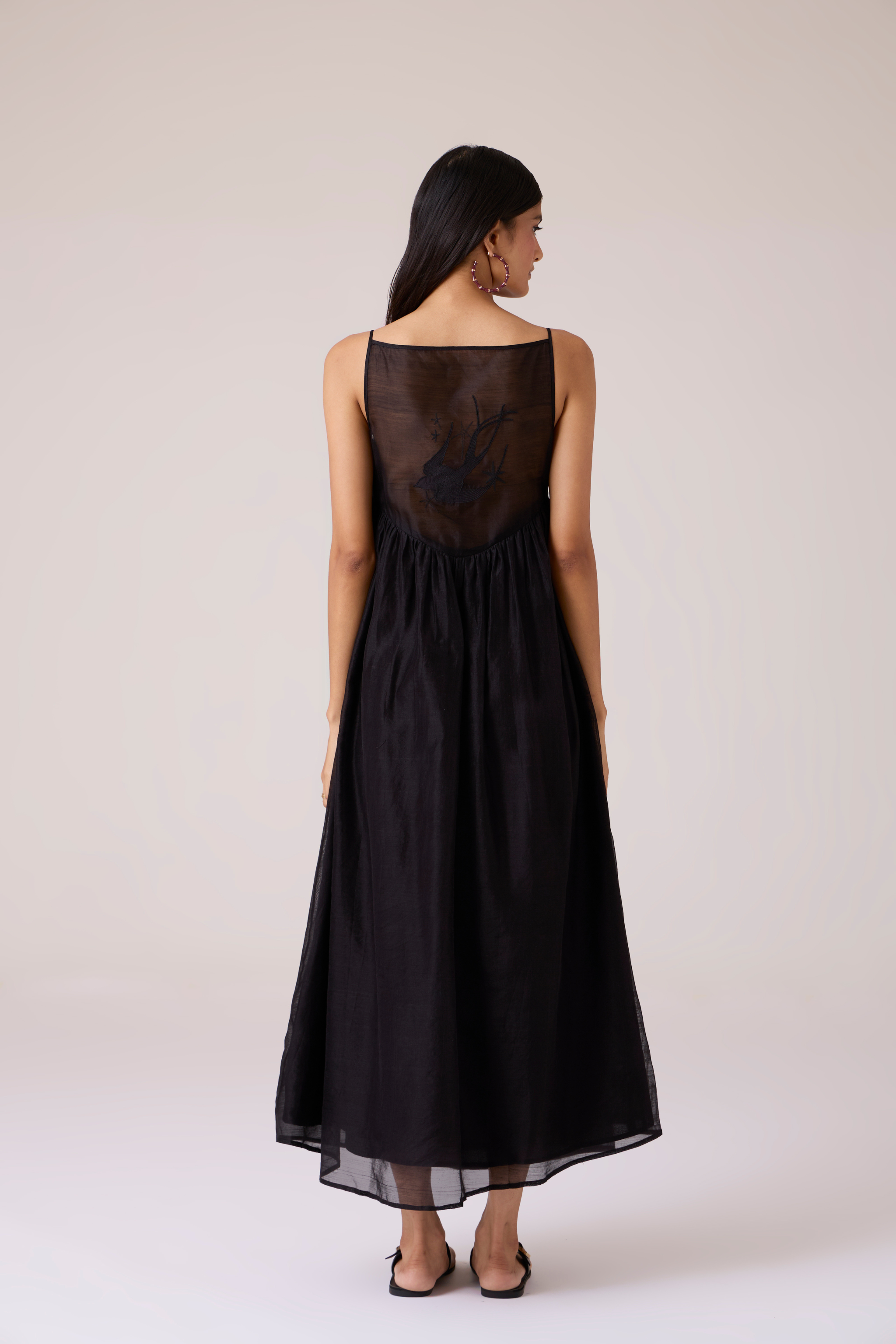 This dress presents a full-bodied silhouette tempered by delicate detail. Crafted from handwoven Chanderi with supple drape, it features an embroidered sheer back yoke appliqued by hand. The fitted bodice transitions into an expansive flared hemline, creating fluid movement with resolute construction. Inseam pockets are integrated into the seams, and a concealed side zip fastening ensures clean lines. Subtle irregularities in the embroidery confirm its hand origin, adding character to each piece.